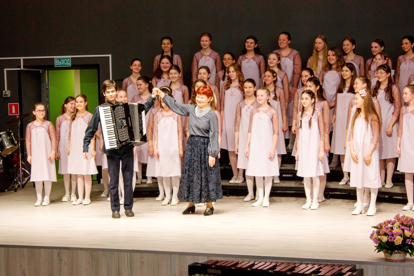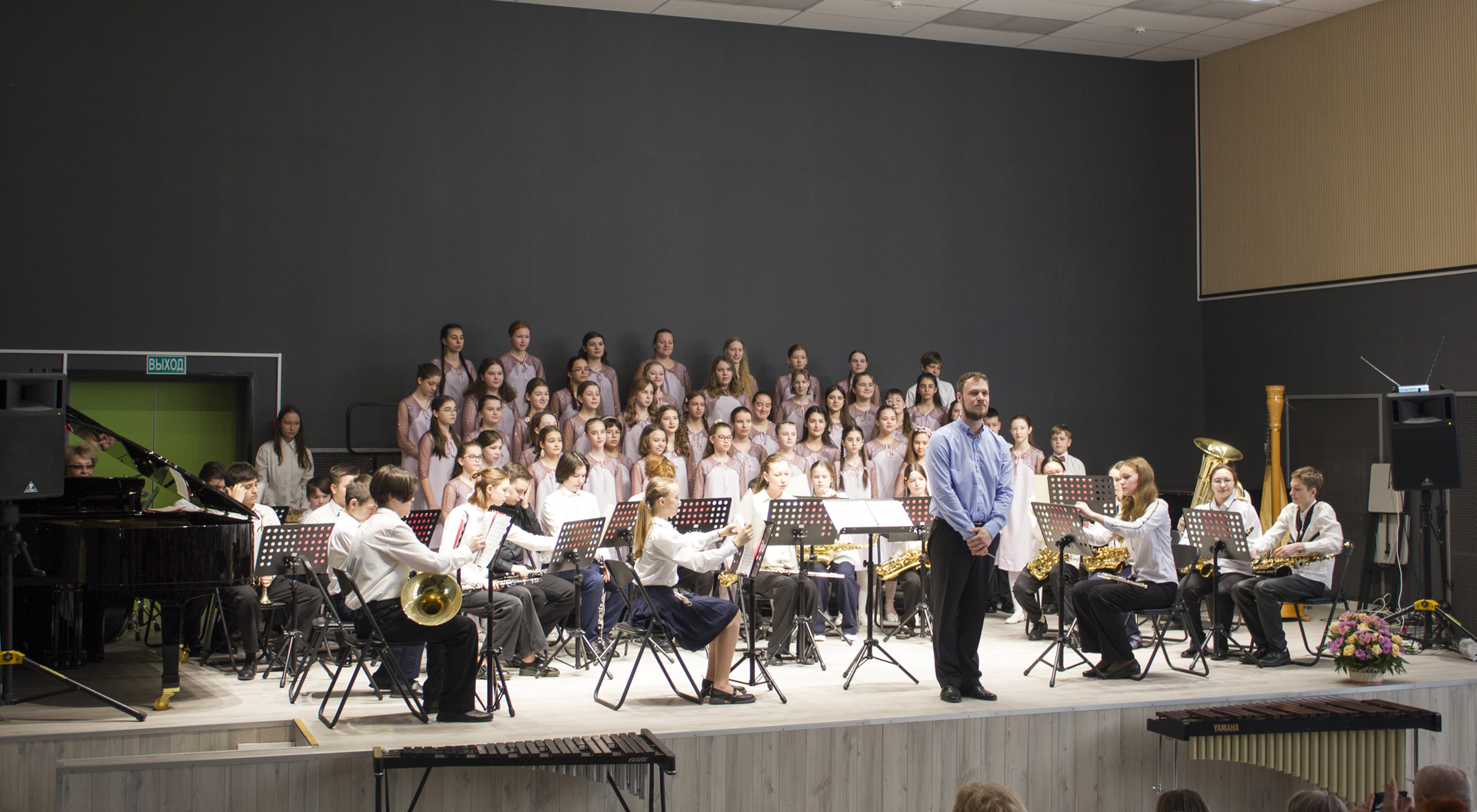Юбилейный концерт мы приурочили сразу к двум датам – 55-летию школы и 80-летию Великой Победы. Поэтому патриотические композиции занимали важное место в драматургии мероприятия. Завершился концерт поистине грандиозно: в исполнении сводного коллектива – оркестра духовых и ударных инструментов и хора «Созвучие» – прозвучала песня Степана Соснина «Вот что такое Победа» (дирижер – Ременев Евгений Ильич). Зал слушал стоя, вызывал на бис, у нас действительно получился праздник «со слезами на глазах».
