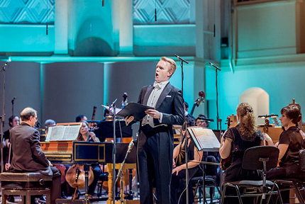 В составе оркестра особо выделяется крайне важная группа continuo: итальянка Тициана Аццоне (теорба), Станислав Грес (клавесин), Федор Строганов (орган-позитив) и Ольга Калинова (виолончель). Об аутентичности вокальной раскладки исполнения судить трудно. Ясно одно: ставка сделана на молодых. Все паломники – герои-травести: Агапит – сопрано Ноэми Сон (Швейцария), Эуджений – сопрано Анна Горбачёва, Теотим – меццо-сопрано Александра Раволь (Швейцария), Альбин – меццо-сопрано Мария Остроухова. В партии Провожатого – бас-баритон Морган Пирс (Австралия).