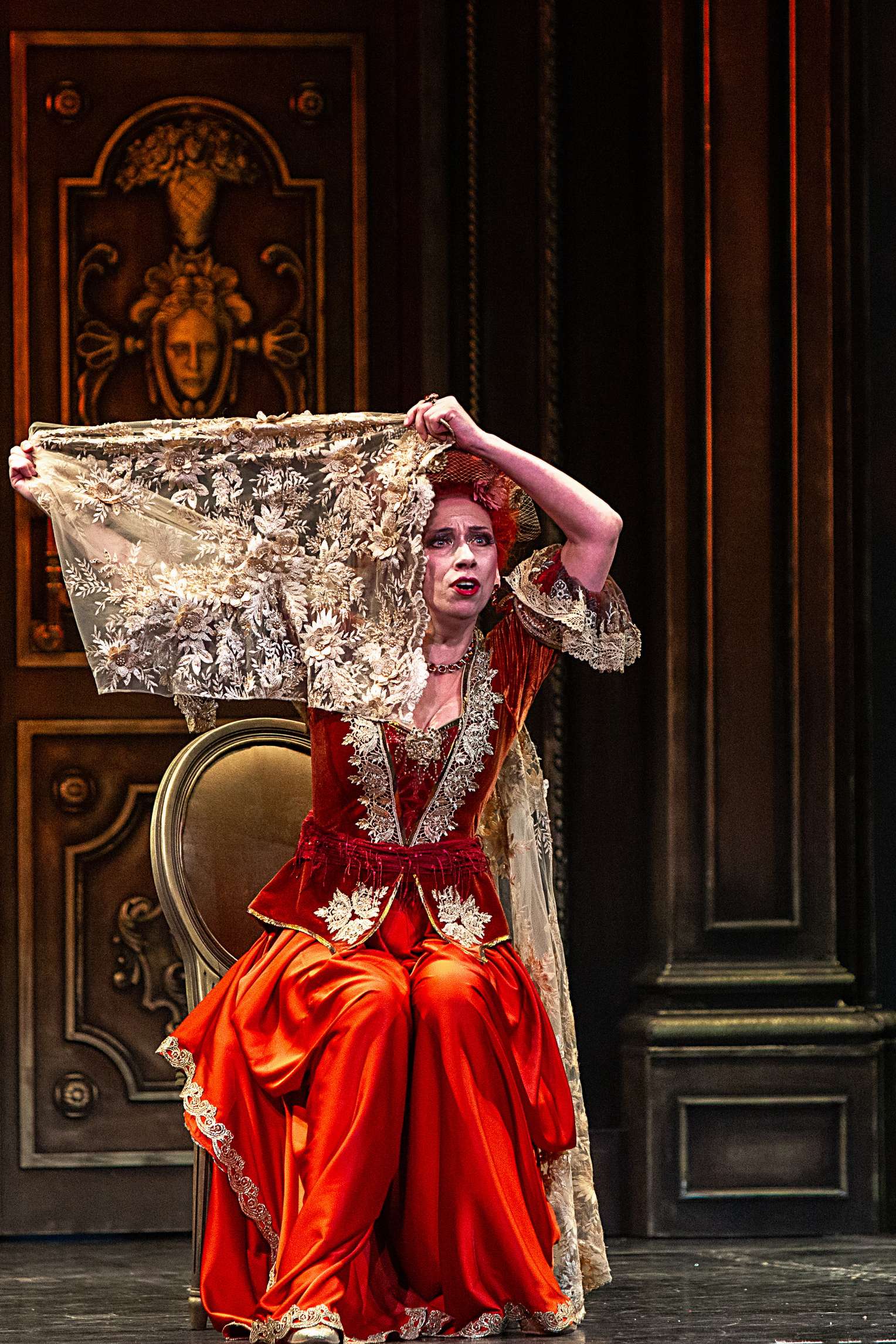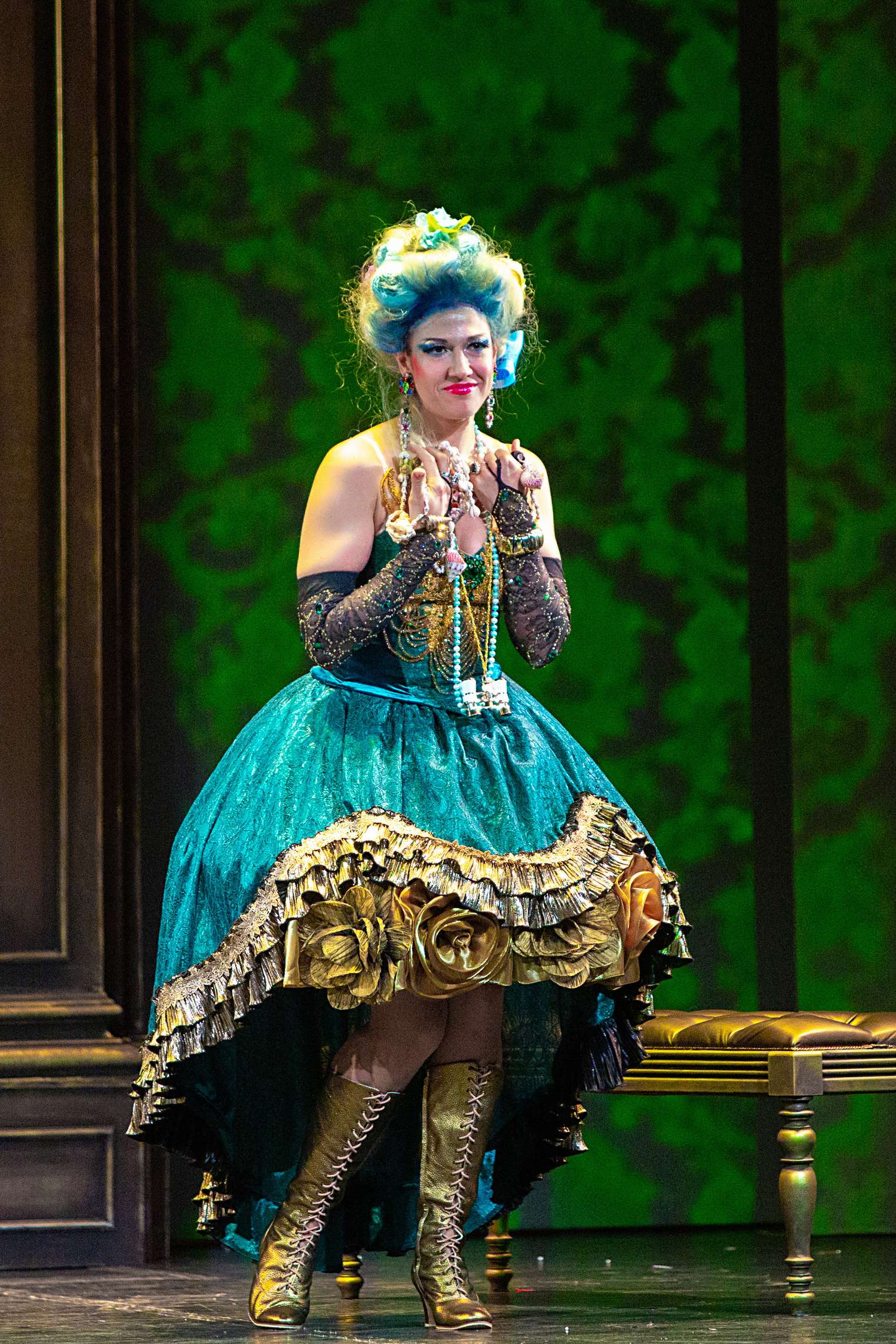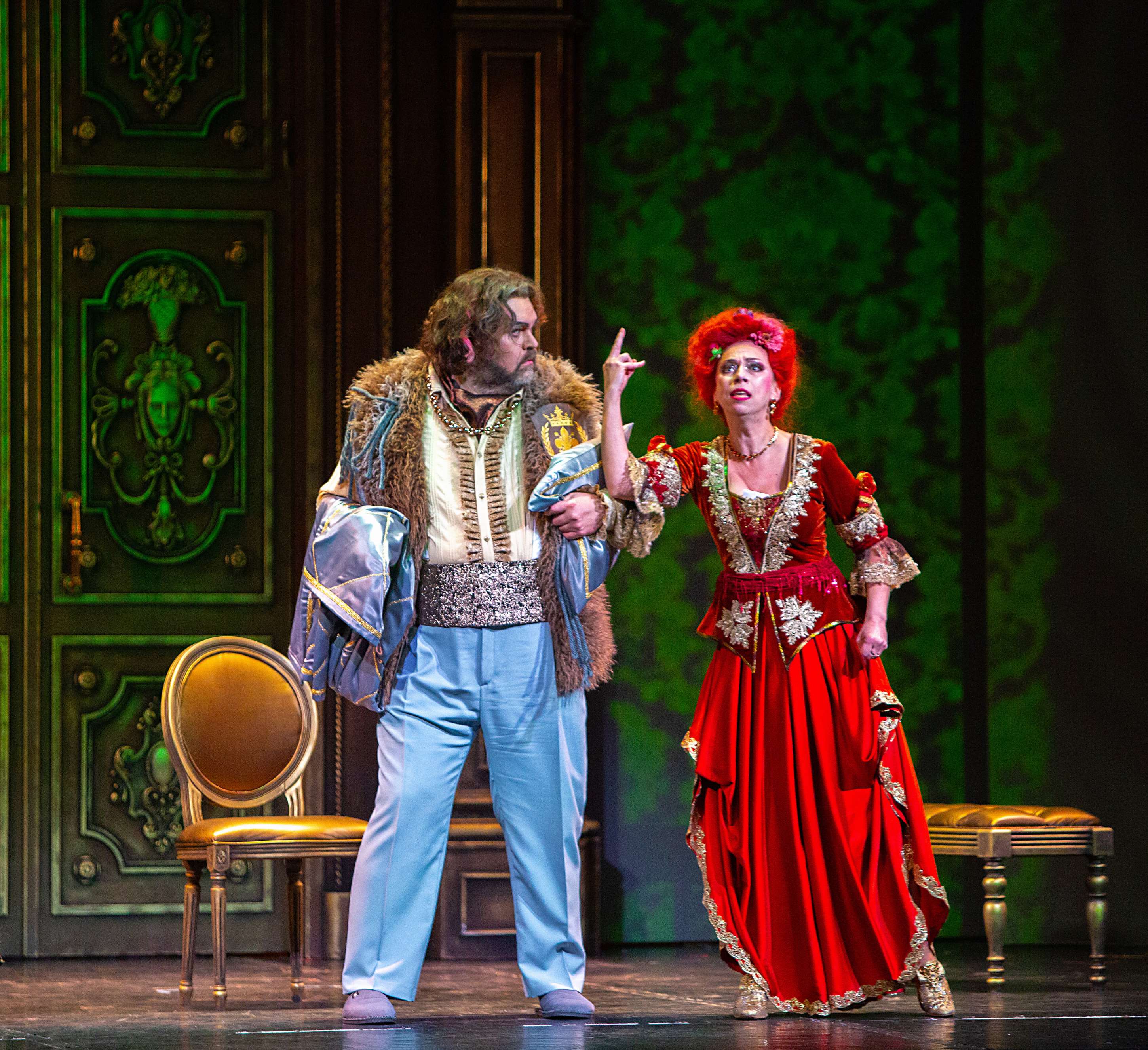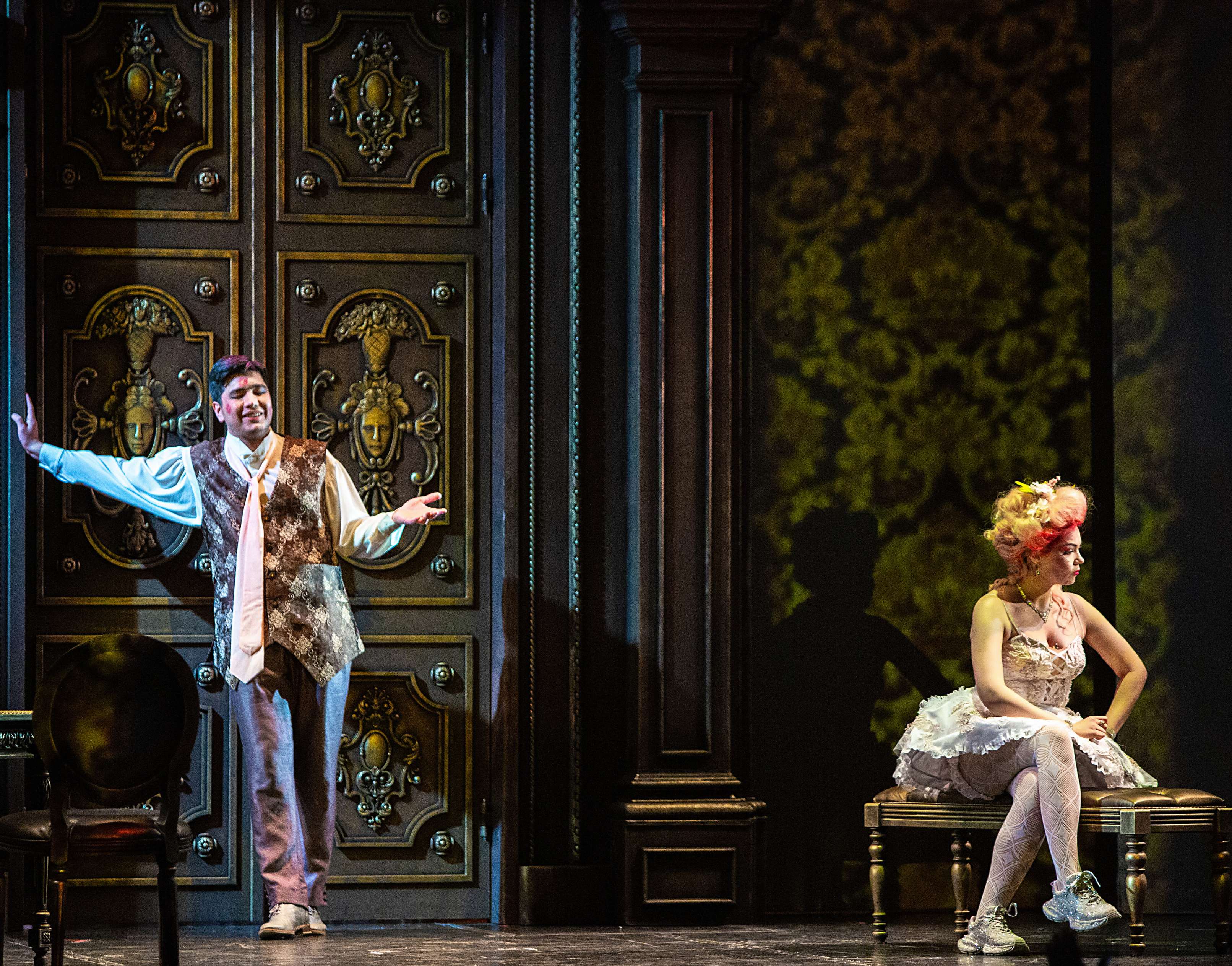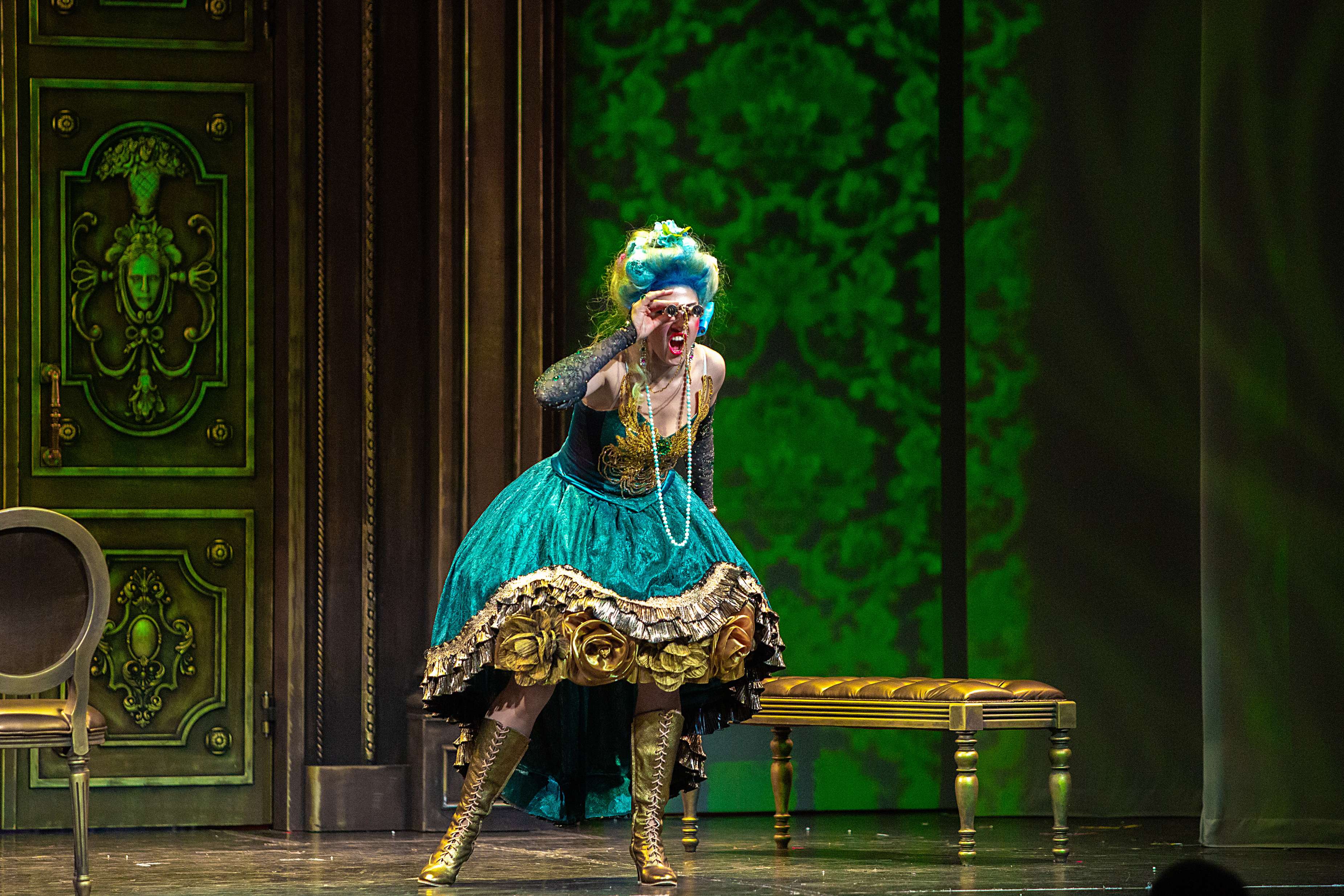 При этом художник Вячеслав Окунев вписал действие в раму как бы барочного театра. Например, прически с высокими начесами немыслимых цветов у дам, наряды, отсылающие к моде XVIII века и одновременно пародирующие ее, выпячивая все ее странности и несуразности. В целом костюмы отличает не просто эклектика, а невероятный фьюжн, сопрягающий заведомо несочетающееся, – кринолины в розочках и кроссовки в серебряных стразах у главной героини Каролины. Центральный элемент сценографии – массивная резная дверь-портал, за которой скрывается бесконечный гардероб дамских платьев – «сокровища» капризных Лизетты, Каролины и Фидальмы. Видео-арт Георгия Савельева заменяет привычные декорации, в первом акте помещая действие в кущи сада, вот втором – возвращая в обтянутую гобеленами залу, ближе к финалу «роняя» и «разбивая вдребезги» массивную люстру в проеме портала, а в самом конце демонстрируя в нем же роскошную картину в стиле аллегорической живописи барокко. Естественным продолжением этого визуального ряда служит квазибарочный декор зала театра барона фон Дервиза, в котором проходят спектакли «Санктъ-Петербургъ Оперы».