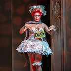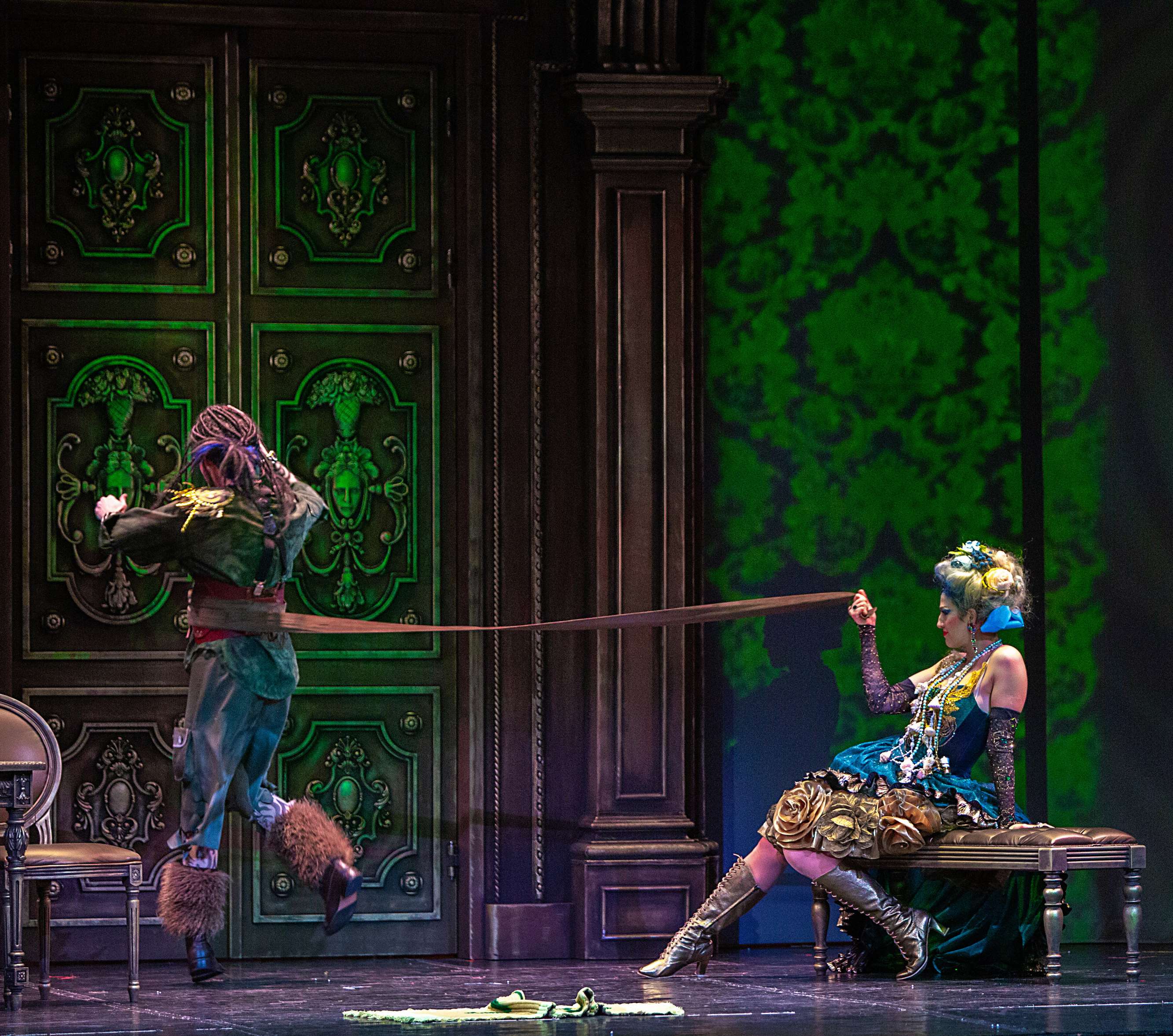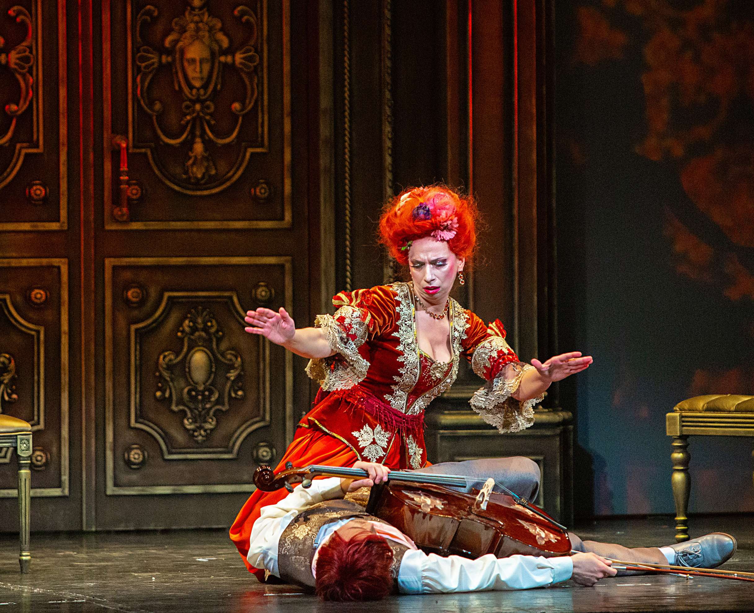 Демократичность явлена и в актерском решении образов. Все они предельно комедийны, даже гротескны: обжора-папаша Джеронимо (Евгений Баев), чуть что – работающий кулаками, эксцентричные дамы его семейства в немыслимых экстравагантных нарядах (Лизетта – Мария Бочманова, Каролина – Александра Ляпич, Фидальма – Юлия Птицына), «вечно плачущий Пьеро» Паолино (Исламбек Кемелов) – мальчик для битья, наконец, лишенный даже отдаленных признаков аристократизма граф Робинзон (Валерий Каула) – по виду хипарь в дредах и живописном татуаже на всех четырех конечностях. У Карпачевой комедия становится площадным балаганным театром с грубоватыми шутками, полным отсутствием манер, бесконечным дураченьем персонажей. Кульминацией этой клоунской эксцентрики становится объяснение Фидальмы с Паолино, когда дама бальзаковского возраста пытается соблазнить юного героя, музицируя при этом на инкрустированной узорами виолончели – издавая противные глиссандо по всей длине то одной, то другой струны, пиликая по открытым струнам, словом, всячески демонстрируя свое «владение» инструментом.