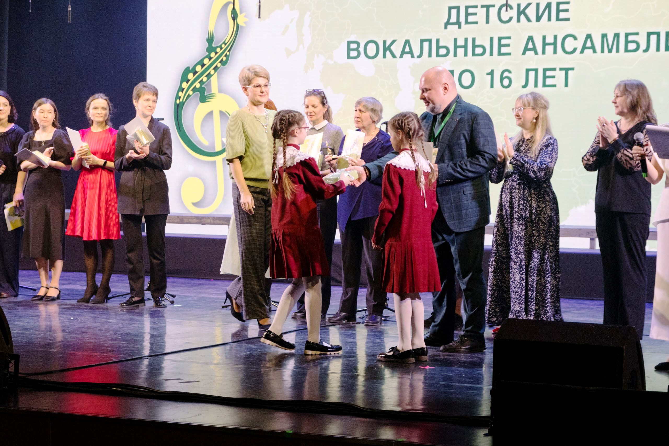 Наши участники всегда награждаются призами – они тоже особенные, их изготавливают известные мастера, камнерезы Урала. Все призы эксклюзивны, камнерезная мастерская делает их специально для нас. Для двух Гран-при – взрослых и детских коллективов – это малахитовые кубки, для победителей в категориях – скрипичный ключ на малахитовой подставке с нашей фирменной Уральской Бажовской змейкой. С особым трепетом в 2025 юбилейном году организаторы подготовили специальные призы в номинации «За лучшее исполнение патриотической песни». Были и картины зарисовки – виды уральской природы в исполнении уральских художников».