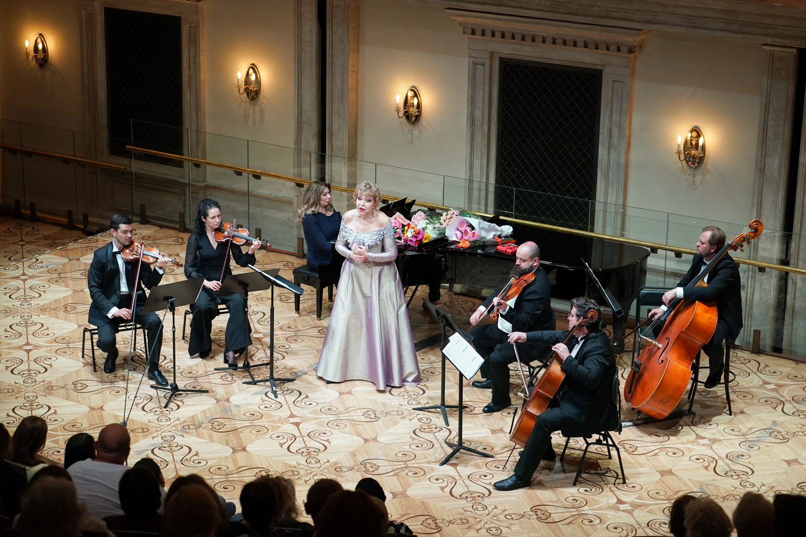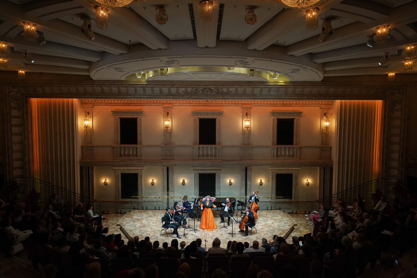 Этот коронный номер певицы (она его исполняла несколько лет назад в «Зарядье», поразив качеством исполнения и погруженностью в материал) был исполнен в сопровождении инструментального дуэта Татьяна Осколкова (арфа) – Маргарита Петросян (фортепиано). В прочей программе певице аккомпанировал Секстет Большого театра (Кирилл Филатов и Анна Яновская – скрипки, Дмитрий Безинский – альт, Вячеслав Чухнов – виолончель, Кирилл Носенко – контрабас, Мария Черникова – фортепиано), исполнивший и самостоятельные номера. Вышла на сцену и дочь Александры пианистка Любовь Дурсенева, сыграв с контрабасистом Кириллом Носенко хулиганскую «Испанскую» из «Скетчей» Сержа Лансена.