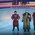 Однако все равно «чего-то в супе не хватало». В нетеатральном пространстве подошло бы, наверное, более обобщенное, метафоричное решение оперы, зиждущееся на иносказании, эскизных обозначениях. Ан нет: Новиков решает делать своего «Бориса» как костюмную реалистическую историю и ожидаемо проигрывает баратовскому «Борису», идущему в Большом, – превзойти этот образцовый театр-музей, похоже, не дано никому. Вроде бы и костюмы Александра Купаляна не менее прихотливы и роскошны, достоверны и эстетичны, но даже их византийская приторность смотрится одиноко, если не бедненько на пустой циклопической сцене «Зарядья», поскольку нет подобающего сценографического окружения (и неподобающего, по правде сказать, тоже), а видеопроекции (работа Дмитрия Костяева) всего компенсировать не в состоянии и воспринимаются как компромиссный вариант. Вдобавок ко всему в сцене коронации Новиков и вовсе дает видеокадры из аналогичной сцены габтовского спектакля, и у публики возникает разочарование – красоты недодали: вона, оказывается, как должно быть, если делать все «по полной программе»!