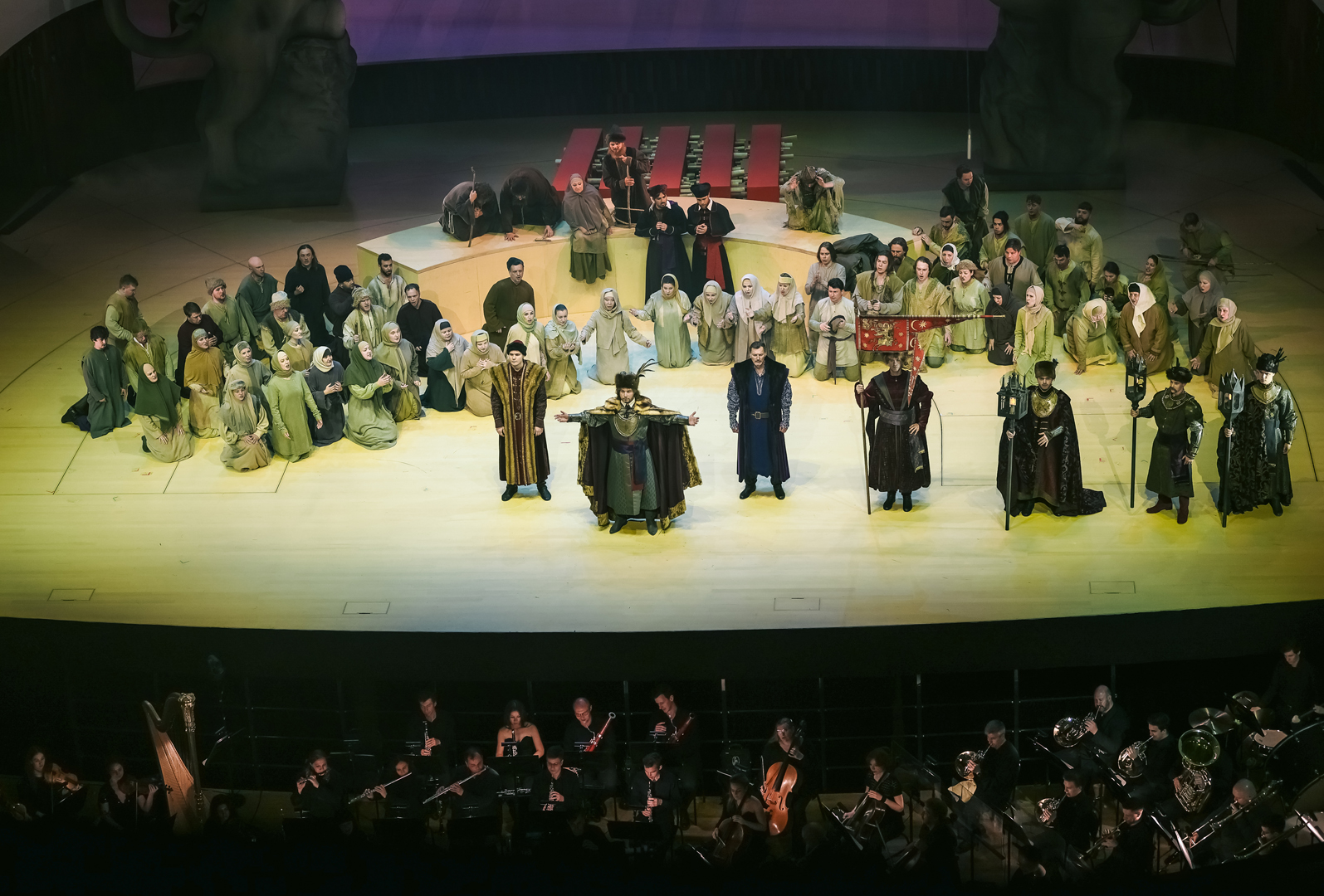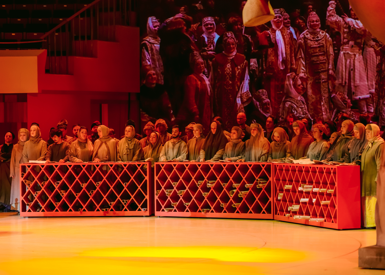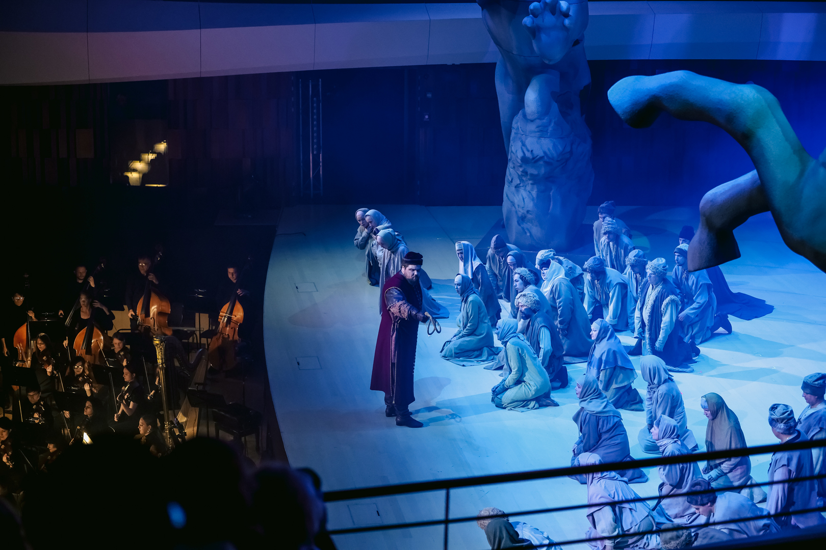 Концертный зал для реализации столь масштабного полотна, как «Борис», – не самый лучший вариант, даже если это такой технологичный зал, как «Зарядье». В нем открыли оркестровую яму, орган завесили экраном для видеопроекций, в сцене у Василия Блаженного с колосников спустили гигантский тканевый полог – на него проецировали изображение Покровского собора, – который при появлении царя ниспадал, обнажая внутреннее пространства храма и «приглашая» толпу напрямую пообщаться с правителем; в сцене в Боярской думе полукругом поднялись хоровые станки, превратив царский совет в подобие римского сената.
