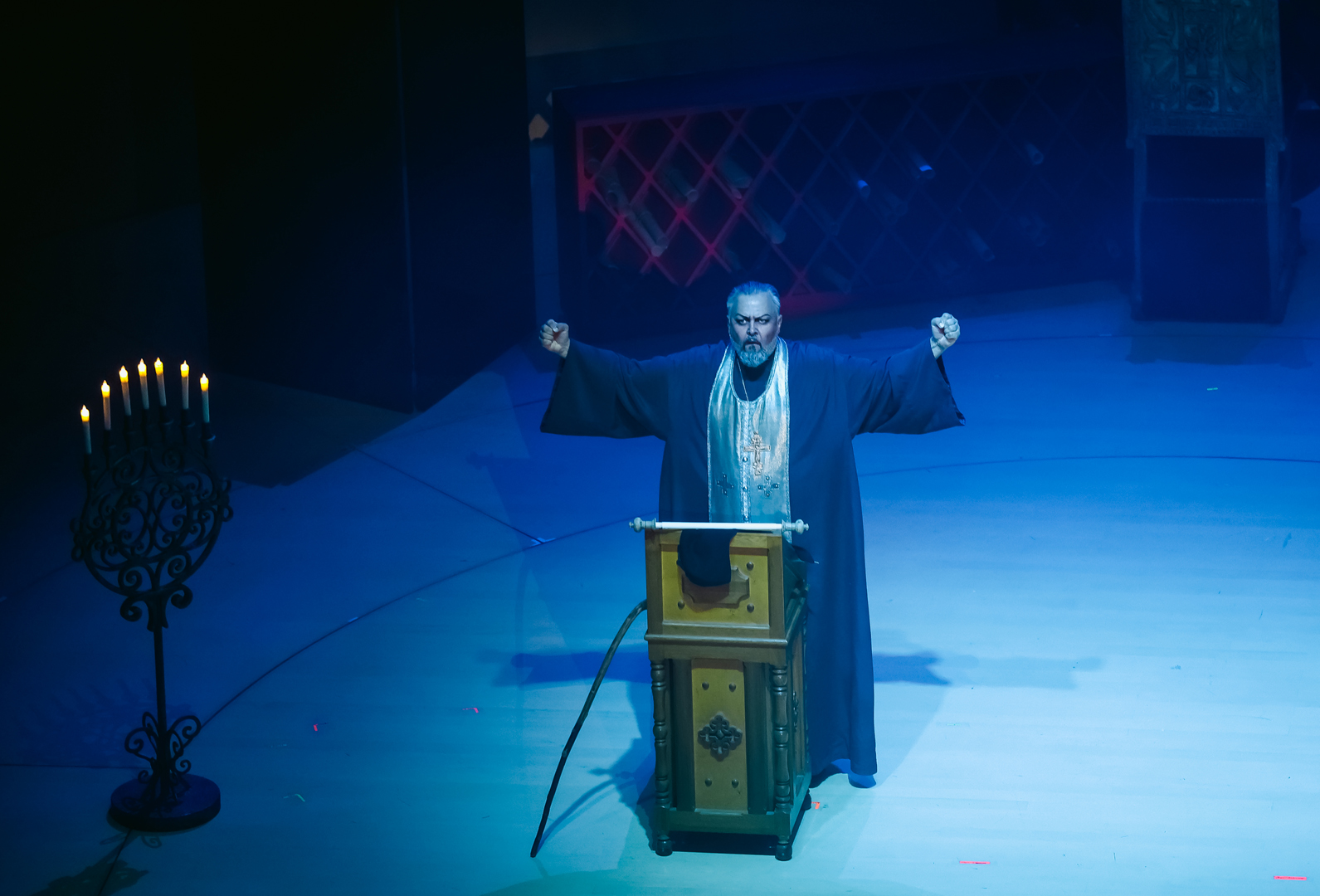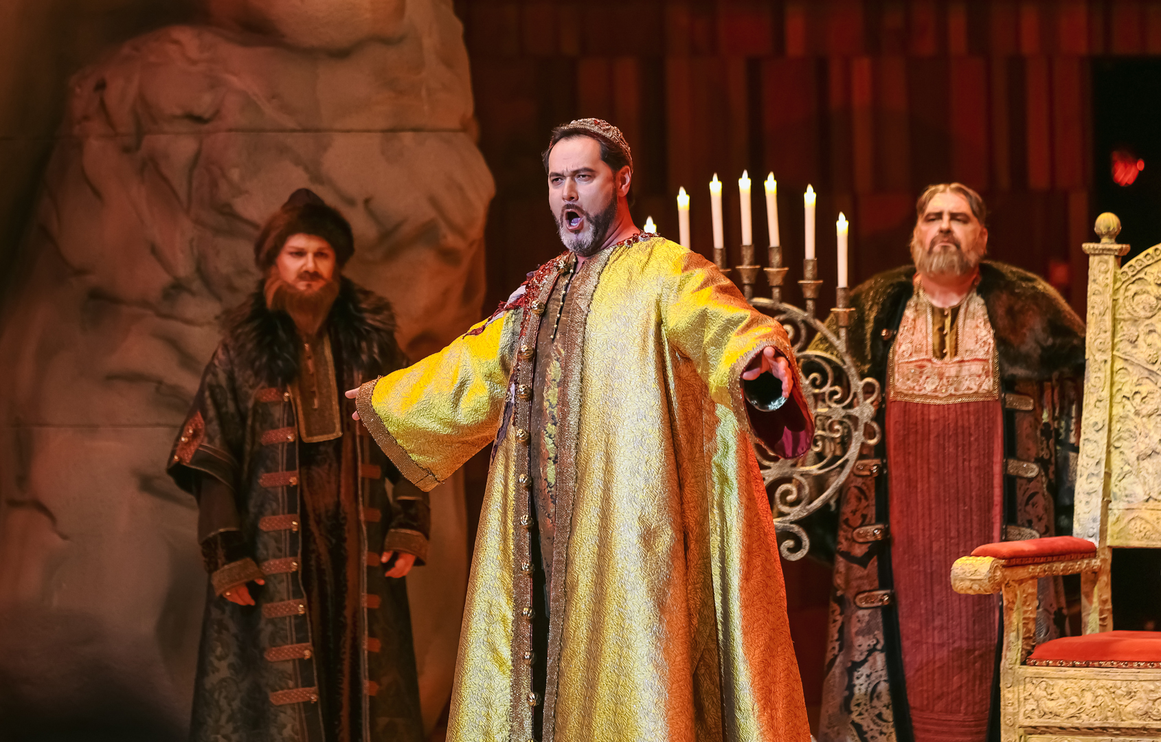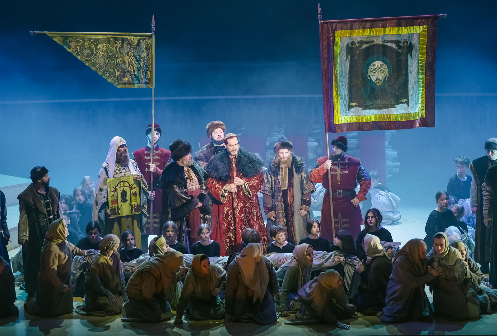 Главная русская опера в Москве вниманием не обижена – идет в Большом, «Геликоне» и «Новой опере»: во всех театрах это спектакли-долгожители (соразмерно истории каждого из трех), пользующиеся неизменным вниманием публики. Что подвигло устроителей фестиваля обратиться именно к этой опере, сказать трудно: возможно, желание вновь продемонстрировать сильнейшего на сегодняшний день исполнителя титульной партии – Ильдара Абдразакова; возможно, амбиции режиссера Сергея Новикова и музрука проекта Ивана Рудина (хотя для фестивального продукта предпочтительнее было бы что-нибудь пораритетней, что-то из тех опер, что не идут ни в одном из московских театров).
