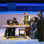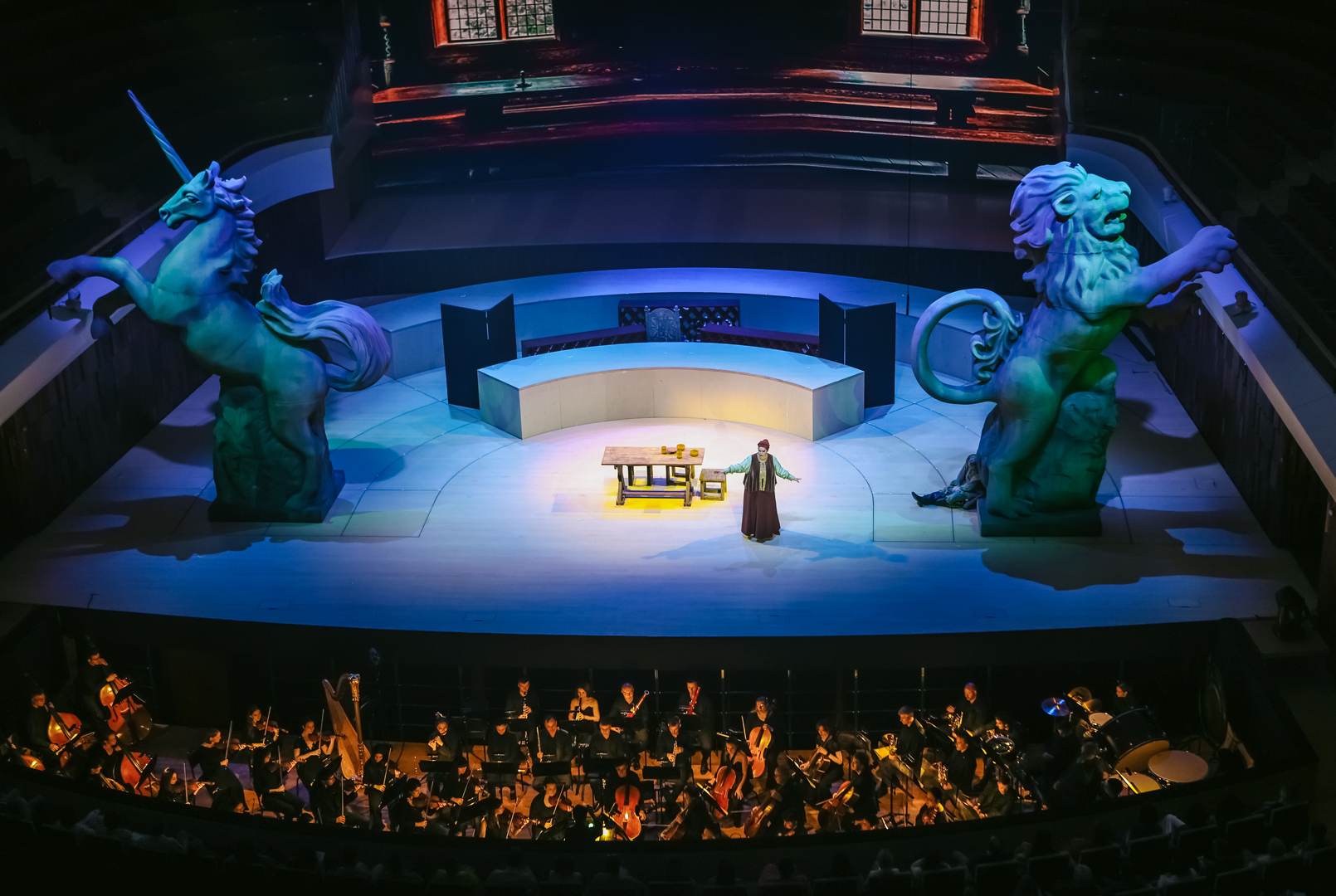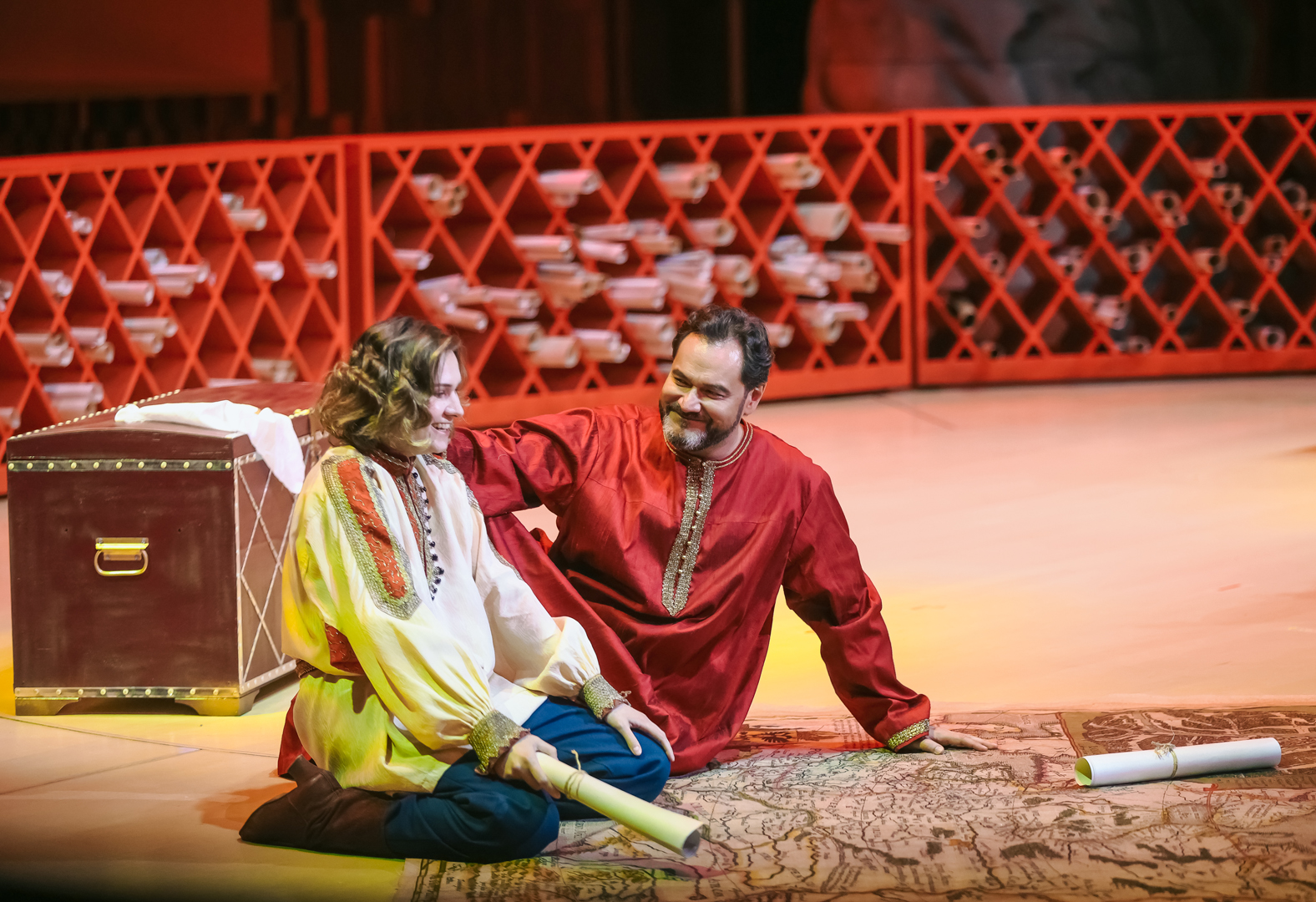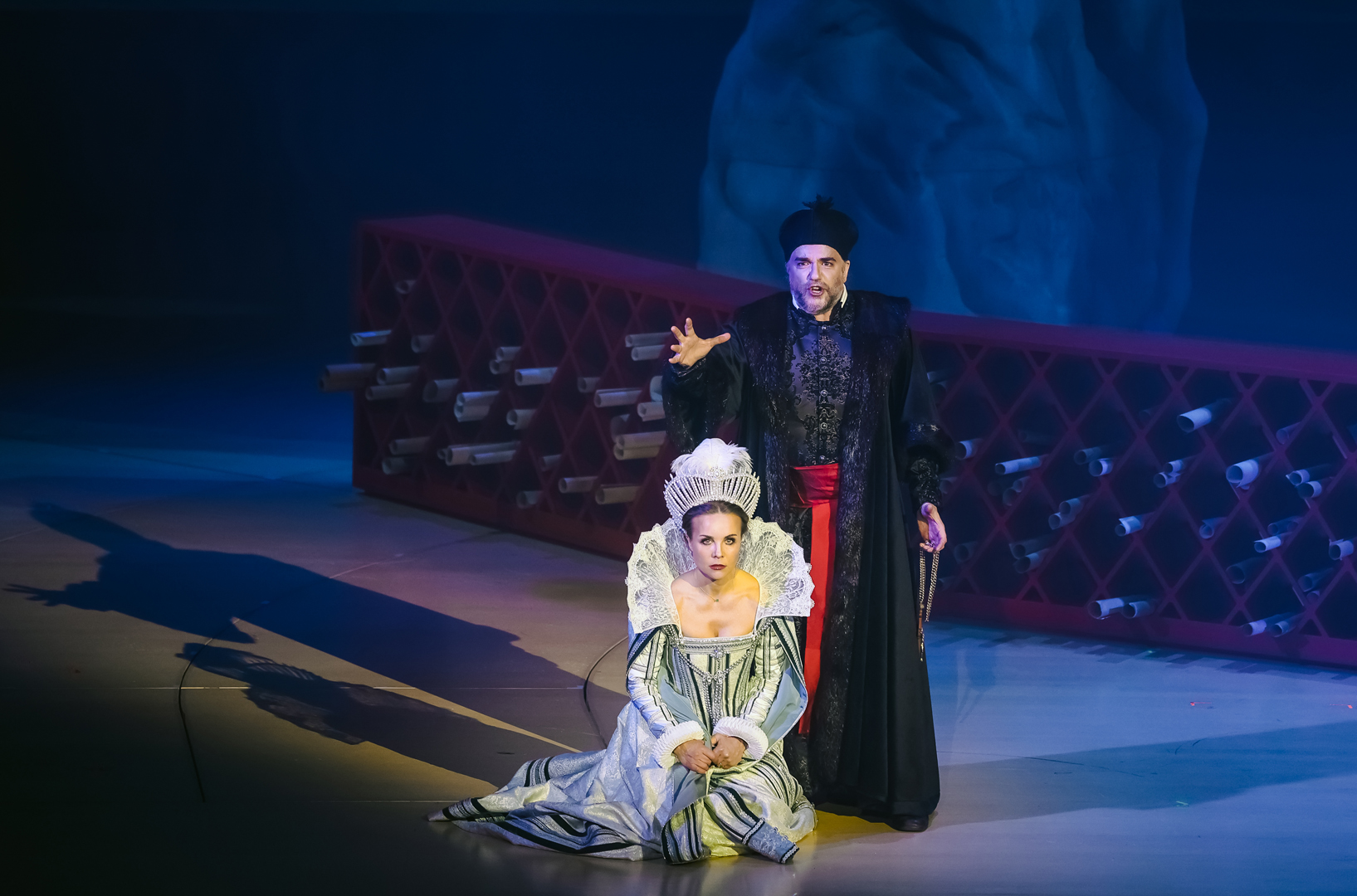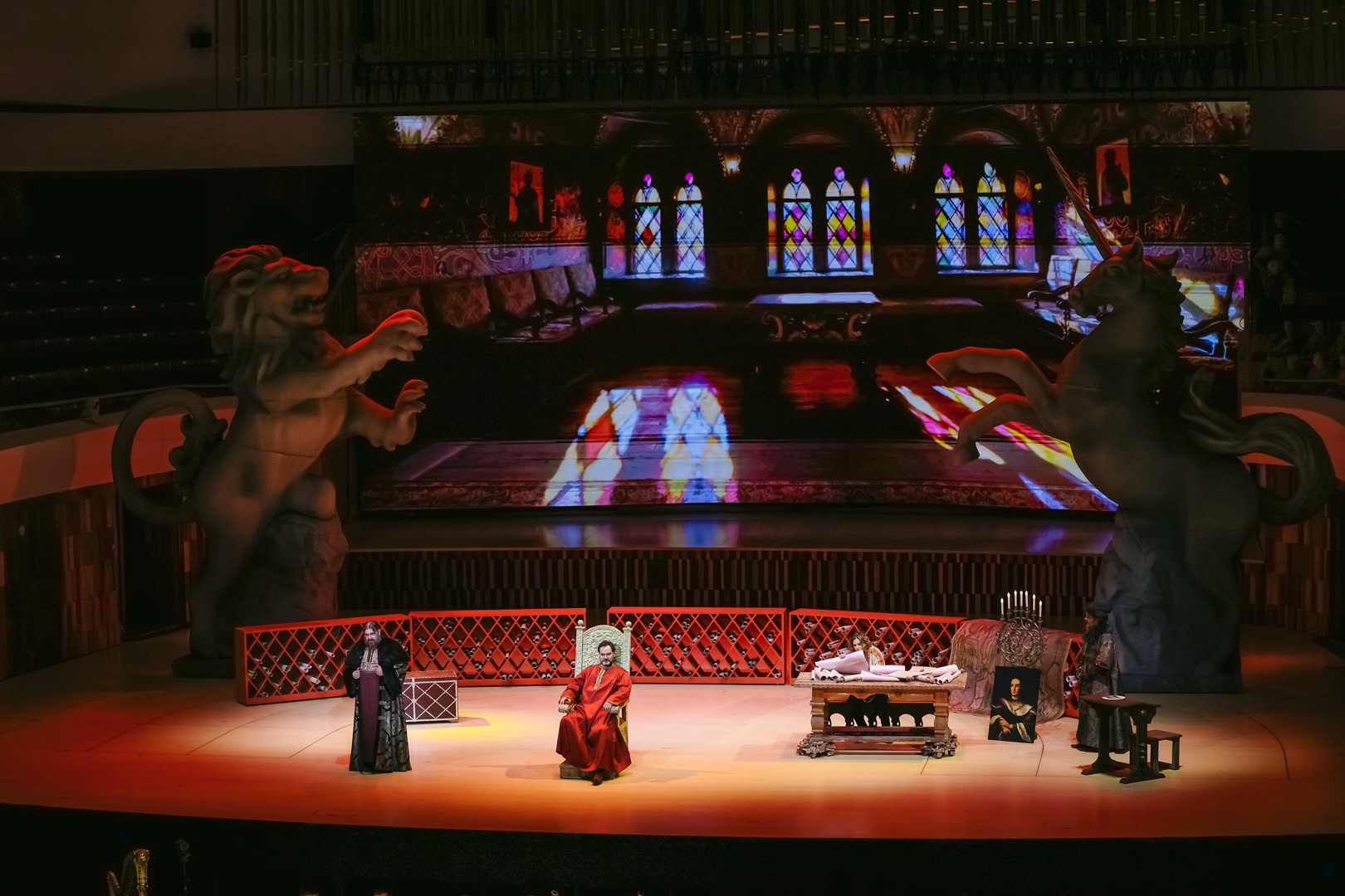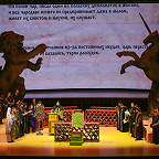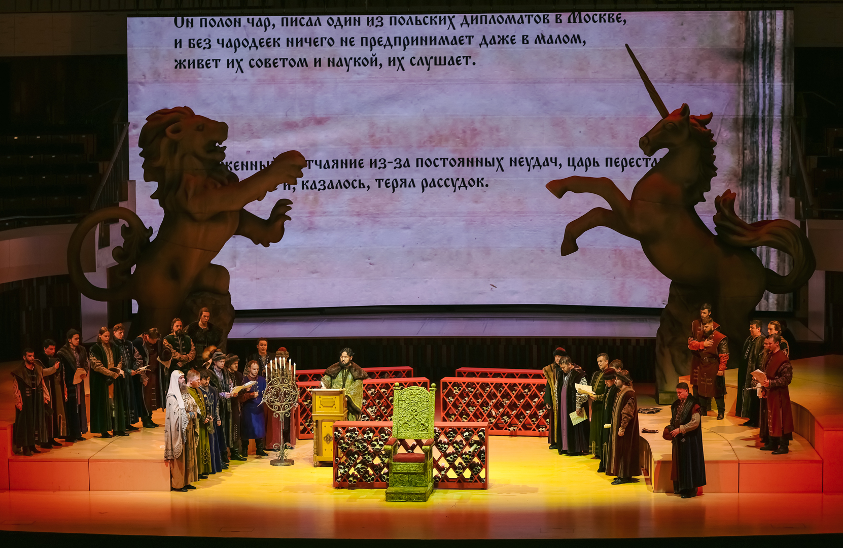 Какая-никакая символика в спектакле все же была. Полукругом расставлены красные шкафы-перголы: в их бесчисленных углублениях – свитки. Идею можно интерпретировать так: Борис – царь просвещенный, все у него учтено и под контролем, мудростью свой ум он просветил, того же желает как своим детям, так и народу в целом. Можно и иначе прочитать: Борисово царство – мир доносов и интриг, подложных грамот и фантастических небылиц, которым охотно верит толпа. С этим все более-менее ясно. Но как только публика входит в зал, лишенный занавеса, она видит две исполинские фигуры – льва и единорога. Символы многозначные, имеют место в различных культурах, в том числе и в русской традиции, однако для подавляющего большинства самый очевидный ответ – это герб Великобритании, англо-шотландского союза. Какое отношение заморская держава имеет к Смутному времени – сиди и гадай, тем более что бесконечно ползущие по экрану титры однажды упомянут поздравление королевы Елизаветы царю Борису с восшествием на престол, то есть факт признания британской короной новой русской династии.
