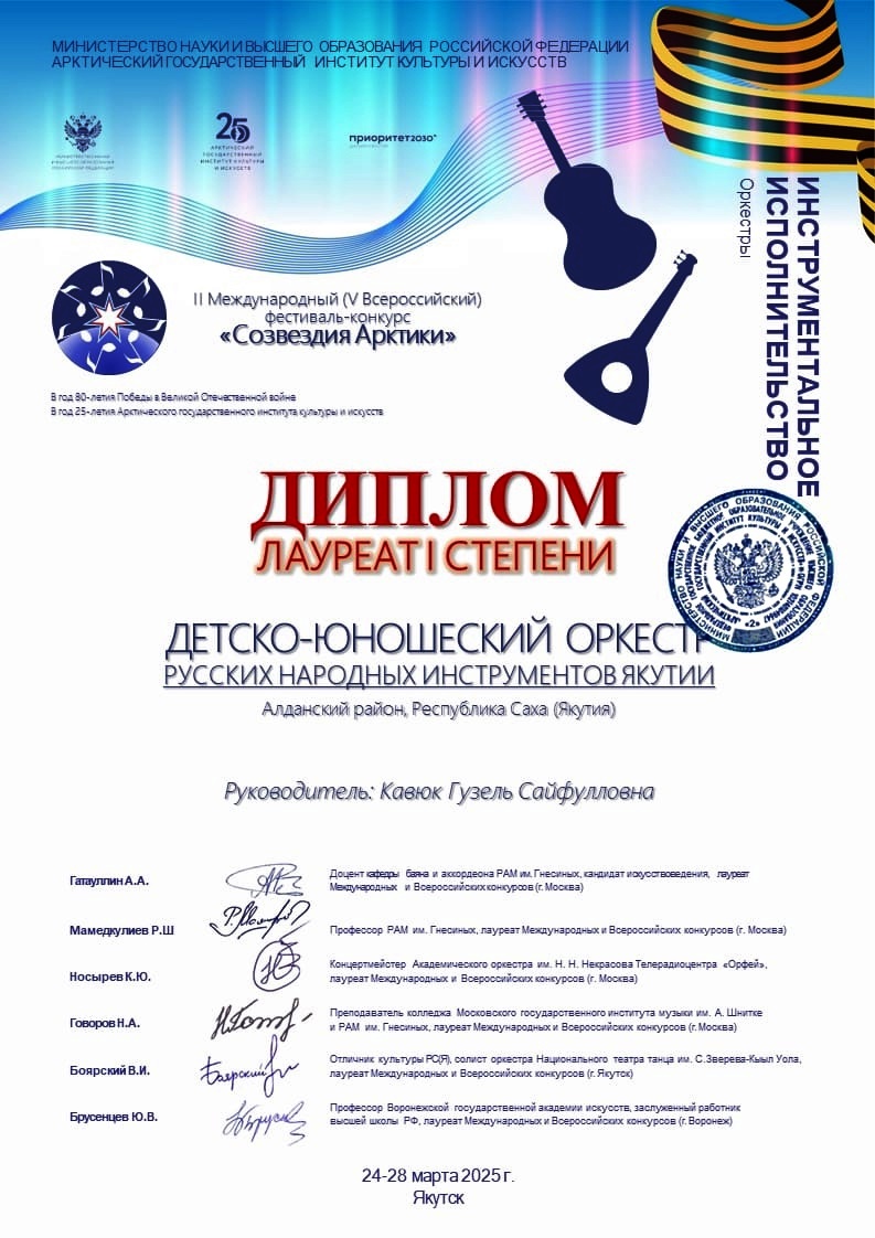 С 24 по 28 марта 2025 года центром притяжения для молодых талантов стал Якутск. В это время в Арктическом Государственном институте культуры и искусств прошёл II Международный (V Всероссийский) конкурс «Созвездия Арктики – 2025», объединивший более 270 участников из России, Сербии, Кыргызстана и Китая. Одновременно в Якутском музыкальном колледже имени М.Н. Жиркова прошёл VII Республиканский конкурс исполнителей на народных инструментах «Таланты народные – 2025» имени заслуженного деятеля искусств Республики Саха (Якутия) Л.П. Киселёвой.