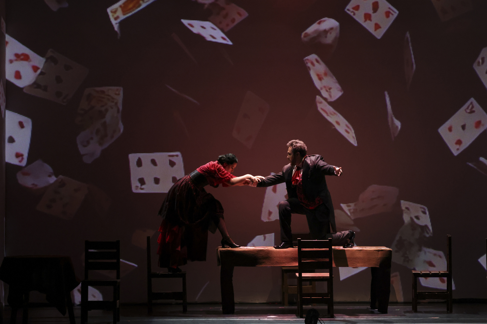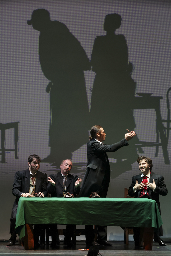 Но за пределами этих схожестей пропасть между двумя сочинениями открывалась огромная. «Женитьбу» автор не инструментовал, а в «Игроках» — изобретательнейший, остроумный, расписанный для тройного состава оркестра «текст», полный головокружительного драйва. В сравнении с этаким пиршеством опыт Мусоргского (в данном случае в оркестровке Наговицына) — милые музыкальные посиделки. И эти посиделки Дзамболат Дулаев, Руслан Бабаев, Ульяна Бирюкова провели блестяще, разве что пока не избавившись от излишней, возможно, премьерной, ажитации, из которой вытекал некоторый пережим. «Игроки» обещали испытания пожестче. Басовитым слугам, подающим голос не каждую минуту, — что. А вокалисты-игроки могли скоро подустать в азартном беге по нотам, перманентных поисках новых красок, изнуряющих вычерчиваниях изгибов прихотливой фразировки — и подустали, не исключая самого яркого и стабильного из них, Азамата Цалити, певшего заводилу шулеров Утешительного. Однако оркестр, который вел дирижер Айрат Кашаев, летел к финалу, не сбивая дыхания и не путаясь в калейдоскопе темпов, настроений, жанровых крайностей. И долетел. Напомним — к тому, чего в шостаковических «Игроках» нет. А в спектакле есть, и даже в двойном выражении.