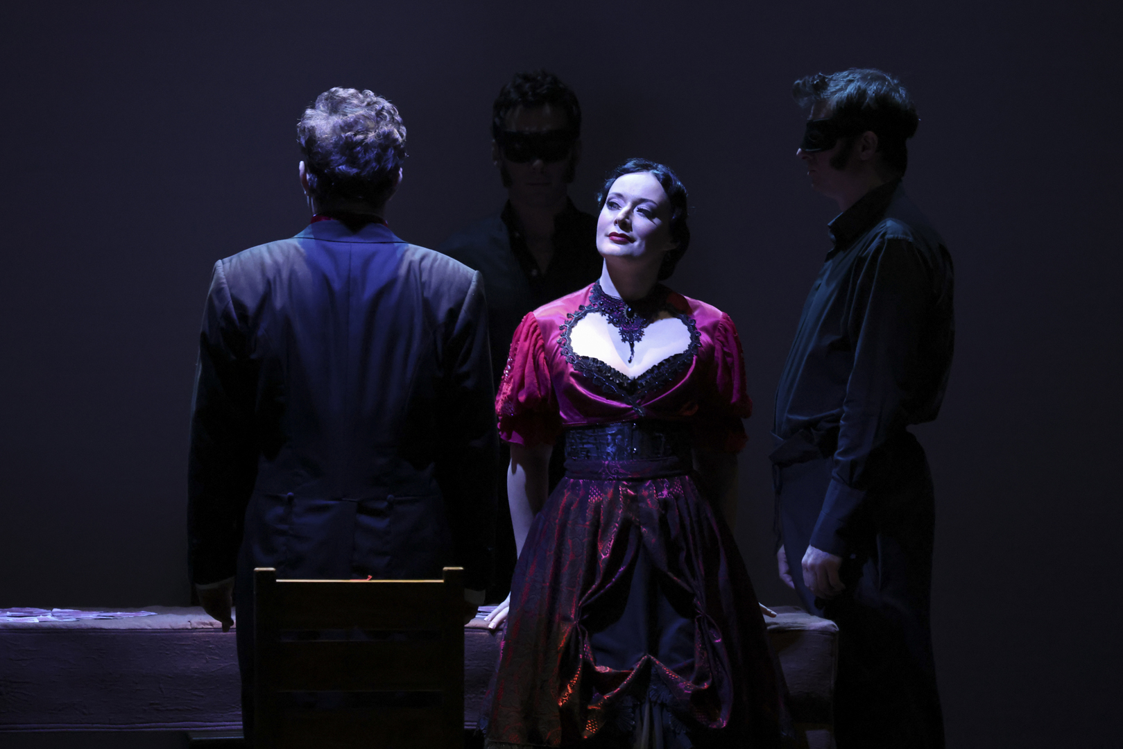 В нашем случае, однако, даты все же фигурируют. Первая ласточка, «Женитьба», появилась на фестивале в честь 185-летия Мусоргского в ряду других приношений. Но для Исторической сцены звезду с неба ухватили, представив эксклюзив — нечто невиданное-неслыханное из наследия композитора под названием «Саламбо», а на Камерной решили переворошить прошлое. В том прошлом, когда сцена еще была театром Бориса Покровского, и проглянула «Женитьба». Ставить ее взялись, не скрывая: будем следовать духу и заповедям мастера. Благо нашелся режиссер, который успел поработать в Камерном театре еще при его жизни, — Эдем Ибраимов. Однако такое заявление говорит лишь об эстетике постановки и методах работы, но никак не о легкости задачи. И заповедям Покровского можно изменить, и собственными фантазиями авторский замысел искалечить — даже если без финала его определенность под вопросом. Ибраимов того и другого избежал.