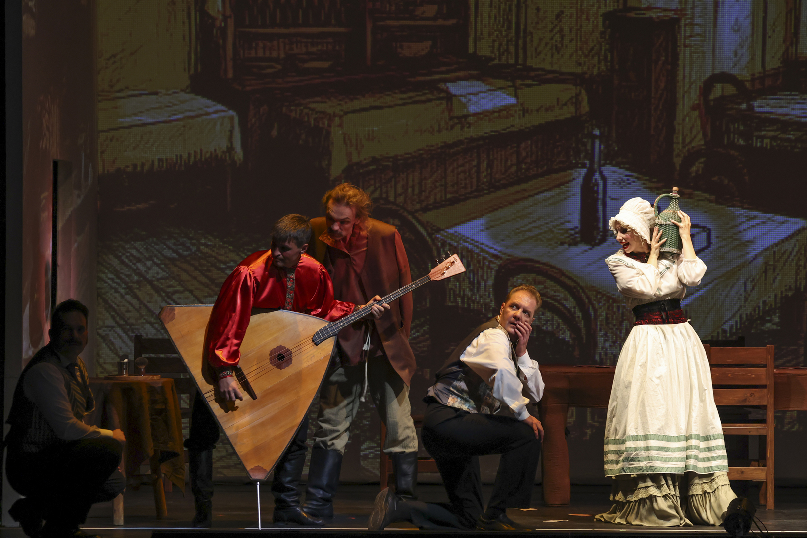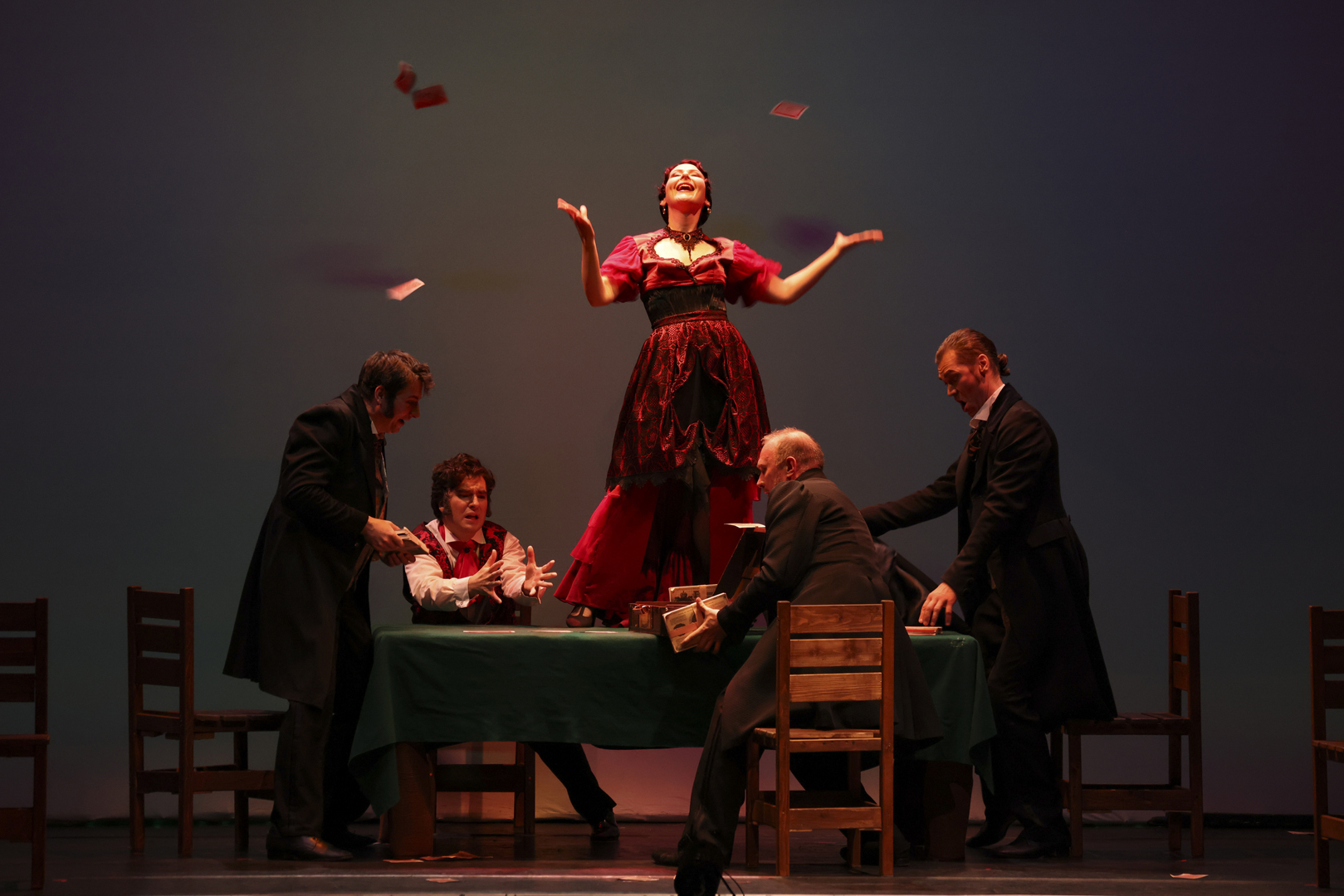 Один финал придумал режиссер. С полчаса он развивал действие в сценическом темпе moderato, позволяя без спешки и суеты разглядеть во всей красе подробно нюансированную актерскую игру и вкусно поданные подробности жития-бытия персонажей. Но едва запружинило в оркестре остинато, предвещающее кульминацию оперы — игру, понеслась сценическая круговерть. И оказалась она очень кстати. Как, в какую минуту в азартных «скачках» вокруг игорного стола да за байками о виртуозах шулерского дела герой остался в одном исподнем, проигравшись в пух и прах, — потерялось. Тем неожиданнее, настоящим сюрпризом, «выскочила» эта гоголевская концовка, до которой опере бы еще добираться и добираться, и прилепилась сюда как влитая. А режиссер добавил к ней еще и крохотный сюжетец. За пределами последней ноты (отметим важное — балалаечной) вытащится у него из кулис уже не горячая испанка Аделаида Ивановна, в которую он превратил этак ласково поименованную героем колоду карт, а немощная старуха. «Пожалей!», —припадет к былой соратнице Ихарев. А она только захохочет: нет, дружок, Аделаида Ивановна любит удачливых да горячих, способных сообщить жизнь, молодость, страсть и ей самой... Однако как ни занятна фантазия режиссера, настоящий финал не в этом, и придумал его не он.