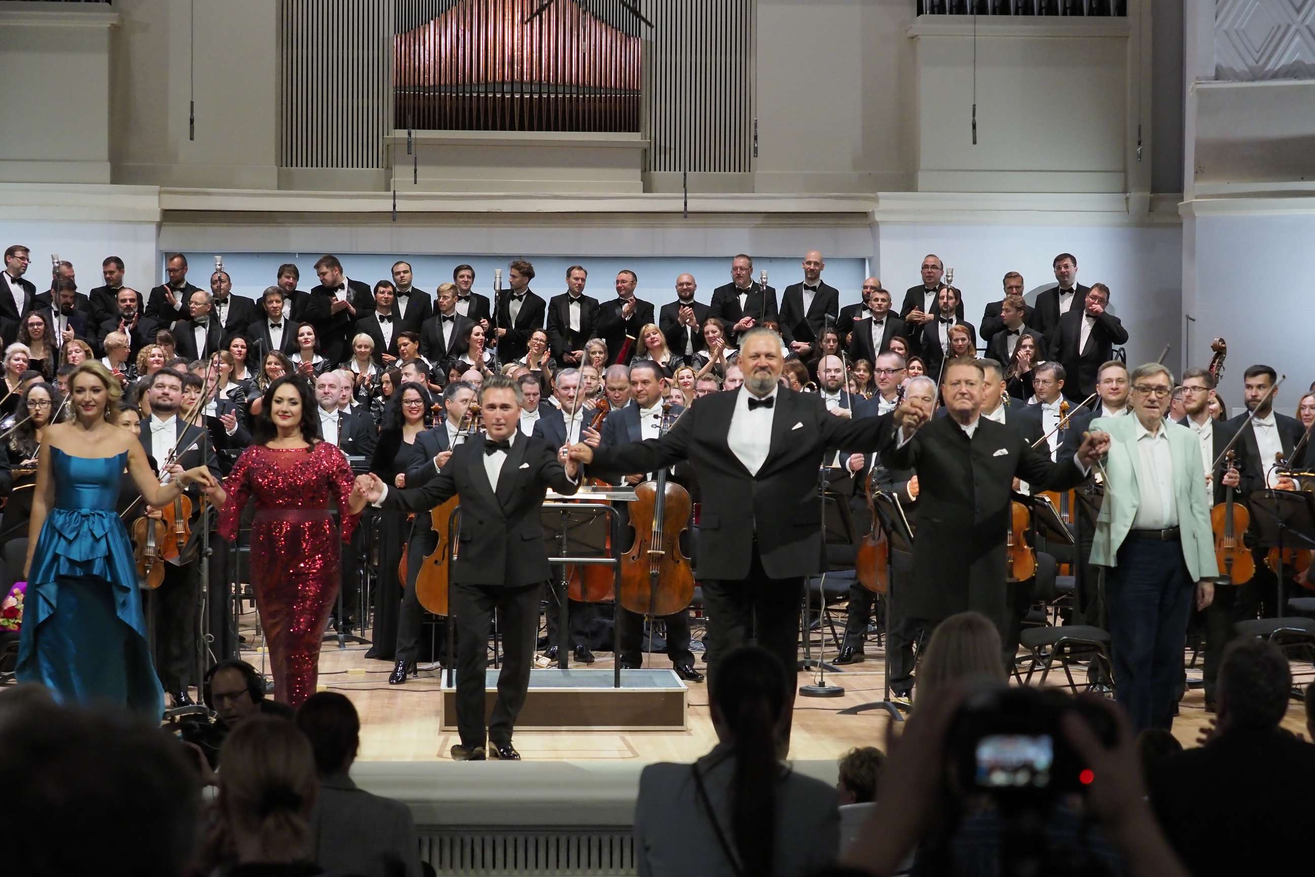 Солистов Сладковский разместил позади оркестра, перед хором, что с точки зрения ансамбля выглядело оптимальным решением. Но вот сами солисты при этом заметно проигрывали: их голоса порой терялись за хоровыми и оркестровыми массами, и они вынуждены были прибегать к форсированию. А ведь солисты подобрались не самые последние: Алексей Тихомиров, Алексей Татаринцев, Агунда Кулаева и примкнувшая к ним Валентина Феденёва. Тихомирову партия оказалась высоковата, и вступительные фразы прозвучали едва ли не на грани срыва, но в целом он производил внушительное впечатление и был стилистически корректен. Наиболее уверенно и стабильно выглядел Татаринцев. Женские партии здесь значительно скромнее, в них практически нет соло, но все же Кулаева звучала достаточно весомо, чего не скажешь о Феденёвой.