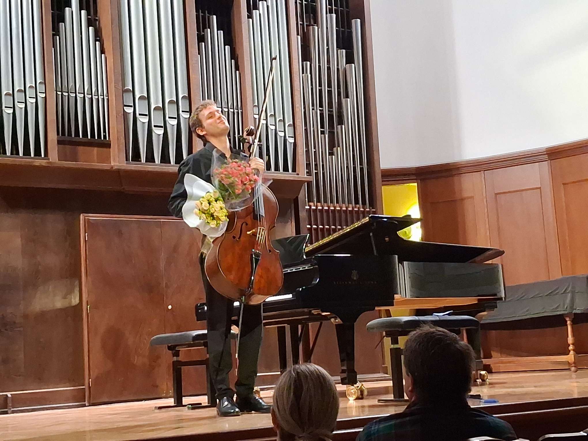 Их, впрочем, не было и у Михайлова. Виолончелист изначально выглядел очень усталым, что, вероятнее всего, объяснялось интенсивной подготовкой к Конкурсу Кнушевицкого (программу для которого он обкатывал спустя несколько дней в Зале Мясковского, и она ни в чем не повторяла ту, что прозвучала в МЗК), начинавшемуся через неделю. Похоже, подготовка стоила ему немало бессонных ночей. Сонату № 4 для виолончели и фортепиано Бетховена Михайлов сыграл вполне добротно, но не более того. Гораздо интереснее как музыкант он раскрылся в Сонате ре минор Шостаковича. А вот завершившие программу Вариации на тему Россини Богуслава Мартину показались недостаточно отработанными и прозвучали довольно вяло.