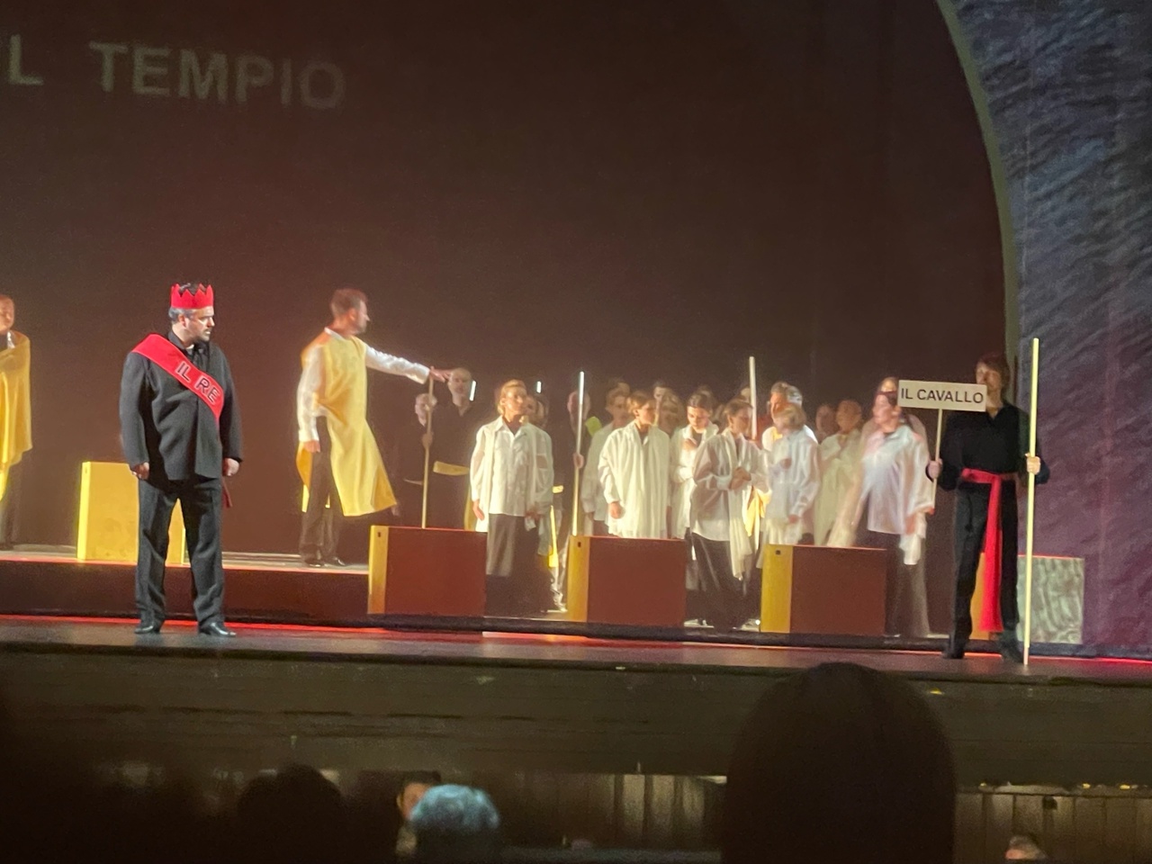 В опере позднего бельканто, где так много зависит от вокальных кондиций певцов, избранный формат на грани концертной презентации и полноценного спектакля оказался очень уместен: музыка была на первом плане, но и театр присутствовал. Например, воины появляются на сцене с табличками Il cavallo («конь», то есть мы имеем дело с всадниками), из десятка внушительных кубов с красными и желтыми гранями складываются то вавилонский дворец, то иудейский храм, выразительные световые акценты (от Майи Шавдатуашвили) в темноте сценической коробки – все создавало атмосферу театральности.