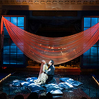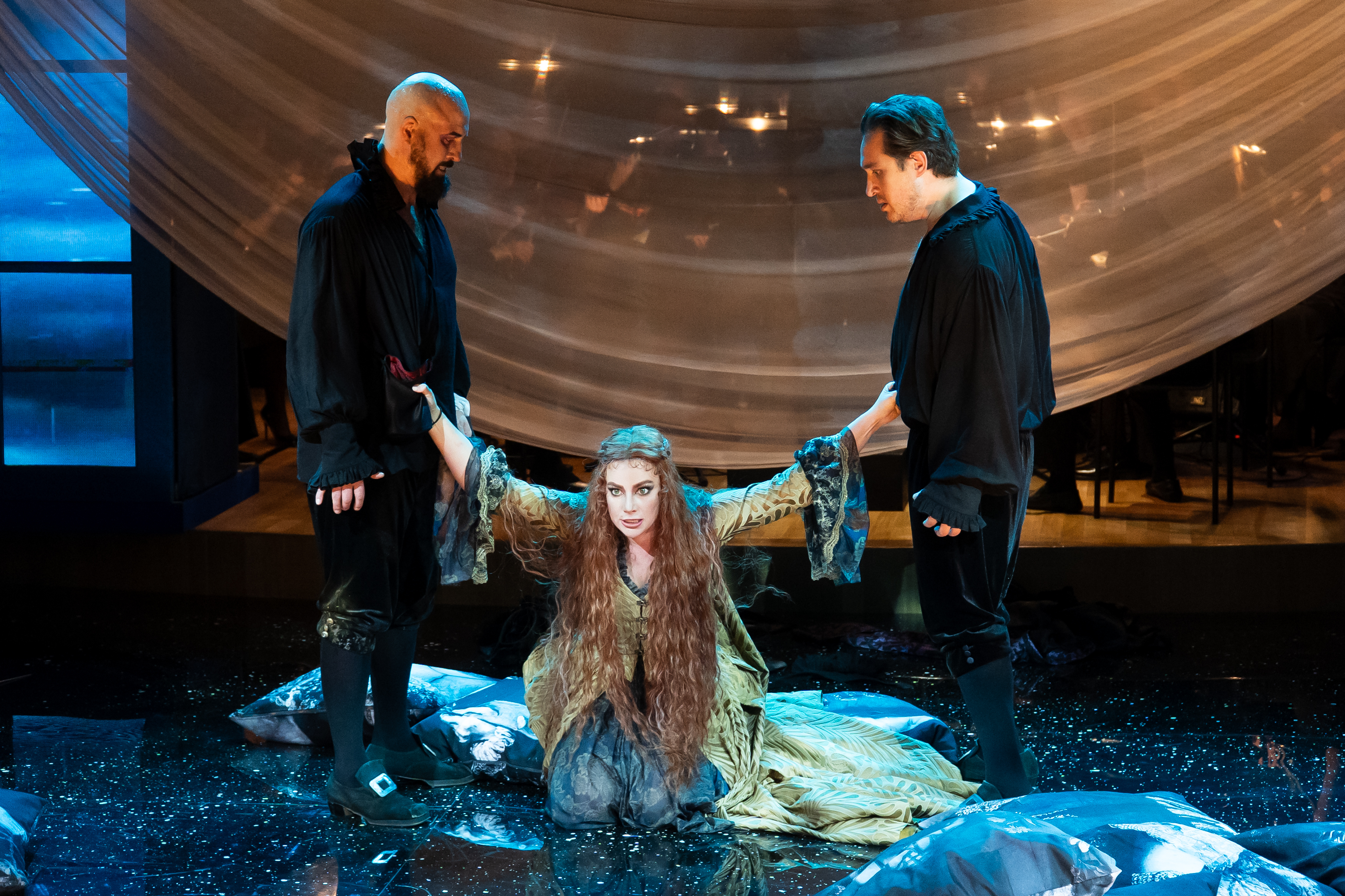 Режиссер Илья Ильин не перемудрит с мизансценами. Художник Ростислав Протасов подпустит символизма — раскинет за «окнами» Венецию (куда и отсылает оригинальный сюжет), сделав акцент на ее водах с намеком на омут, в котором известно кто водится, а в «доме» на черный помост набросает черных подушек с изображениями белых рук и лиц, что явно неспроста: это след тех, кто до того почивал здесь в объятиях ненасытной Маддалены. Сама героиня — рыжая, в пышных ренессансных одеждах, в каких выводила ее в своей пьесе фон Ливен. Лицом — на загляденье, пусть и прикрыто оно несколько натужно «маской» демонического. Голосом тоже красавица, мастерством — притом что партия сумасшедшая по диапазону и экспрессии — почти идеал. Такова была, по крайней мере, Ольга Толкмит, одна из четырех исполнительниц титульной партии. В «супруги» ей дали Давида Посулихина, мастерски погружающего в нирвану своими истаивающими фальцетными верхами и выразительностью в изображении каждого изгиба чувств. В «любовники» определили брутального Дмитрия Янковского. Совершенству его сценического образа мешало одно: певец буйствовал с первой до последней ноты. Объяснение как будто находилось: его персонаж определенно был в аффекте, доведенный чуть не до сумасшествия спонтанными явлениями загадочной особы, которую за власть над собой называет колдуньей, — но большего разнообразия красок хотелось бы. Хорош был, наконец, оркестр под управлением Валерия Кирьянова — стройный, пряный, знающий свое место (то бишь перманентно памятующий о балансе вокальных и инструментальных сил). Но ко всей этой красоте полагался еще и эффектный бантик, довершающий облик постановки.