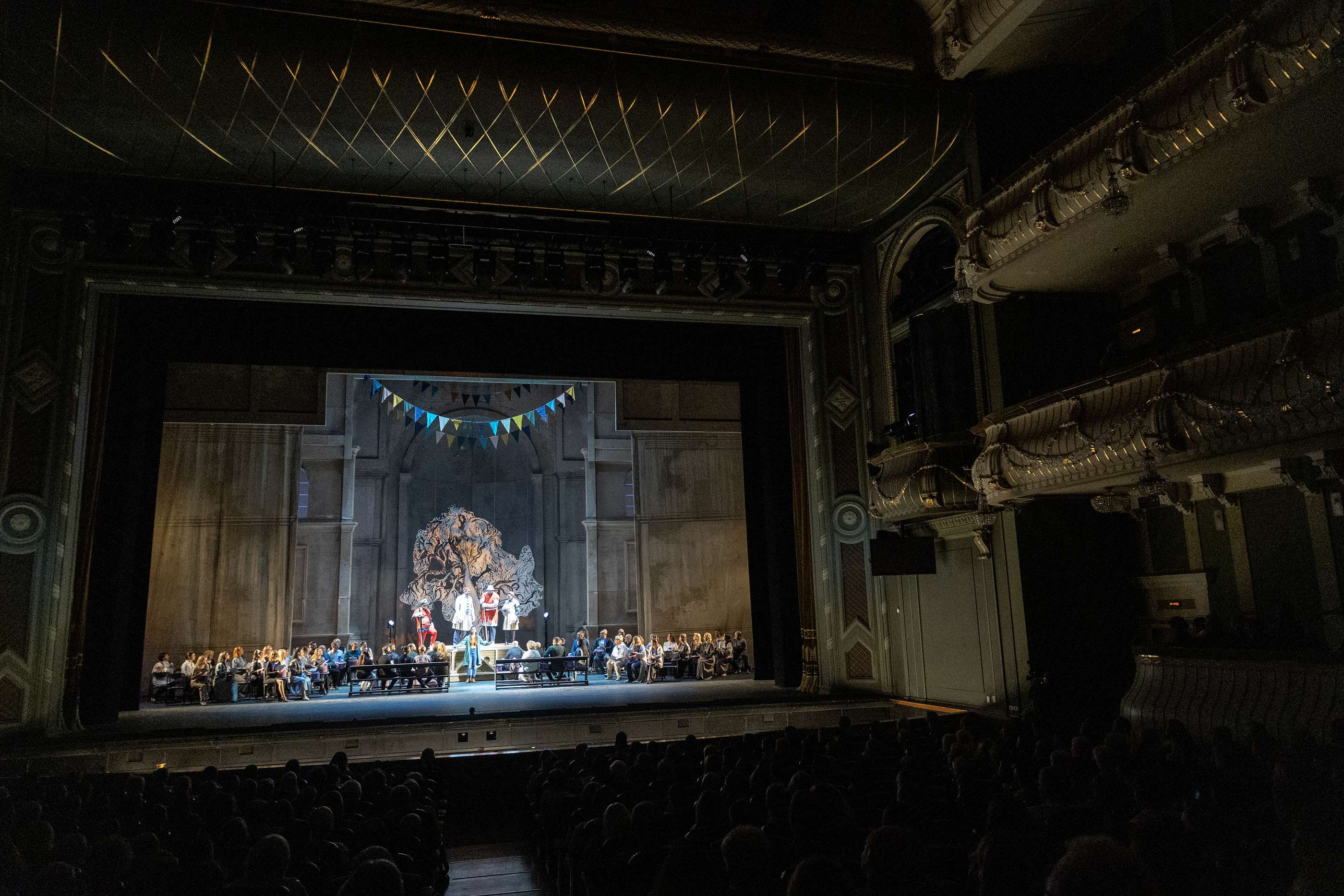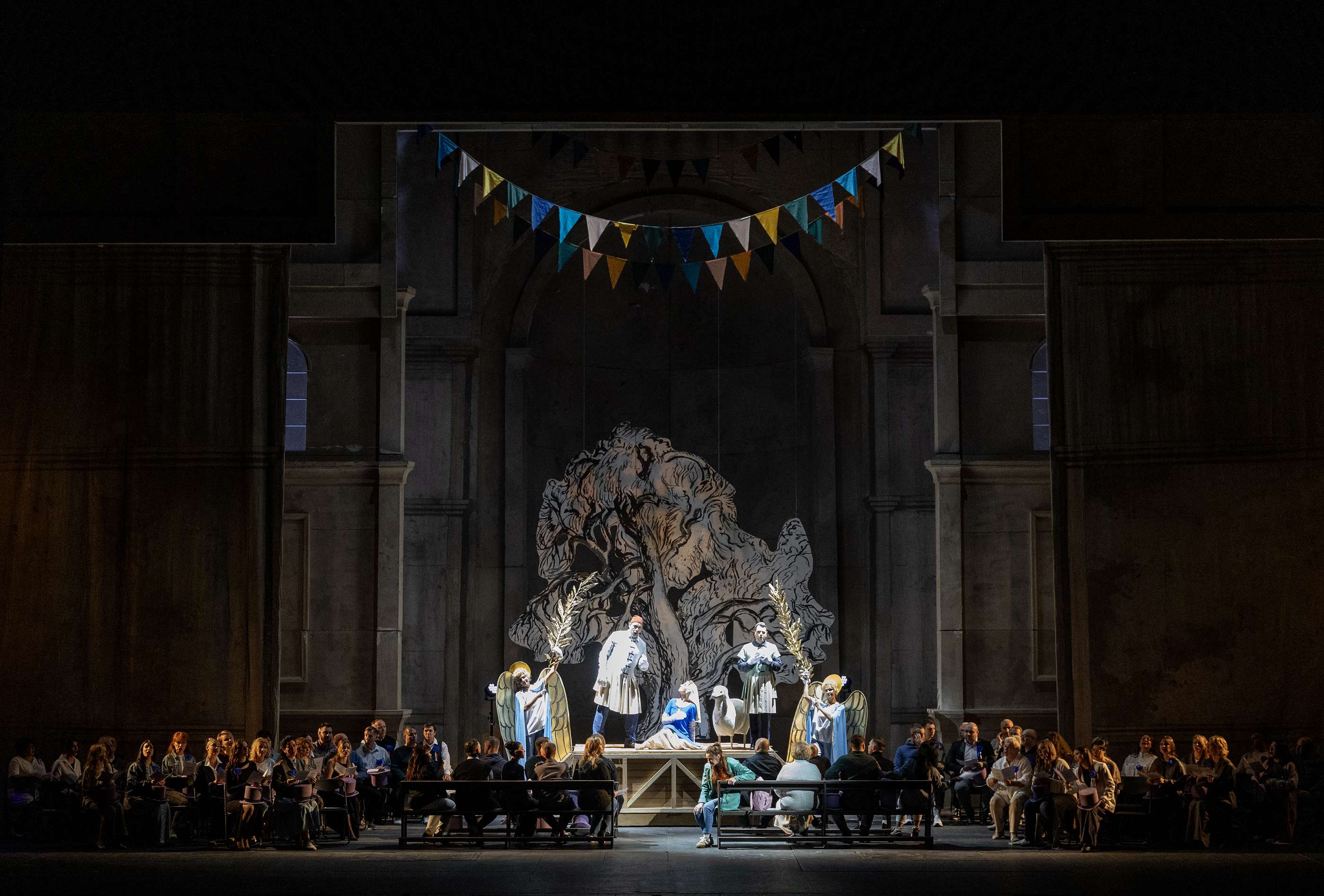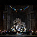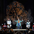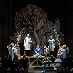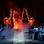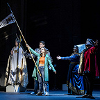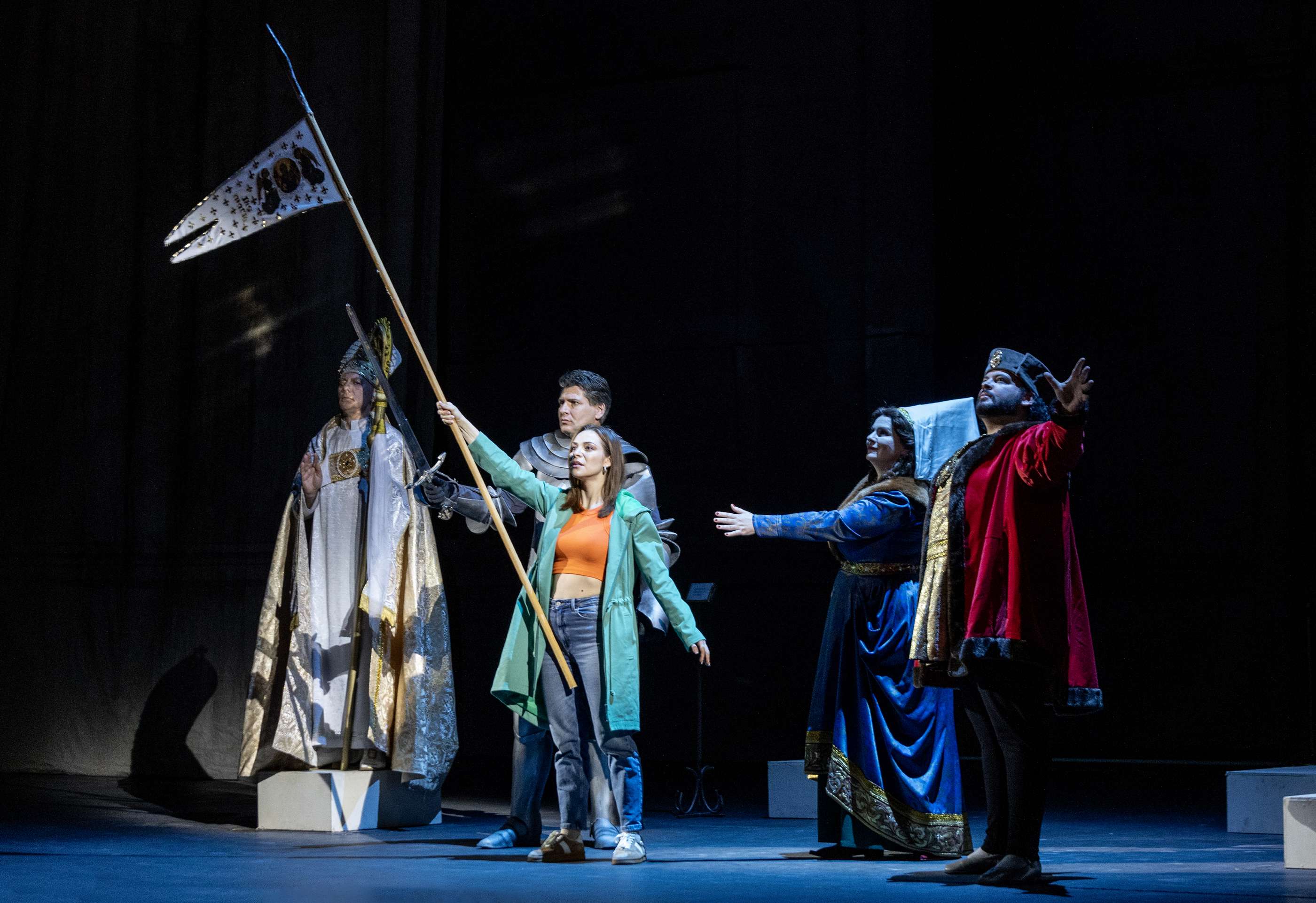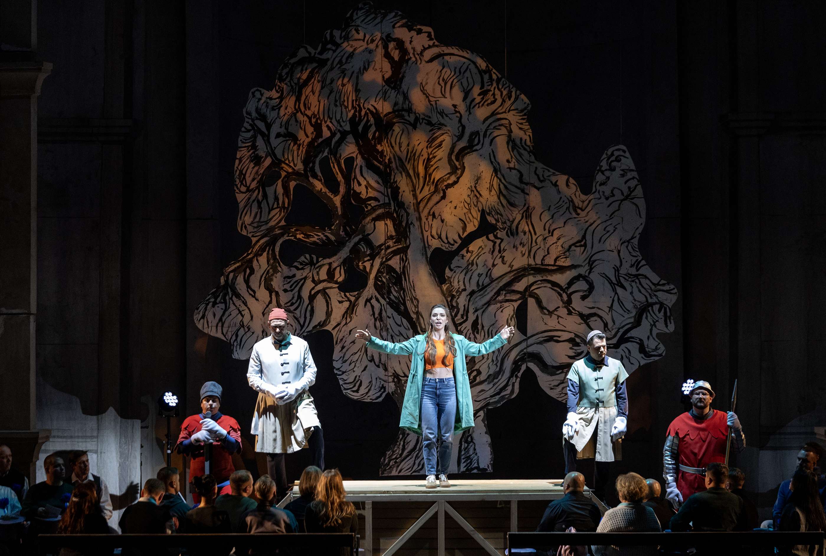 Другие артисты предлагают образы более традиционные и, как следствие, более яркие, выпуклые – возможно, им помогают исторические костюмы (по большей части они – участники разыгрываемой самодеятельной мистерии), а также внушительный сценический опыт. Мощные голоса именитых солистов – Анастасии Москвиной (Агнеса), Дмитрия Шабети (Король), Станислава Трифонова (Тибо), Владимира Громова (Дюнуа), Андрея Валентия (Архиепископ) – по-настоящему царят, запоминаются эмоциональной наполненностью и выразительностью, частично возвращая «Орлеанскую деву» на территорию героической гранд-оперá.