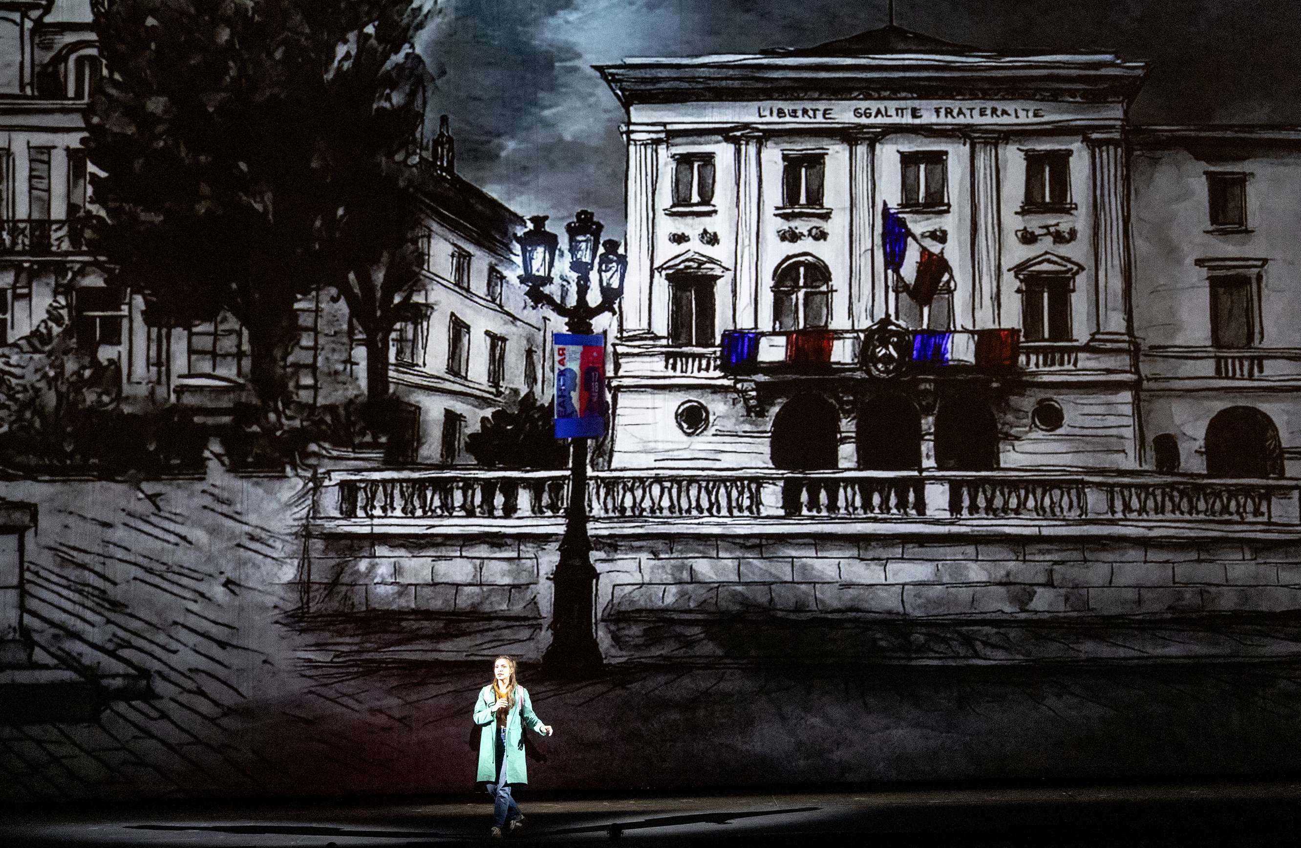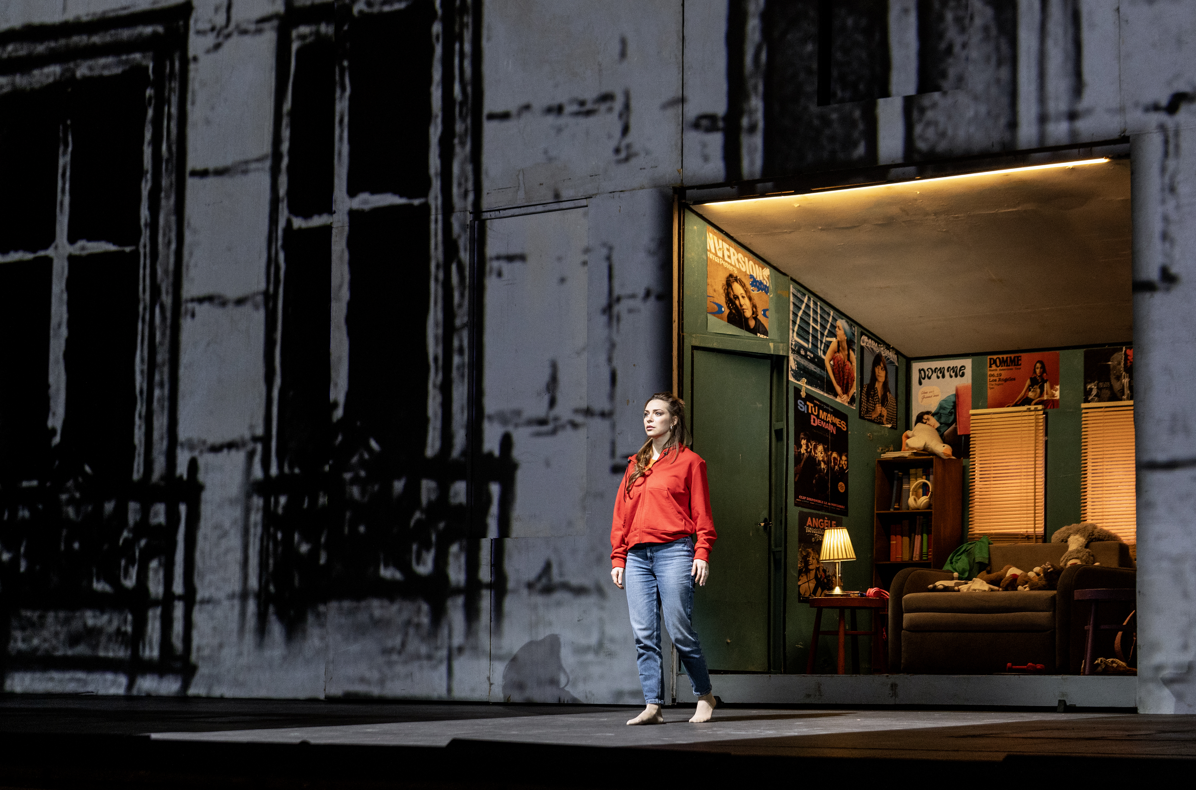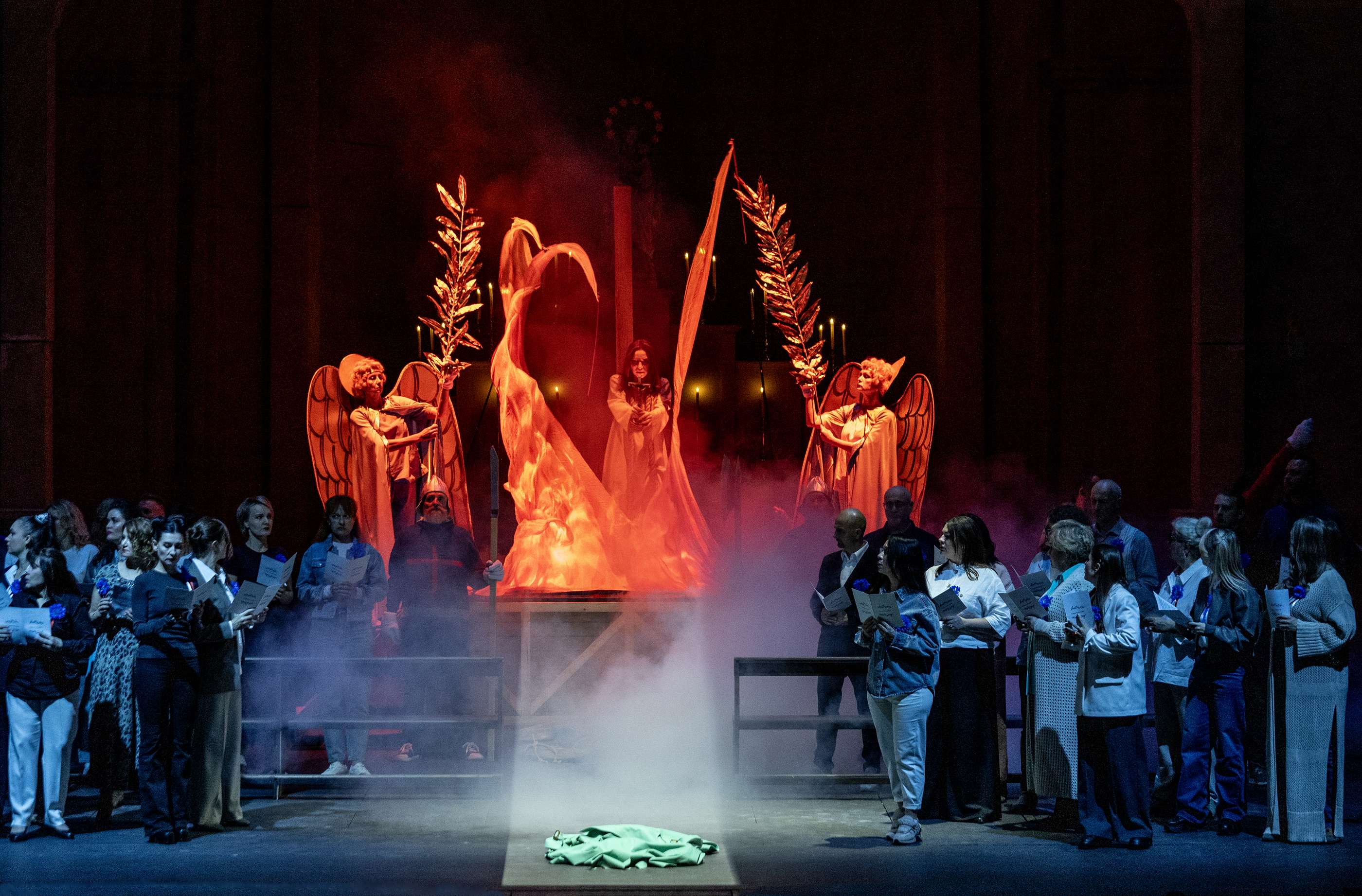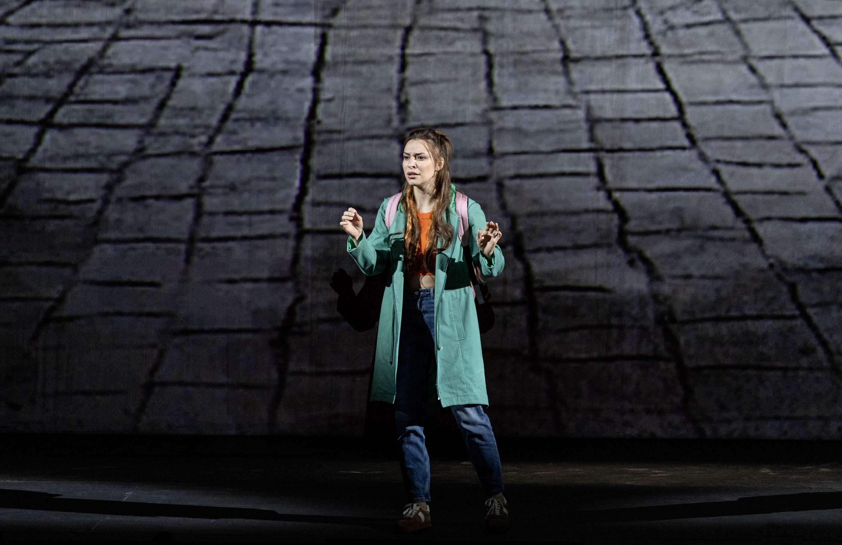 Спектакль Исаакяна – не о героине французского народа Жанне д’Арк (в опере, как известно, Иоанне), остановившей английскую экспансию под Орлеаном и безвинно сожженной на костре: сюжет проходит лишь фоном, от которого отталкивается постановщик. Главный персонаж здесь – студентка Жанна, уроженка городка Домреми (как и легендарная воительница), аутичная девушка. Жанну преследуют видения, в которых она отождествляет себя со знаменитой землячкой. Действие (сценография Алексея Трегубова) последовательно разворачивается в кафедральном соборе, где горожане разыгрывают мистерию об Орлеанской девственнице; на увешанных сувенирной символикой и рекламными плакатами улицах современного Домреми, по которым в одиночестве блуждает страдающая диссоциативным расстройством идентичности Жанна («прогулка» реализована средствами компьютерной видеографики Арины Шлыковой); в музее восковых фигур, где студентка встречается с ожившими статуями других персонажей оперы (Короля, Архиепископа, Агнесы Сорель и пр.); в университетском спортзале и, наконец, в клинике для нервнобольных.