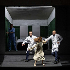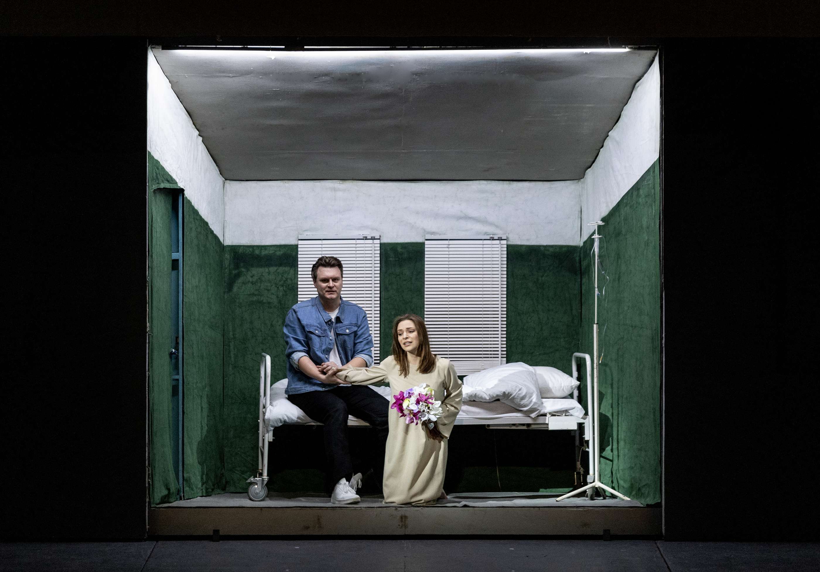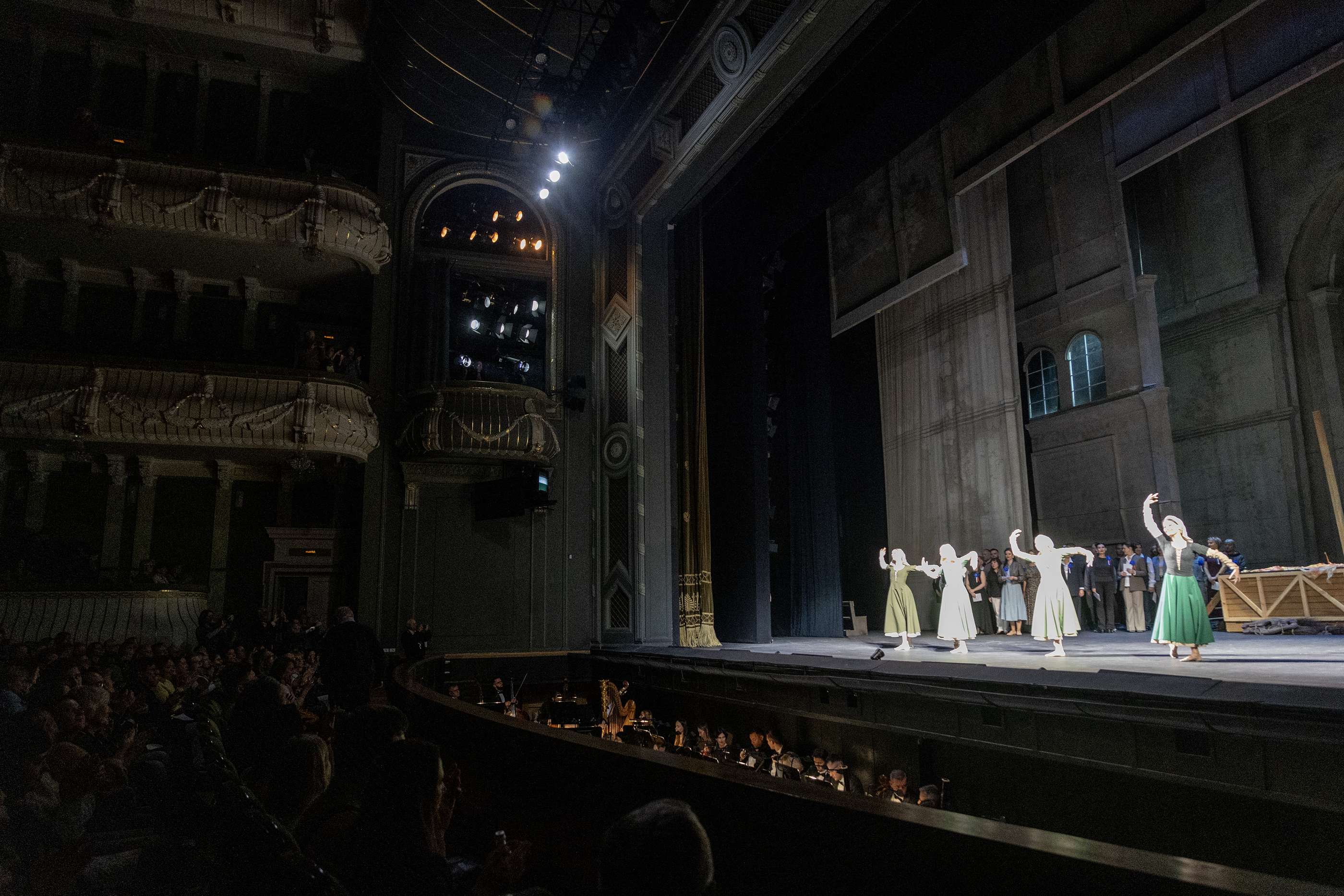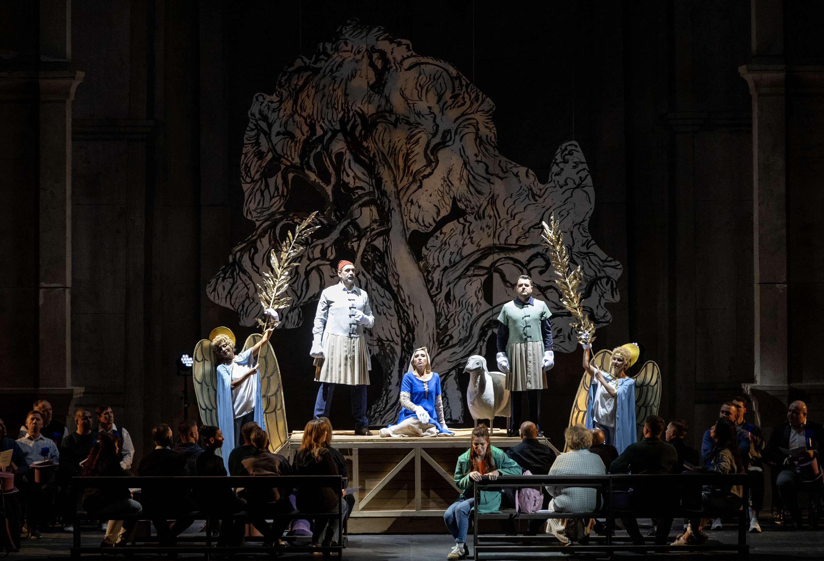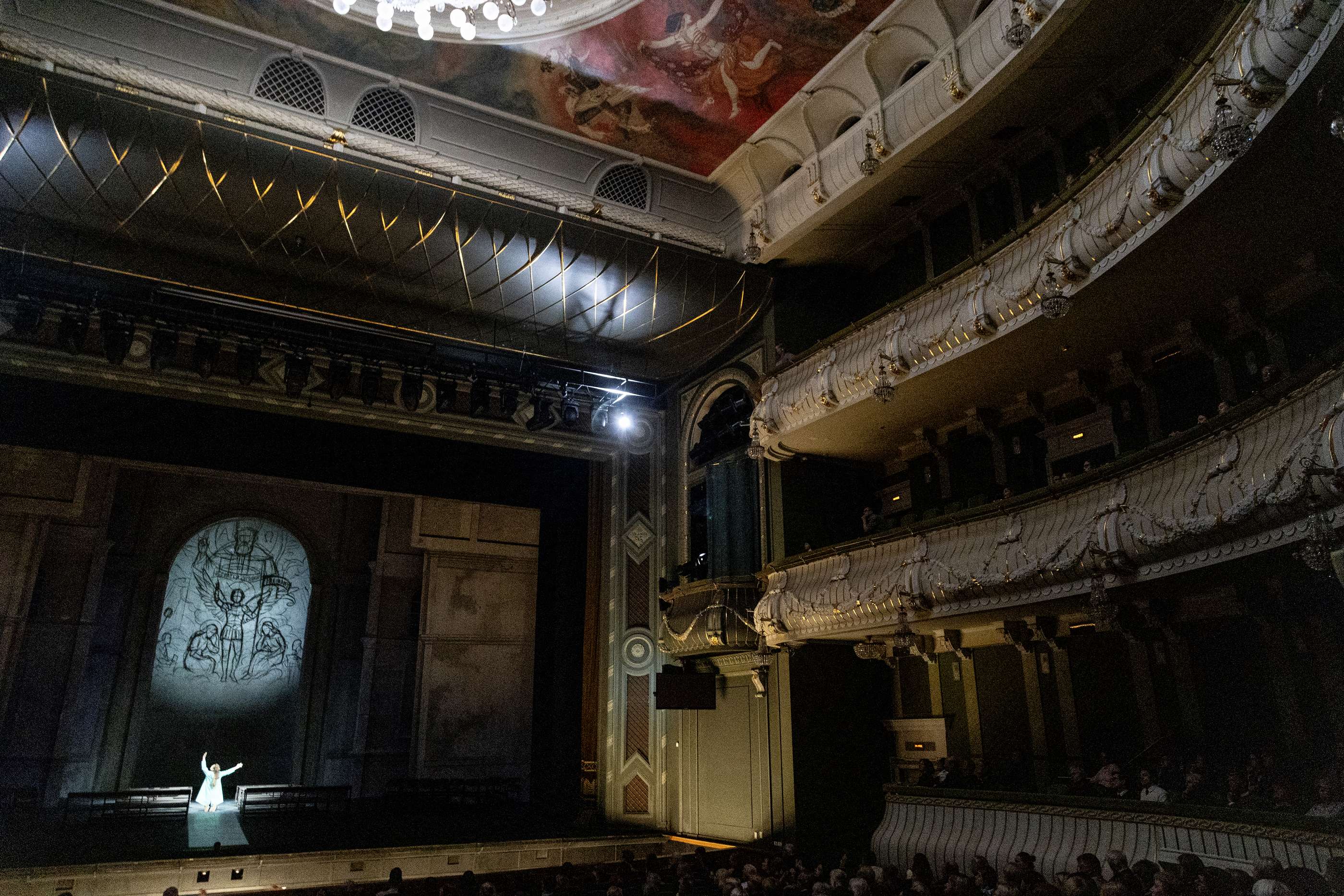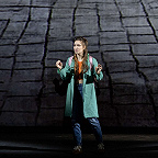 Концепция частично повлияла и на музыкальный результат. Много страниц партитуры было купировано, темпы предложены умеренные или медленные, оркестровая игра – частенько без нерва, хотя и очень качественная (дирижер Артем Макаров). Хоры (хормейстер Нина Ломанович), поющие сами по себе тоже классно, нечасто появляются на сцене, звуча больше с балконов, из-за чего пострадали многие поэтические строфы, весьма, кстати, вдохновенные (титры в спектакле не предусмотрены). А самое главное – концепция потребовала не выводить на сцену харизматичную героиню, ведь субтильная аутистка в джинсах, топике и вязаной шапочке едва ли годится на роль народного вождя и военачальника. Молодая солистка Дарья Горожанко поет Иоанну аккуратным высоким лирическим меццо, ровным и красивым, иногда чуть напряженным на верхах – однако масштаба, мощного профетического посыла, мистериальной загадочности в этом образе нет совсем.