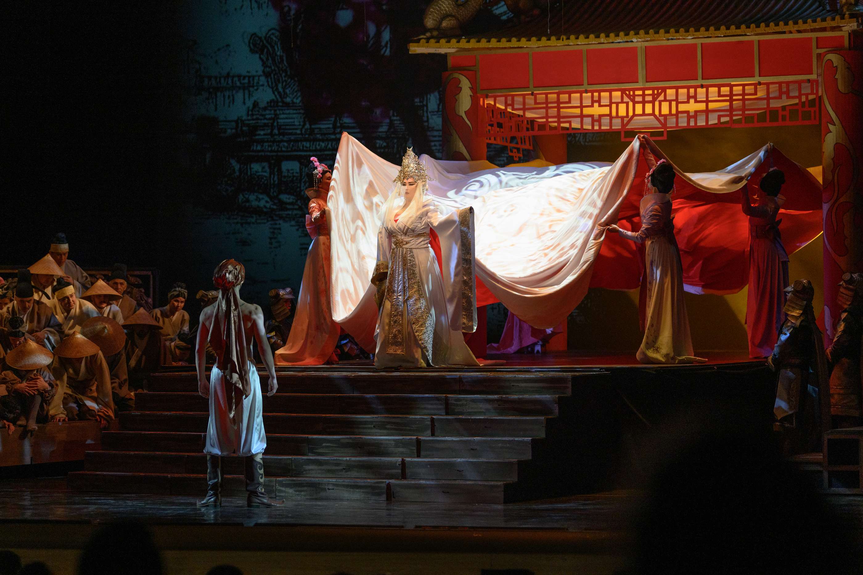 Еще один сюрприз – постановочная стилистика спектакля. На весьма небольшой сцене театра режиссер Николай Покотыло в содружестве со сценографом Эрихом Вильсоном, художницей по костюмам Татьяной Кондрычиной, хореографом Дмитрием Пимоновым и световиком Сергеем Шевченко создал пленяющее красотой сказочное действо, классическое в своей основе, повествующее о традиционном Китае (или наших представлениях о нем). В центре, чуть в глубине, на невысоком ступенчатом подиуме – изящная пагодообразная беседка с неизменными драконами на углах крыши, по бокам от нее – две трибуны, на которых располагается любопытствующий плебс, за ними же время от времени прячутся пришельцы из Татарии (Калаф, Тимур и Лиу). Все просто, компактно, но необходимые акценты расставлены – у публики полное ощущение, что она заглянула за стены знаменитого Запретного города. Меняются задники, напоминающие традиционную для Поднебесной живопись тушью по шелку, – они не только добавляют экзотики, но и «реагируют» на события: в остродраматические моменты изображения становятся инверсионными, как на фотонегативе.