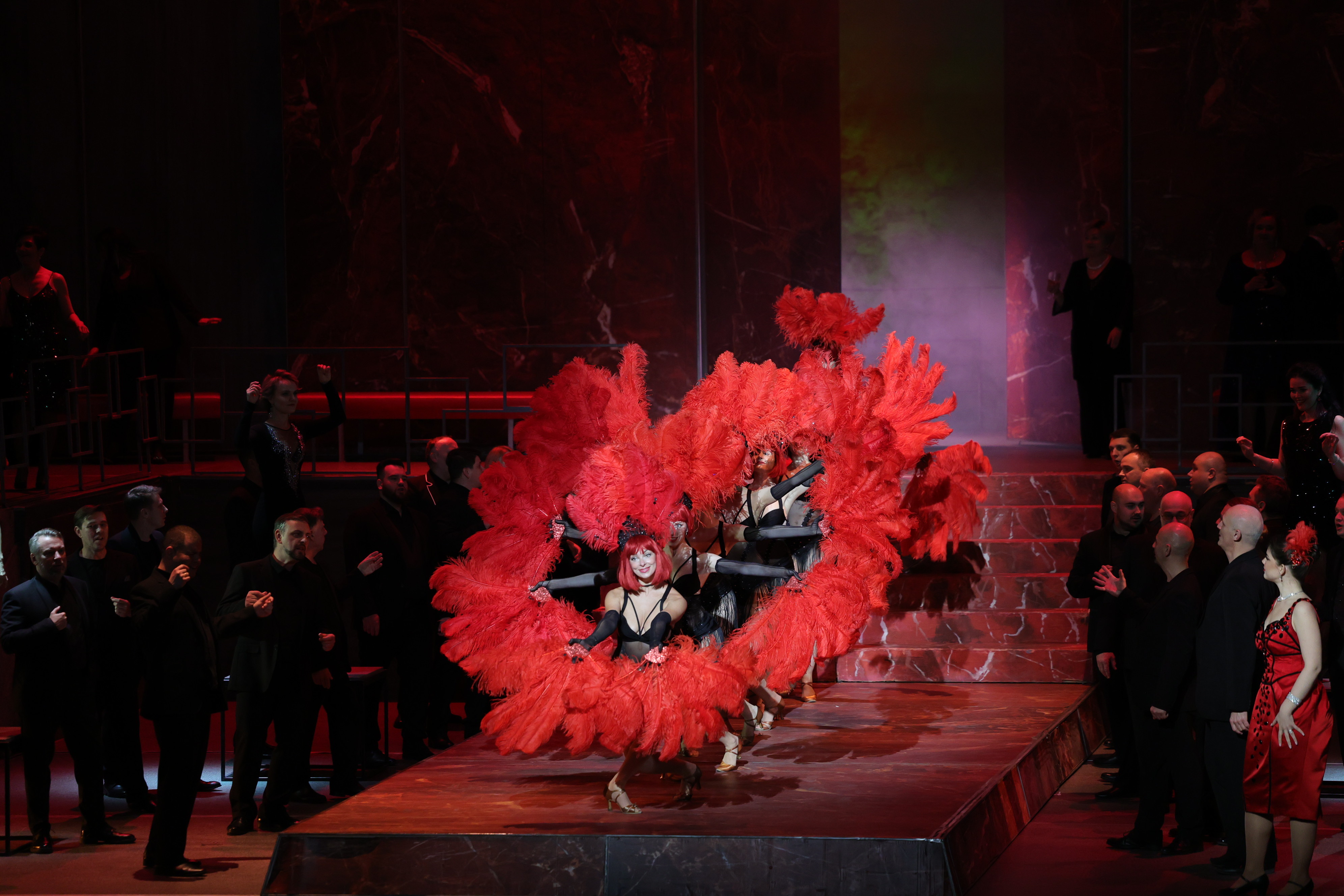 Действие перенесено в Париж XXI века (в Риге это были 1950-е), сюжет разворачивается практически в одной и той же декорации (с незначительными модификациями в третьем акте) – некоем уныло-утилитарном современном пространстве, не то в отеле, не то в клубе, с мебелью в стиле функционализма и обитыми фанерными панелями объемами. Когда в первом действии гости покидают вечеринку и куртизанка остается одна в окружении своих грез, то, учитывая огромные размеры сцены белорусского Большого, а стало быть, размах ее апартаментов и стилистику их декора, возникает стойкое ощущение, что Виолетта Валери проживает как минимум в фойе Кремлевского дворца съездов. Вместо туберкулеза она страдает от онкологии, но если об этом не прочитать в синопсисе, то догадаться невозможно, поскольку титры не дают никаких намеков (разве что Виолетта не кашляет, как в классических версиях). Зато они существенно подкорректированы там, где картинка уж сильно разнится с текстом либретто: например, они ничего не говорят о цыганах и матадорах, поскольку вместо них предстают полуголые красотки в перьях и с веерами а-ля танцовщицы из «Мулен Руж». (Вот они уж точно из рижского спектакля – правда, там их одеяние было куда более откровенным; для Минска постановщики предложили «пуристский» антураж.)