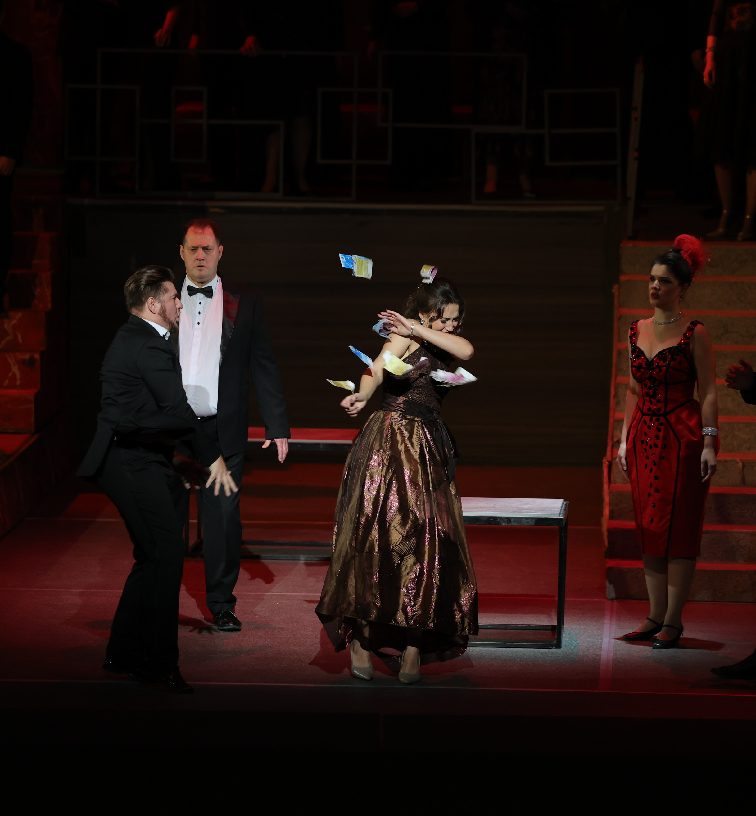 «Травиату» переодели в современное – что это дало мелодраме Верди? Прежде всего – ощущение когнитивного диссонанса: да, сама фабула, то есть история дамы с камелиями вполне может иметь место и сегодня, однако все остальное в опере противится такому переносу. Манеры, стиль поведения героев, характер их отношений, жесты, взгляды, мимика – абсолютно из другой эпохи, они вопиюще противоречат музыкальному строю, атмосфере творения Верди, рисующего романтическую картину (путь и с долей реализма – композитор знал цену нравам своих современников), в то время как зритель видит жестко-циничные будни дня сегодняшнего. Да, а где же мобильные телефоны и прочие гаджеты, если мы в XXI веке, – почему герои обмениваются письмами в конвертах и никогда не знают, где кто находится и когда и откуда кого ожидать?..