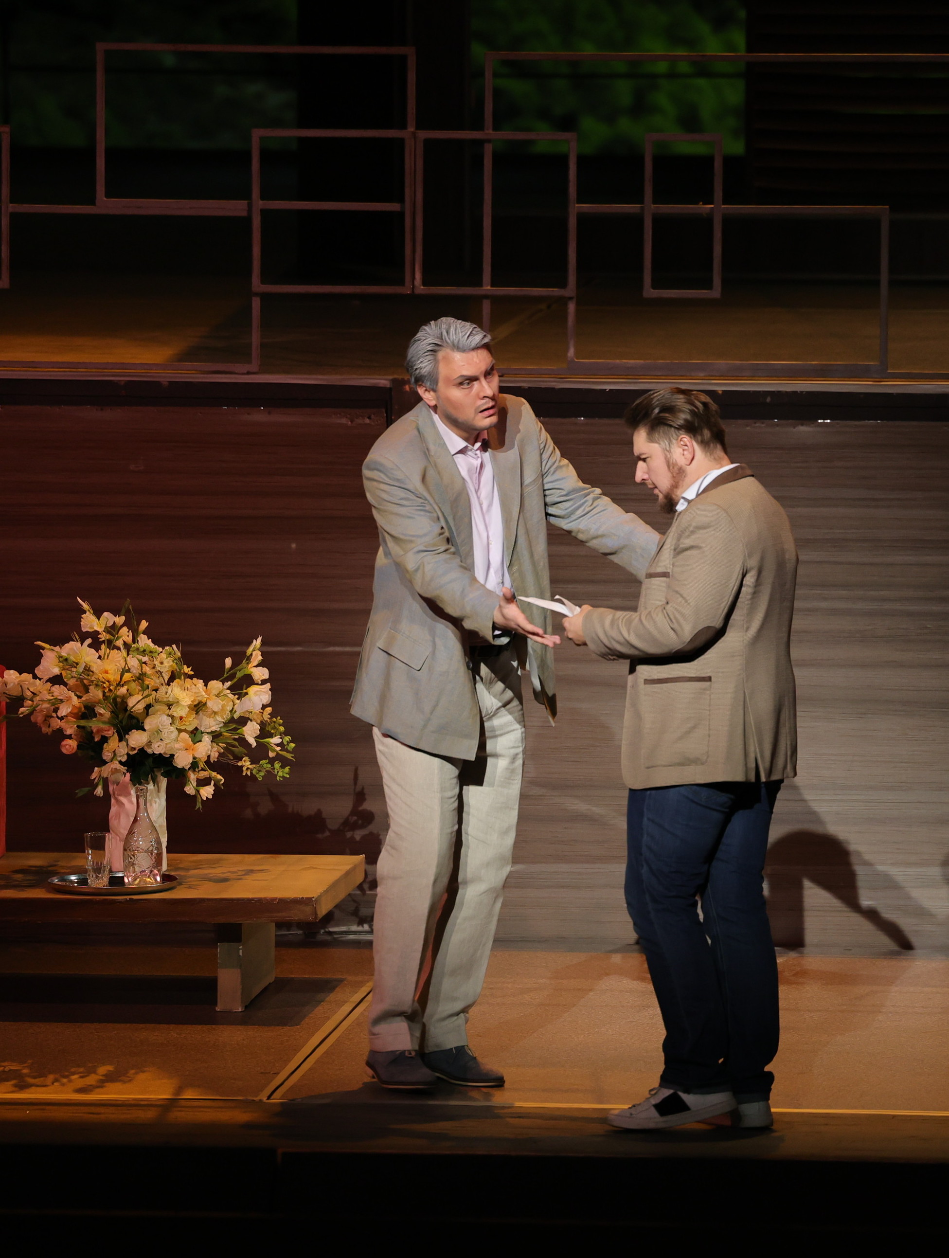 Александр Михнюк свободно чувствует себя в партии Альфреда – голосу хватает и изящества, и экспрессии. Образ увальня-тюфяка, создаваемый артистом, не захватывает романтической порывистостью (чего по традиции ждешь от возлюбленного Виолетты), но зато логично вписывается в непоследовательные, ребяческие действия его героя. Жермон Кирилла Панфилова убеждает жесткими, требовательными интонациями – плавная кантилена не его сильная сторона, но эмоциональные взрывы на ответственных высоких нотах солисту очень удаются.