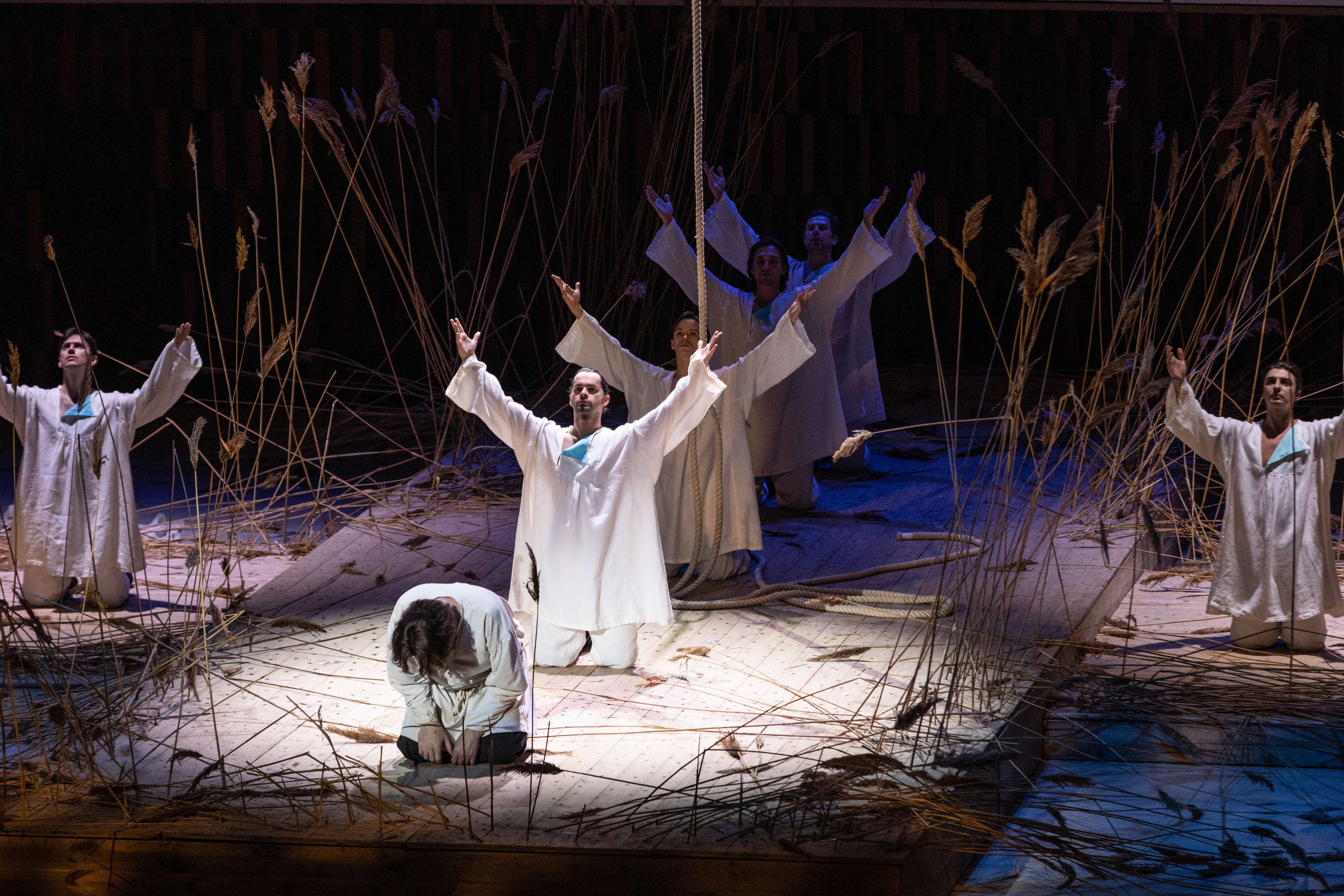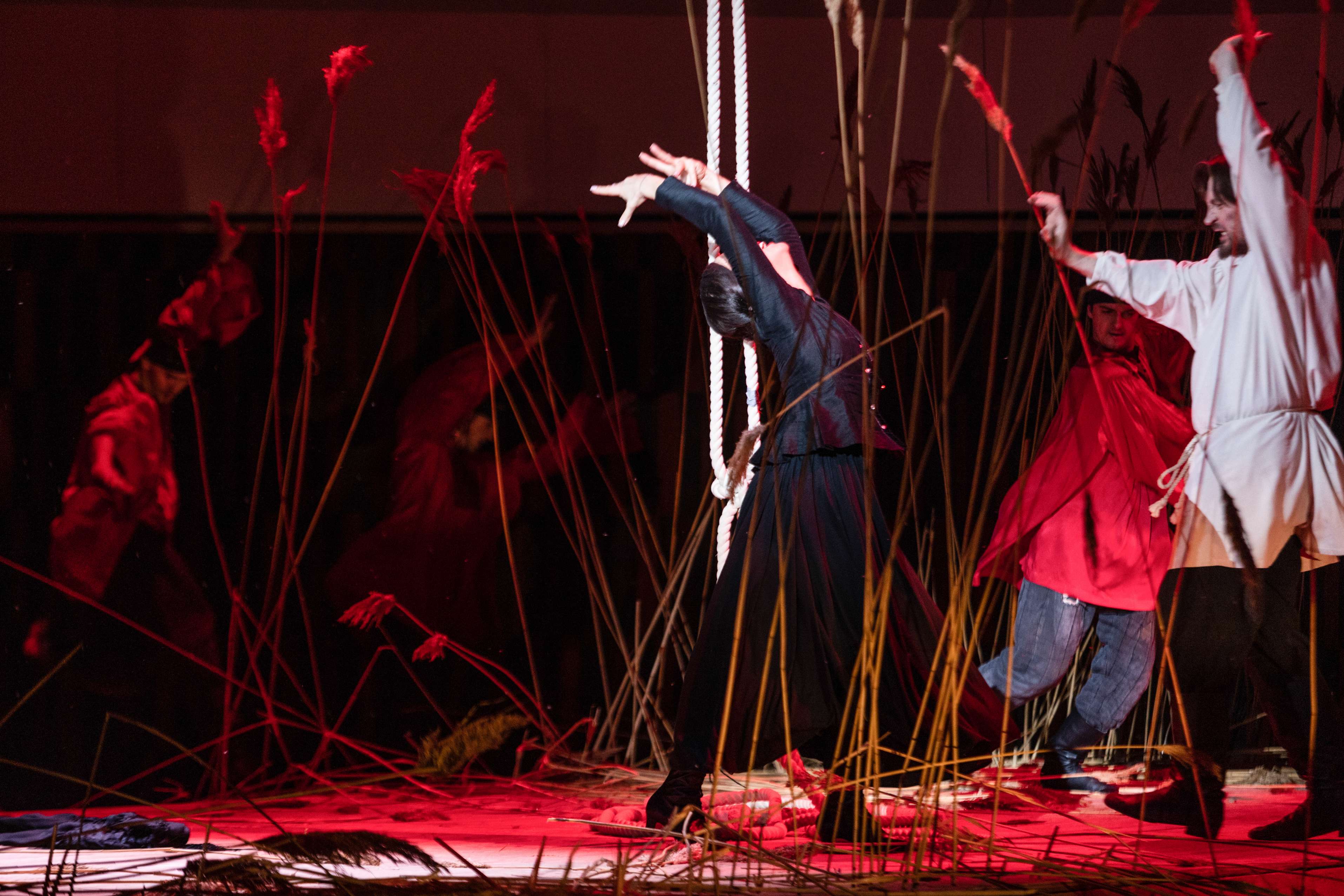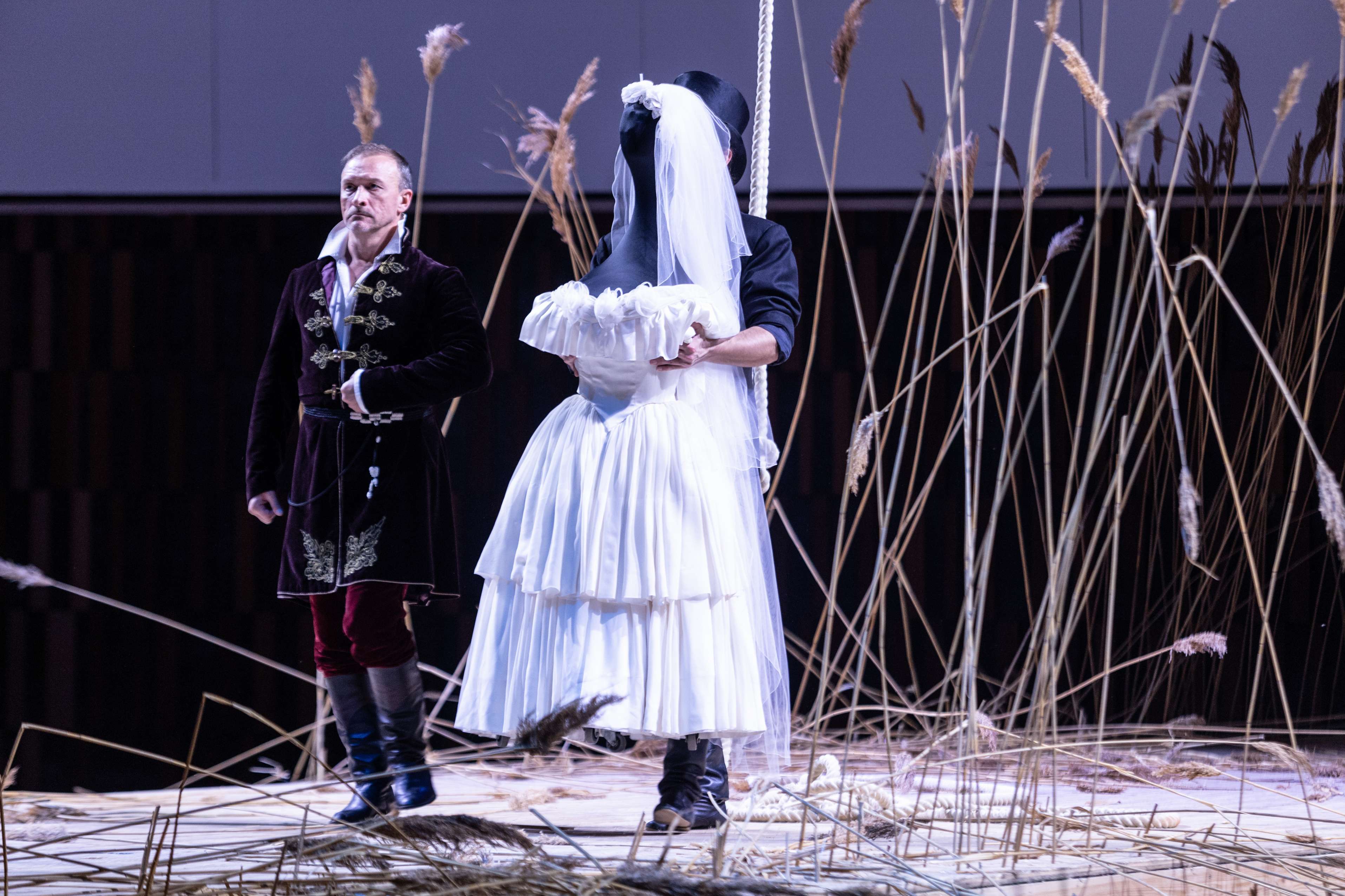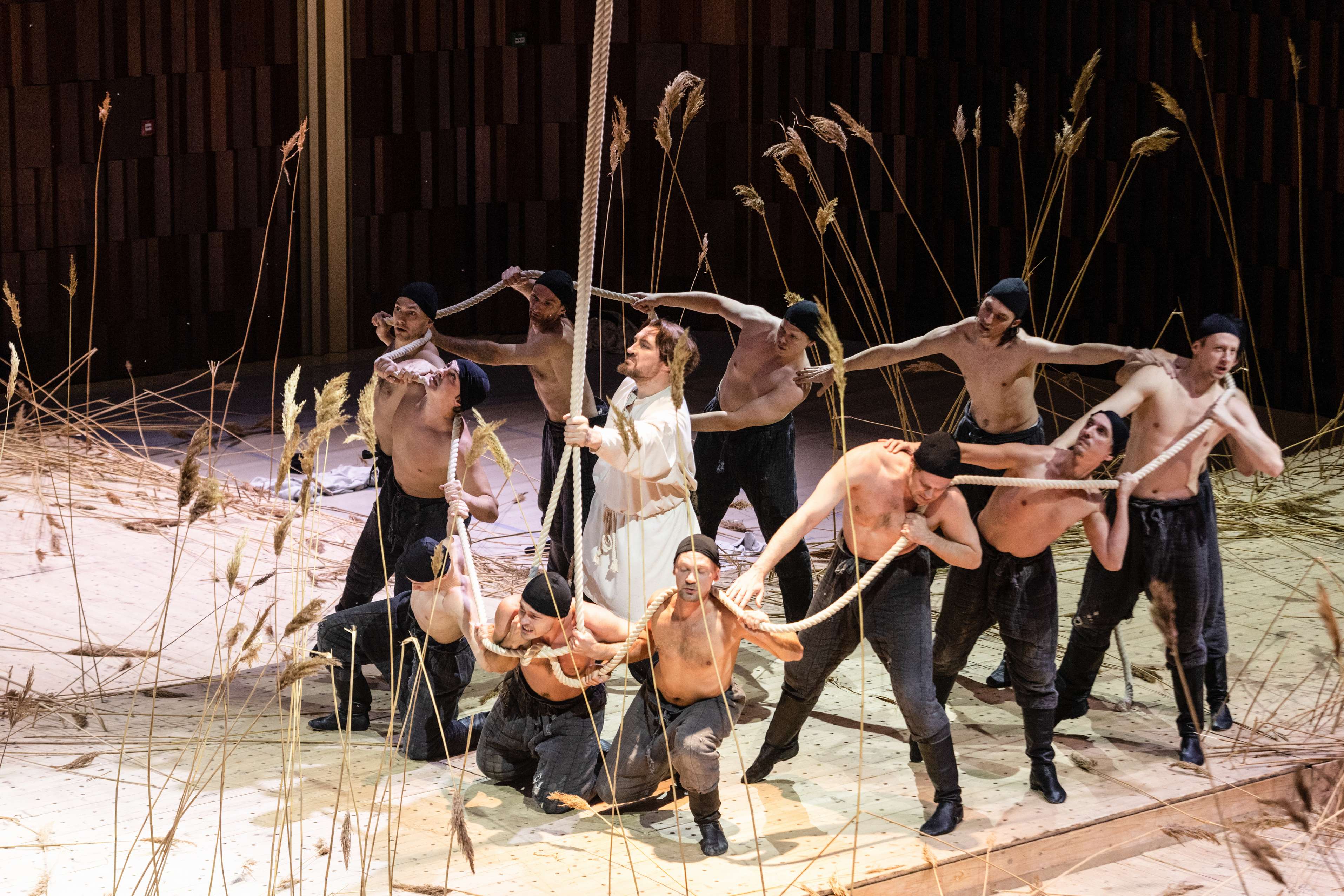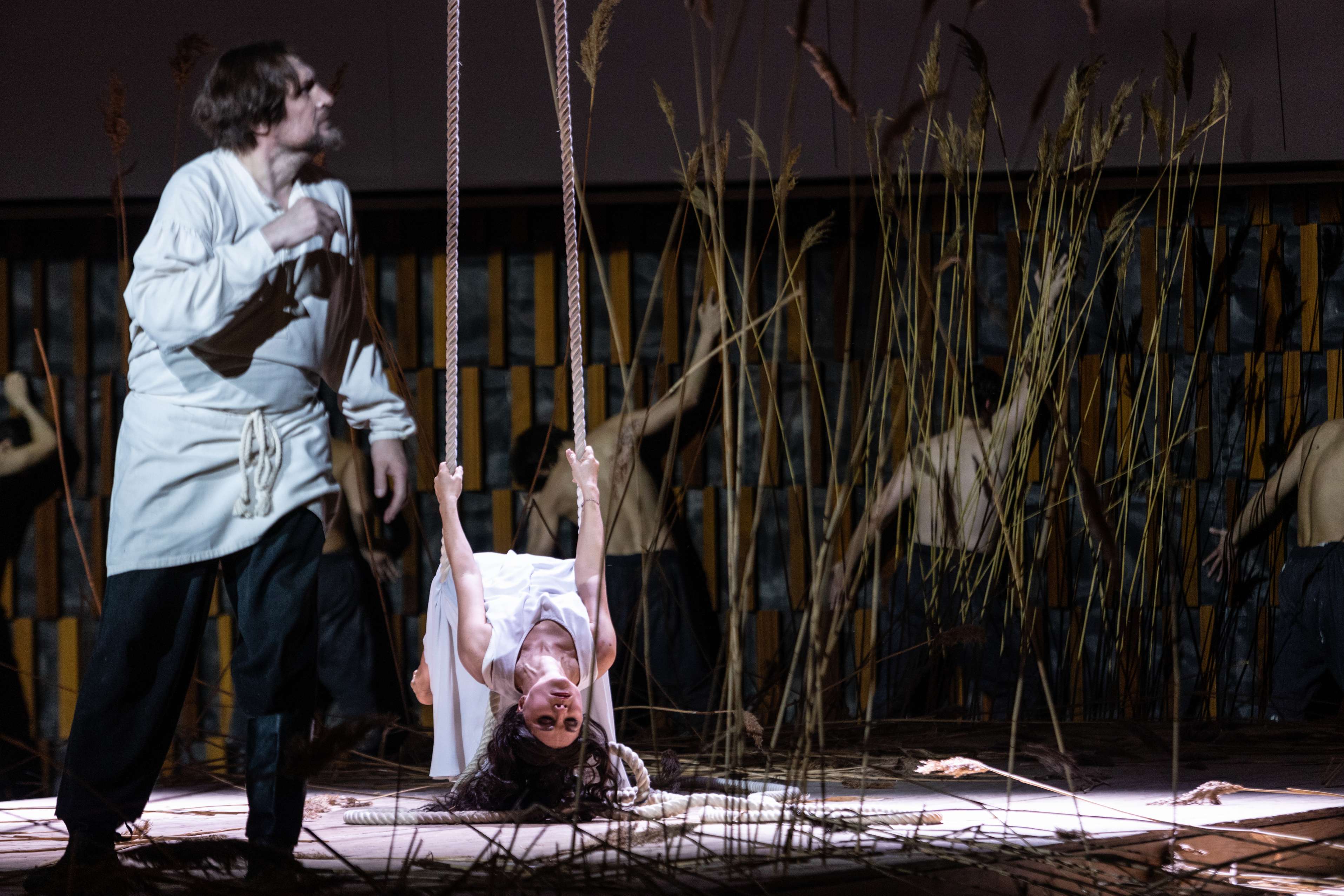 Все, что напридумывал художник Александр Орлов, будет в строку. Вот помост в виде креста, очерченный по краям рядами сухого тростника (это про то, что мы на Валааме). Но стебли скоро от набегов иноверцев сломаются, и тихий хруст под ногами артистов будет слышен на протяжении всего спектакля. Кто б мог представить, что этот звук войдет в музыкальную ткань оперы, как родной! И веревка, спускающаяся из-под сценического поднебесья, сколько раз доскажет нужное: то она татарский аркан, то смертная петля, манящая героя, то паутина, в которой запутается несчастная, брошенная Князем цыганка Груша. Даже хор, одетый по-монашески и рассаженный в зрительских рядах над сценой, окажется словно частью какой-то древней иконы или фрески, с которой сонм святых глядит на мающихся человеков. Но, конечно, не просто глядит, а тихо плачет, утешительно воркует, предупреждает о чем-то страшном, и всё — на том невероятном музыкальном языке, который, кажется, никому не может быть понятен, кроме русских. Однако ж чего только не бывает на свете: выплавлялся этот язык, чтобы перво-наперво поговорить с заокеанской публикой (заказ был от Лорина Маазеля и его Нью-Йоркского филармонического оркестра).