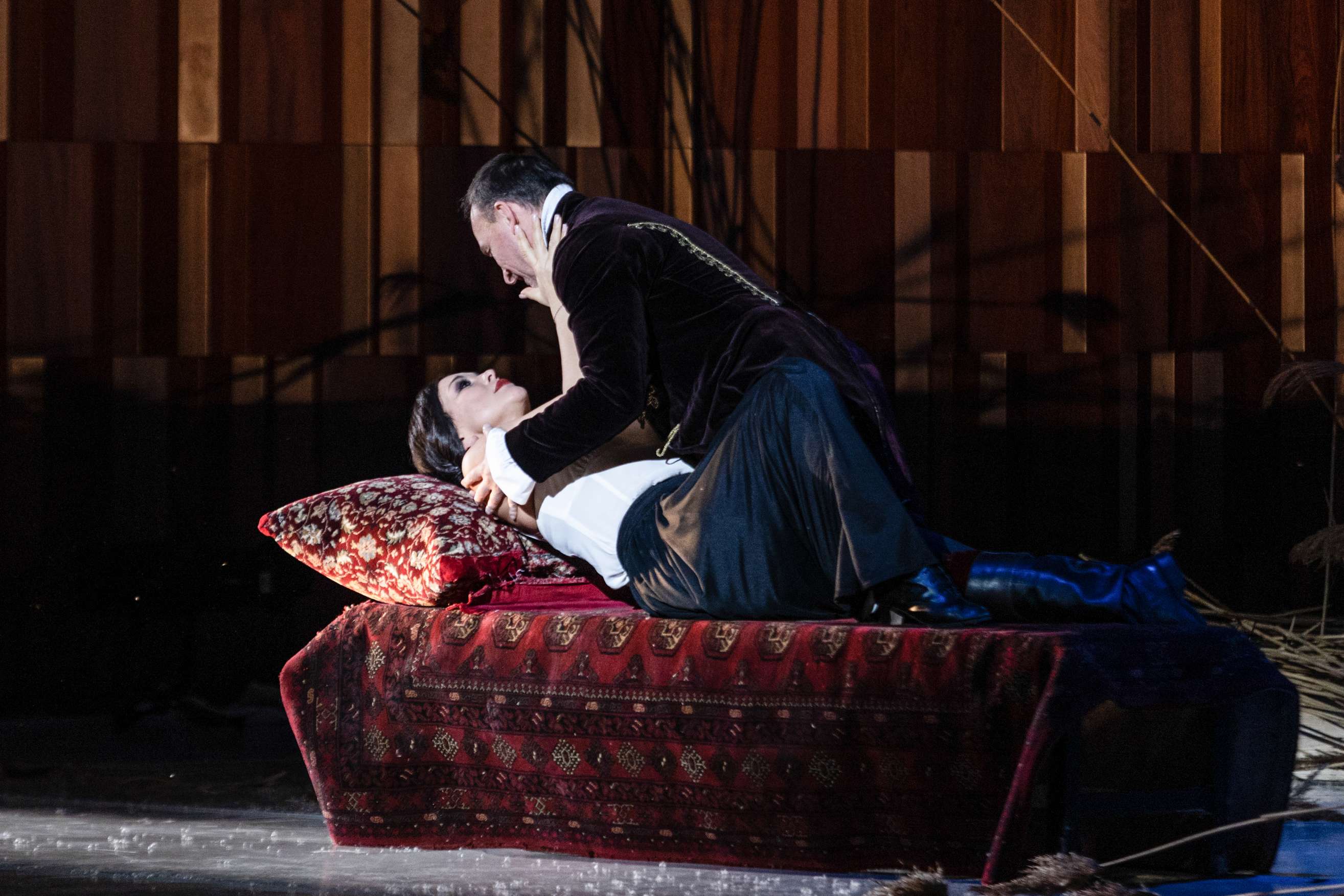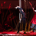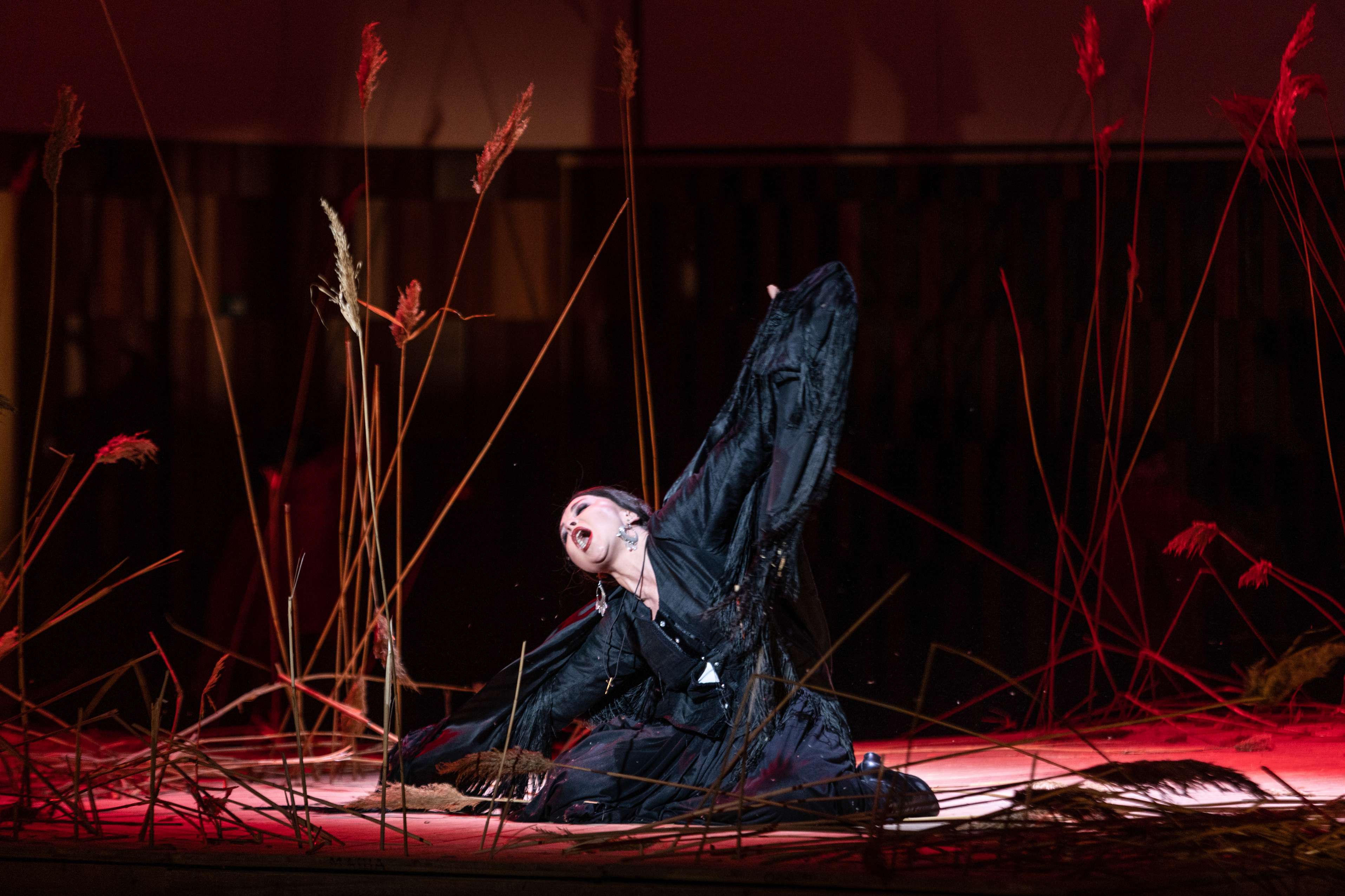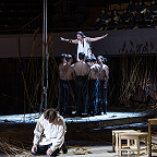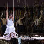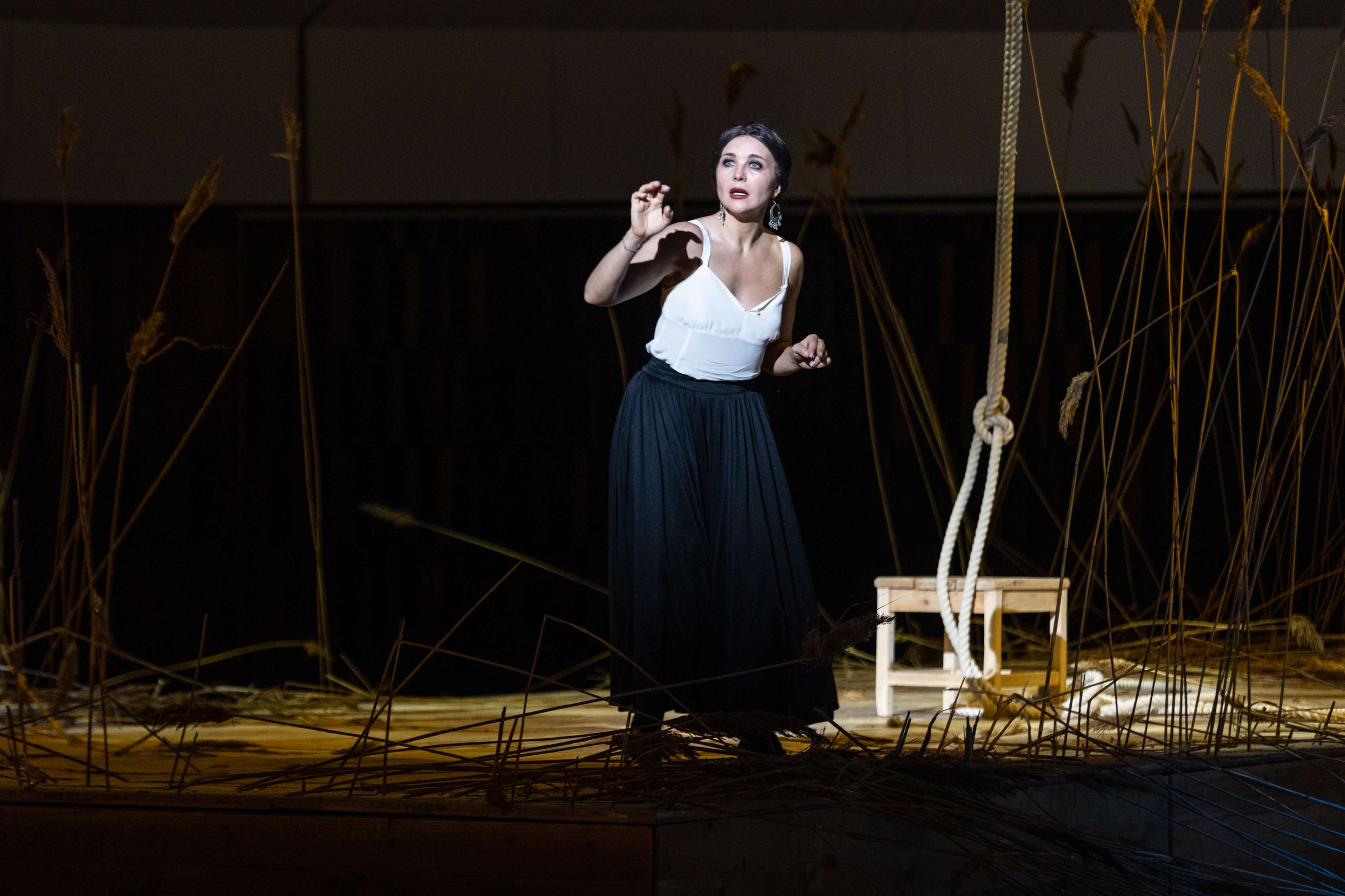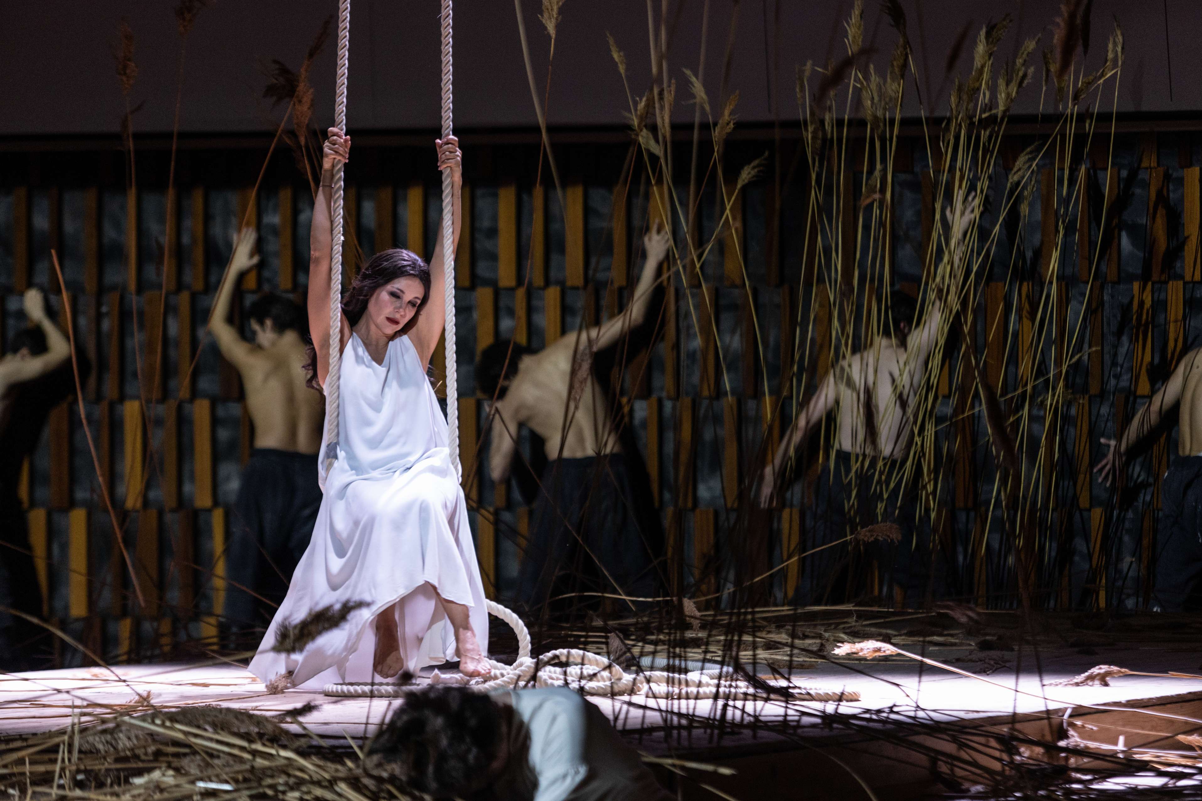 Все, что напридумывал художник Александр Орлов, будет в строку. Вот помост в виде креста, очерченный по краям рядами сухого тростника (это про то, что мы на Валааме). Но стебли скоро от набегов иноверцев сломаются, и тихий хруст под ногами артистов будет слышен на протяжении всего спектакля. Кто б мог представить, что этот звук войдет в музыкальную ткань оперы, как родной! И веревка, спускающаяся из-под сценического поднебесья, сколько раз доскажет нужное: то она татарский аркан, то смертная петля, манящая героя, то паутина, в которой запутается несчастная, брошенная Князем цыганка Груша. Даже хор, одетый по-монашески и рассаженный в зрительских рядах над сценой, окажется словно частью какой-то древней иконы или фрески, с которой сонм святых глядит на мающихся человеков. Но, конечно, не просто глядит, а тихо плачет, утешительно воркует, предупреждает о чем-то страшном, и всё — на том невероятном музыкальном языке, который, кажется, никому не может быть понятен, кроме русских. Однако ж чего только не бывает на свете: выплавлялся этот язык, чтобы перво-наперво поговорить с заокеанской публикой (заказ был от Лорина Маазеля и его Нью-Йоркского филармонического оркестра).