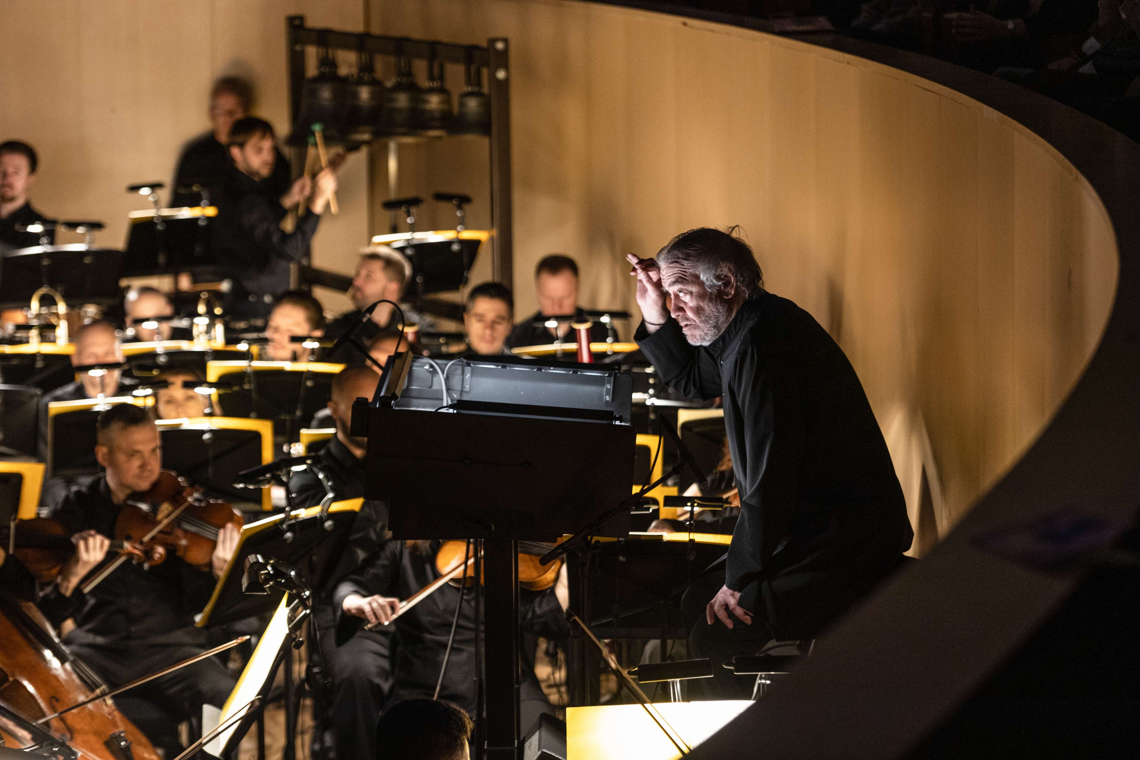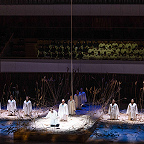 Оркестр в яме. Дирижера нет. В полной тишине почти тенями поплывут на сцену монахи, чтобы приступить к своим послушаниям — ловить рыбу (без удочки), копать огород (без лопаты), косить траву (без косы), само собой, молиться. Пластические, в замедленно-завораживающем темпе этюды сразу возьмут внимание на себя. А потому почти шоком будут вдруг зазвучавшие из ямы оркестровые пиано. Как, кто дал отмашку? Ясно, что Гергиев. Но его выхода мы не видели, и чтобы оркестранты кого-то приветствовали, не слышали. Дирижера как физического персонажа будто бы не было, и получалось удивительное — музыка изливалась, подобно свету небесному, сама по себе. Второе чудо спектакля: этой музыке ничто не вредило. Щедрин писал оперу исключительно для концертной сцены, и когда Гергиев, сначала в «правильном» формате исполнивший опус в Мариинском, через год решил делать спектакль, даже воспротивился: не разрушить бы хрупкий мир «Странника». Но не разрушили.