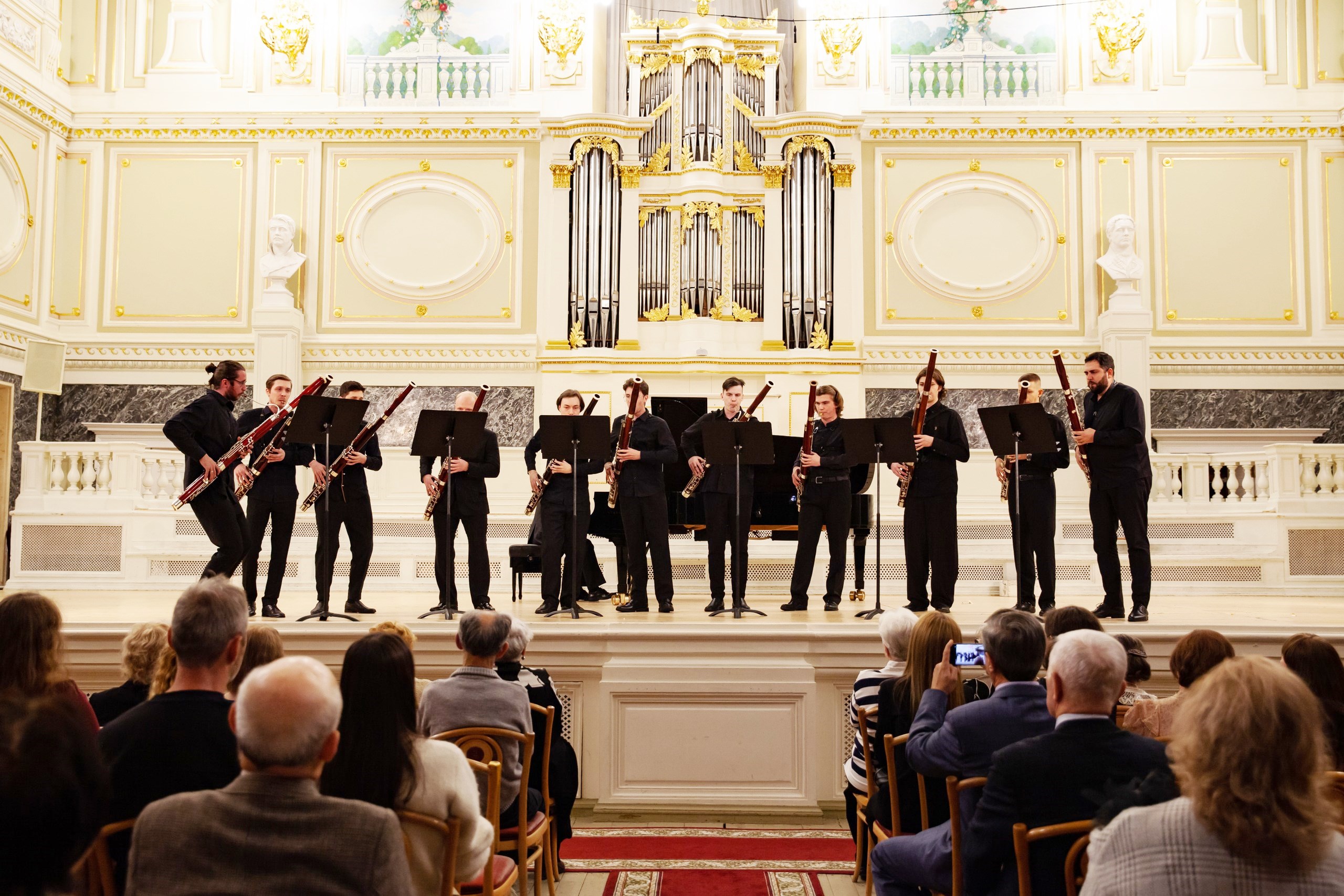 Внушительный ансамбль из 11 фаготов представил торжественные и величавые «Новороссийские куранты» Дмитрия Шостаковича – гимн города Новороссийска в переложении для ансамбля фаготов Сергея Жукова, исполнившего партию фортепиано.