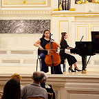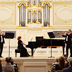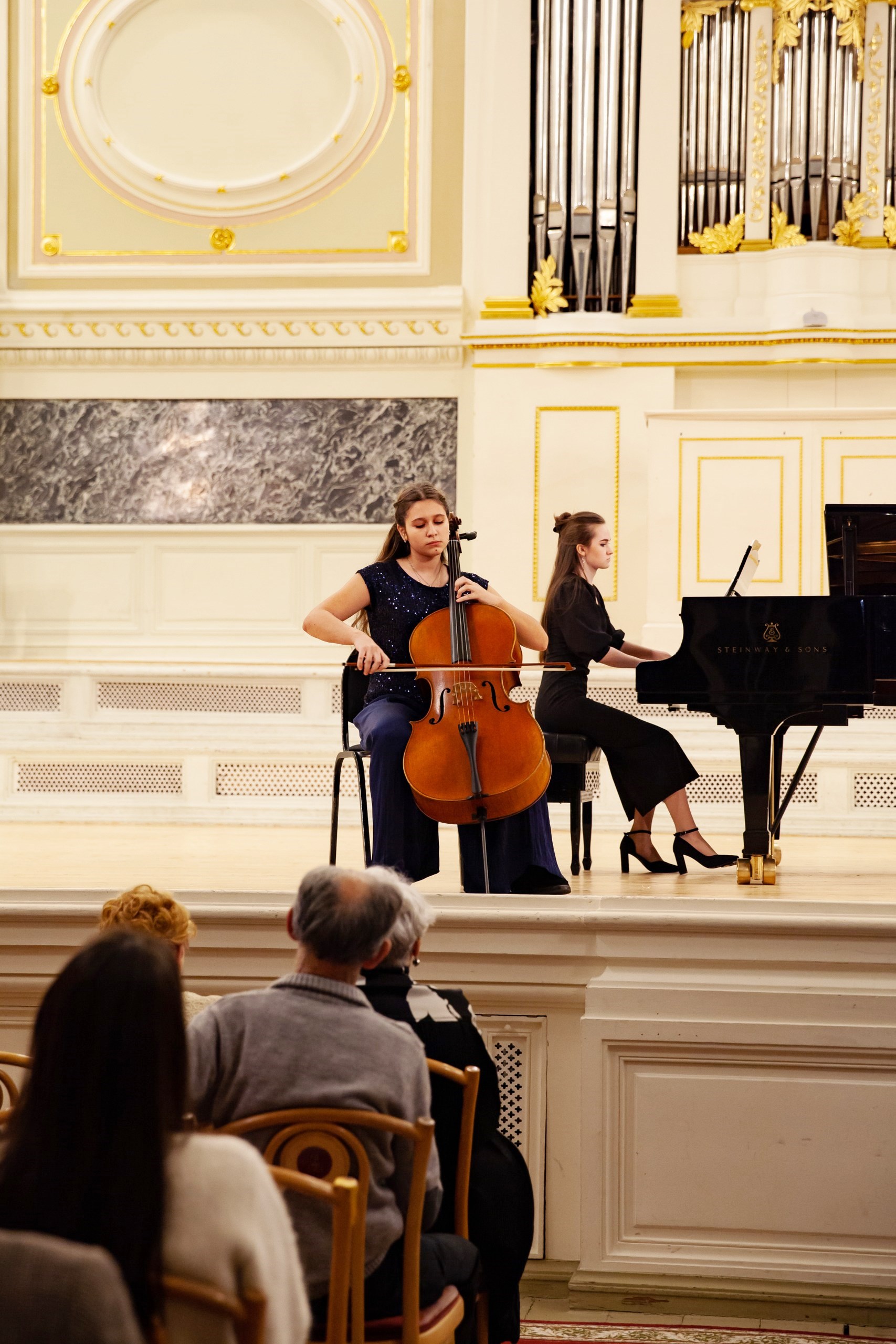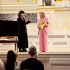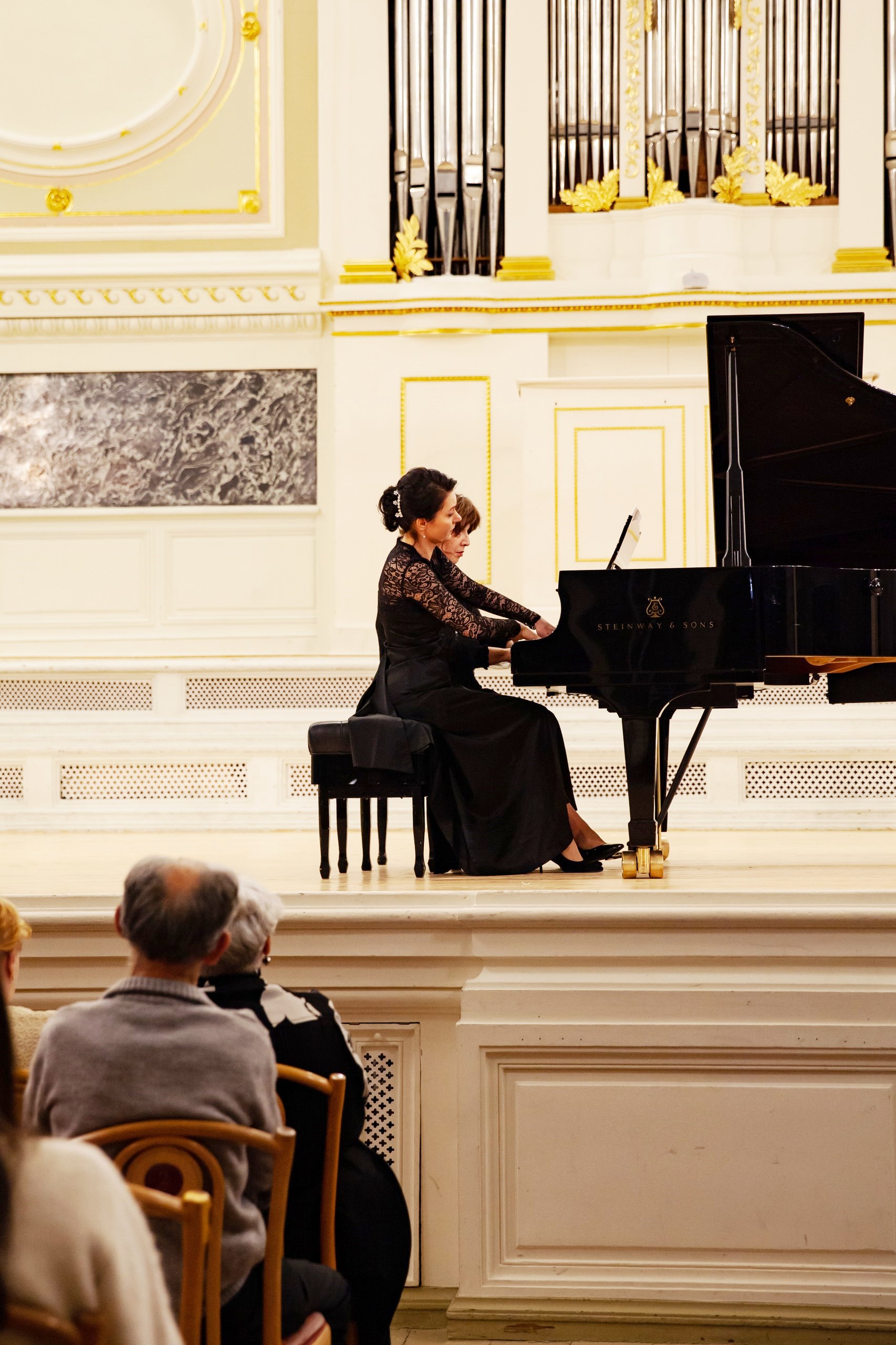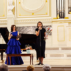 Еще в советские времена, когда проводились социалистические соревнования между отделами по очень разным показателям – активность, участие, выпускники и другие достижения – фортепианный отдел становился победителем. В награду преподаватели получали туры в Прибалтику, на Валаам, что только укрепляло силы пианистов. В школу возвращались выпускники, преподаватели приводили своих детей. Таким образом возникли музыкальные династии в 2-3 поколения. Сейчас в школе работают одиннадцать выпускников фортепианного отдела: четверо из них приняли участие в концерте. Концертмейстеры Анна Анисимова (выпускница класса Г.И.Шевченко) в дуэте с виолончелисткой Ульяной Абрамовой (учащаяся класса О.А.Малаховой) исполнили виртуозную пьесу К. Давыдова «У фонтана» (как тут не вспомнить фонтан-шутиху Петергофа!), а Лидия Шаховская (класс Н.А.Волошиновой) в ансамбле с певицей Анной Писаревой – приподнято-праздничный романс Чайковского «День ли царит». Анна Писарева – тоже выпускница фортепианного отдела (класс Т.В. Лещенко), ныне старший преподаватель вокала Российского государственного института сценических искусств. Преподаватели фортепиано Марина Климова и Наталья Соломко обратились к теме Петербурга – теме, без которой немыслим концерт петербургской школы, чтящей традиции. В их фортепианном дуэте прозвучал вальс «Петербург» Сергея Баневича из одноименного балета-фантазии по мотивам романа Андрея Белого.