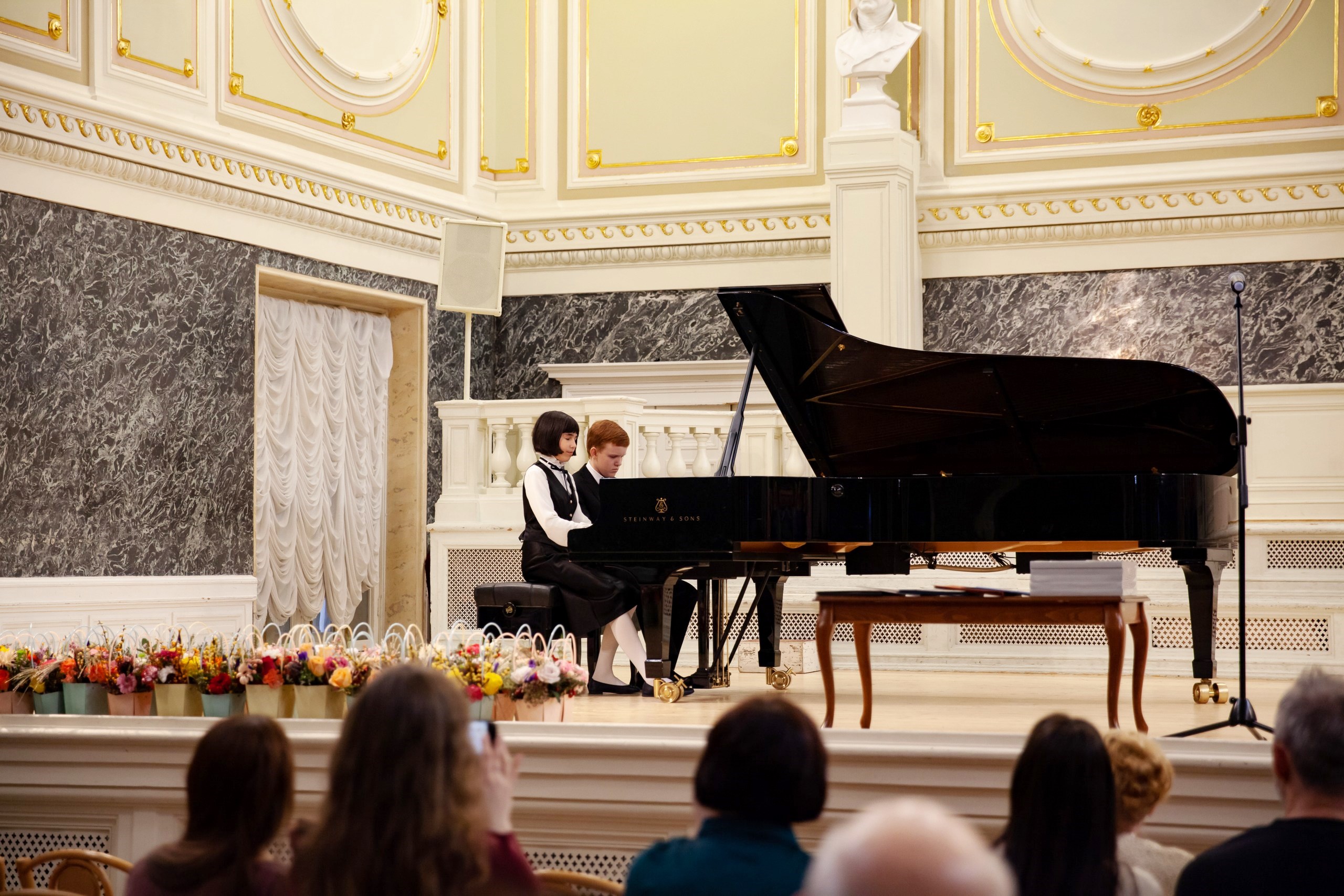 Концерт открыл фортепианный дуэт. Алина Абрамян и Георгий Барашев (класс В.Н. Скудневой) исполнили романтически устремленную, отражающую вечную тему подвига и преданности благородному делу Увертюру из музыки к кинофильму «Дети капитана Гранта» И.Дунаевского, адресуя ее педагогам, которые заняли почетные места на сцене.