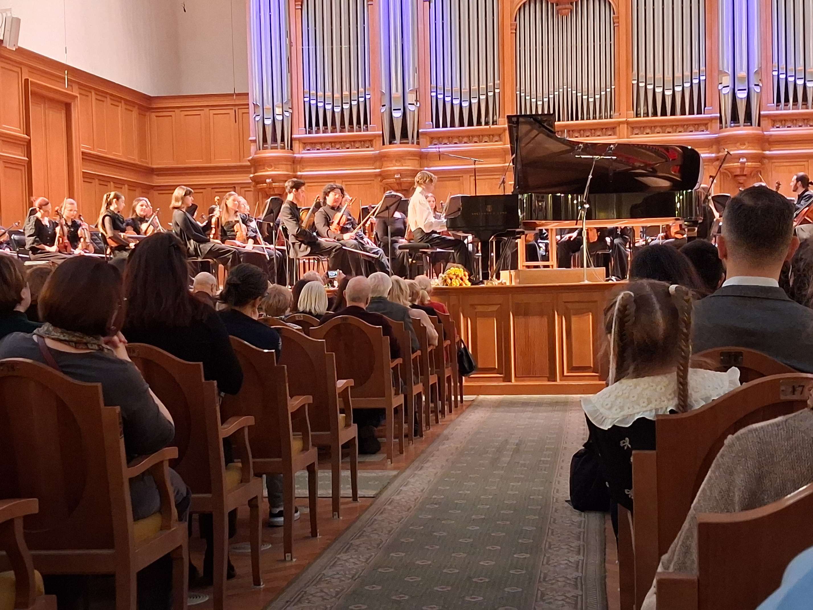 Студенческий оркестр под управлением своего шефа сыграл шопеновский концерт достаточно качественно, проявляя при этом похвальную чуткость к солисту. Во втором отделении музыканты в целом достойно исполнили Вторую симфонию Бетховена, стараясь изо всех сил соответствовать уровню, задаваемому маэстро, в своей безупречно-бескомпромиссной интерпретации отнюдь не склонному давать им какие-либо поблажки с поправкой на недостаточный опыт. Так, будучи не вполне удовлетворен тем, как прозвучало скерцо, маэстро повторил его еще и на бис, на сей раз, похоже, оставшись довольным результатом.
