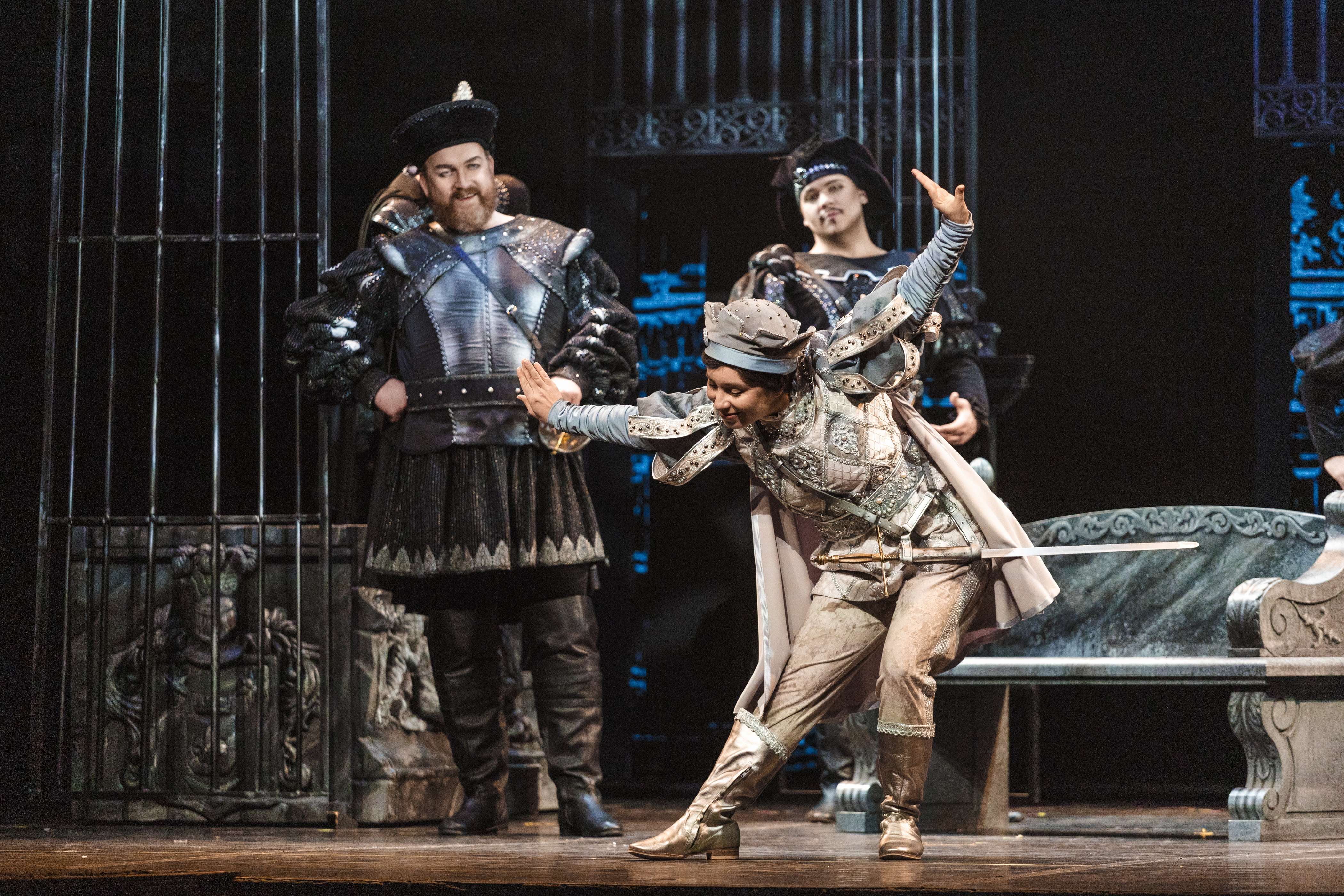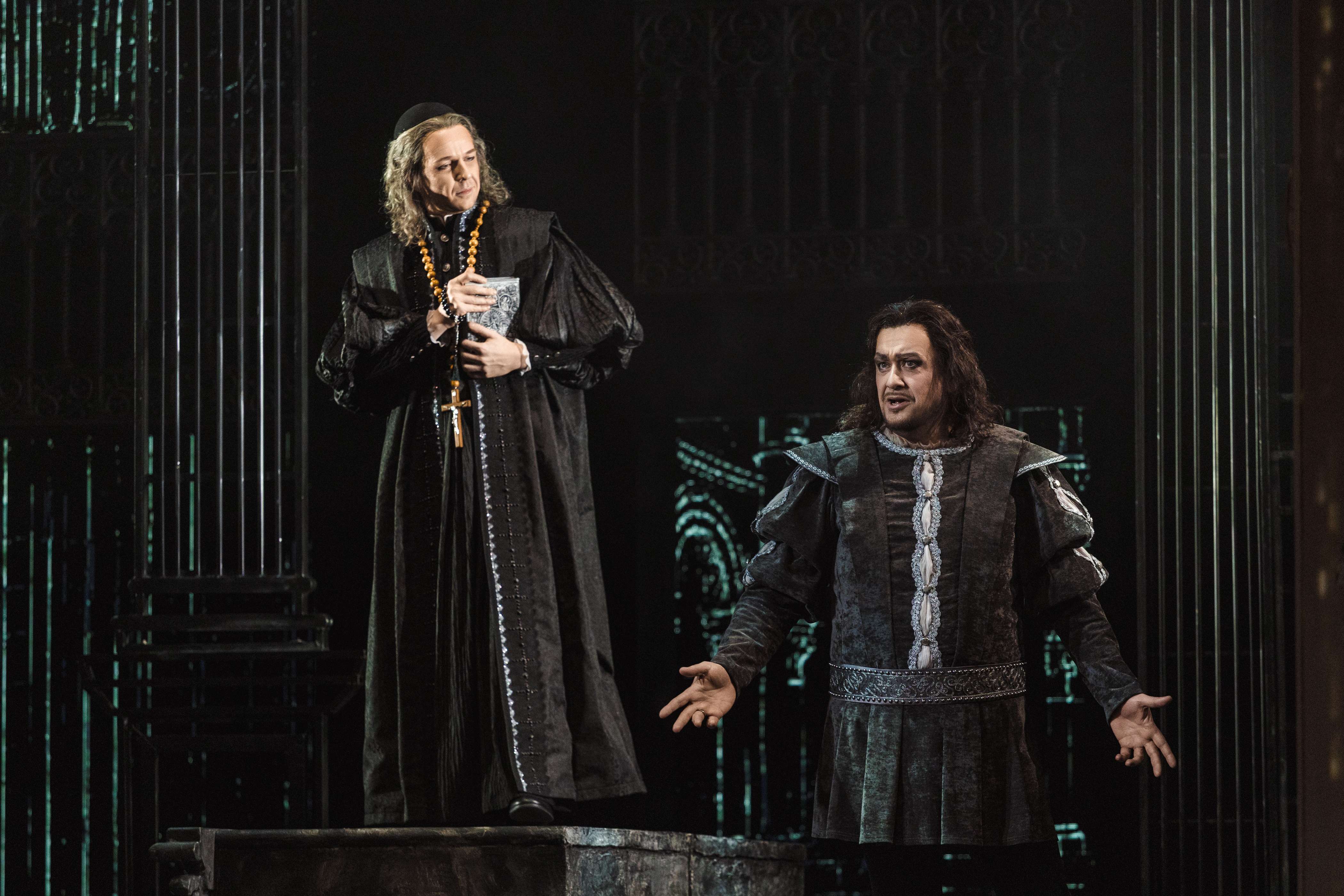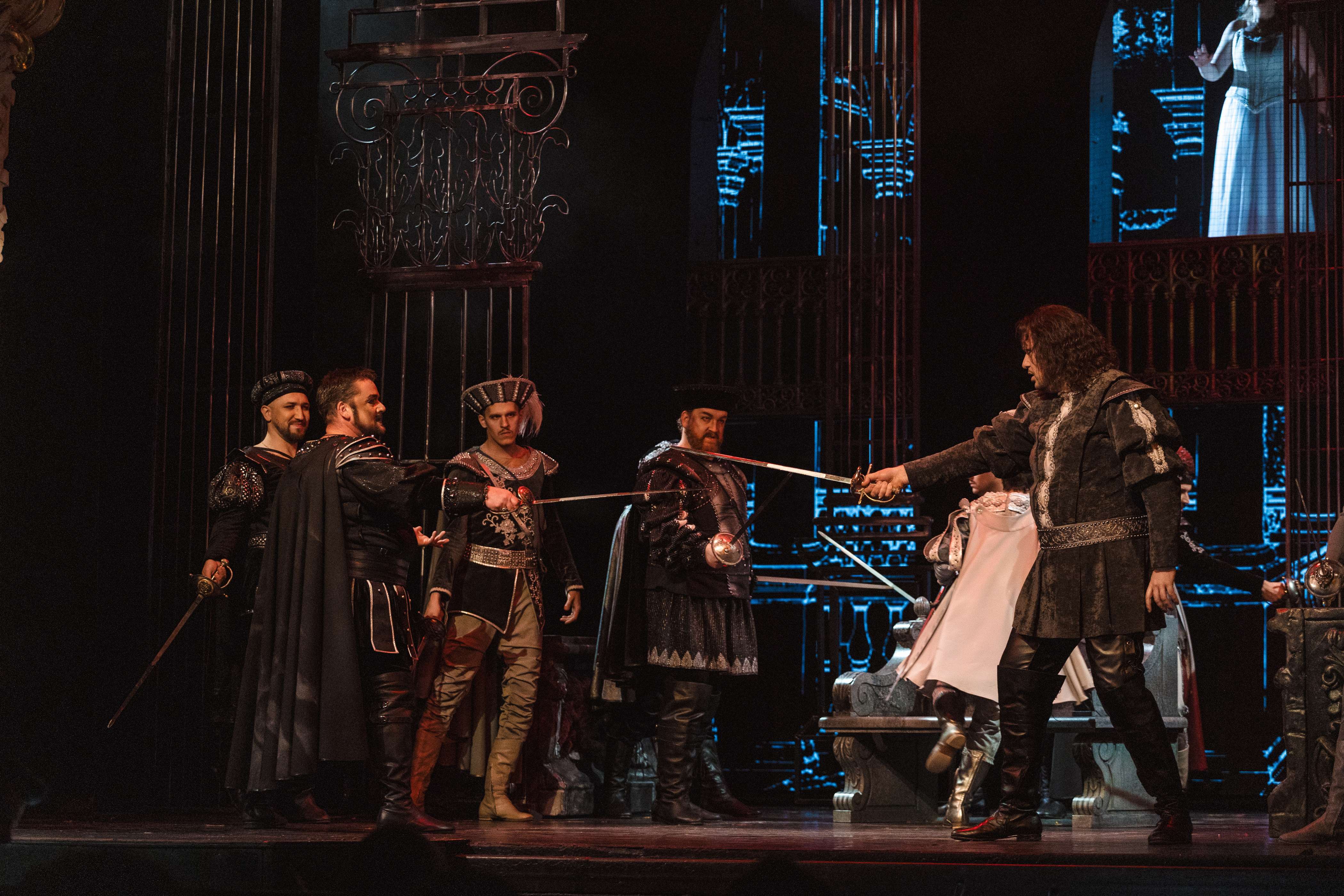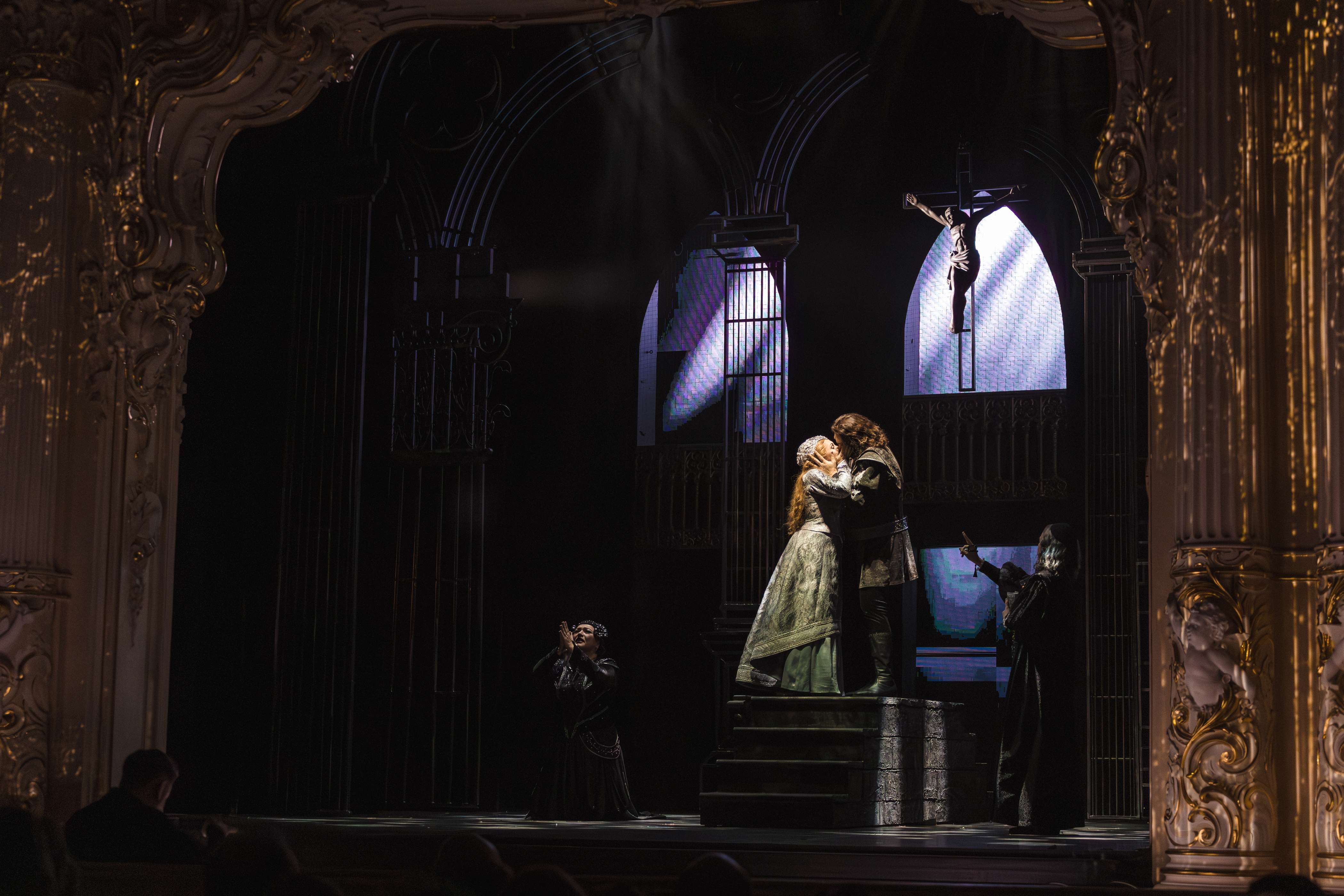 Красота, которую «учинил» на сцене Вячеслав Окунев, давний друг и соратник Юрия Александрова, – не бутафорская, не силящаяся рядиться в исторический аутентизм: это, скорее, аллюзия на исторический роман, литературную реальность. Как офорты из книги или гравюры, иллюстрирующие сюжет, выглядят декорации – с прорисовкой контуров колонн и сводов, стрельчатых арок, в которых видеоарт (Георгий Савельев) сочетается с традиционной живописью. Стильное колористическое решение спектакля – черно-белый монохром – придает остроту сюжету, ибо на этом монохроме и лирическое, и трагедийное расцветают экзотическими цветами главным образом за счет музыкального решения. Усиливает общий романтический эффект выразительный свет Азата Юлбарисова.