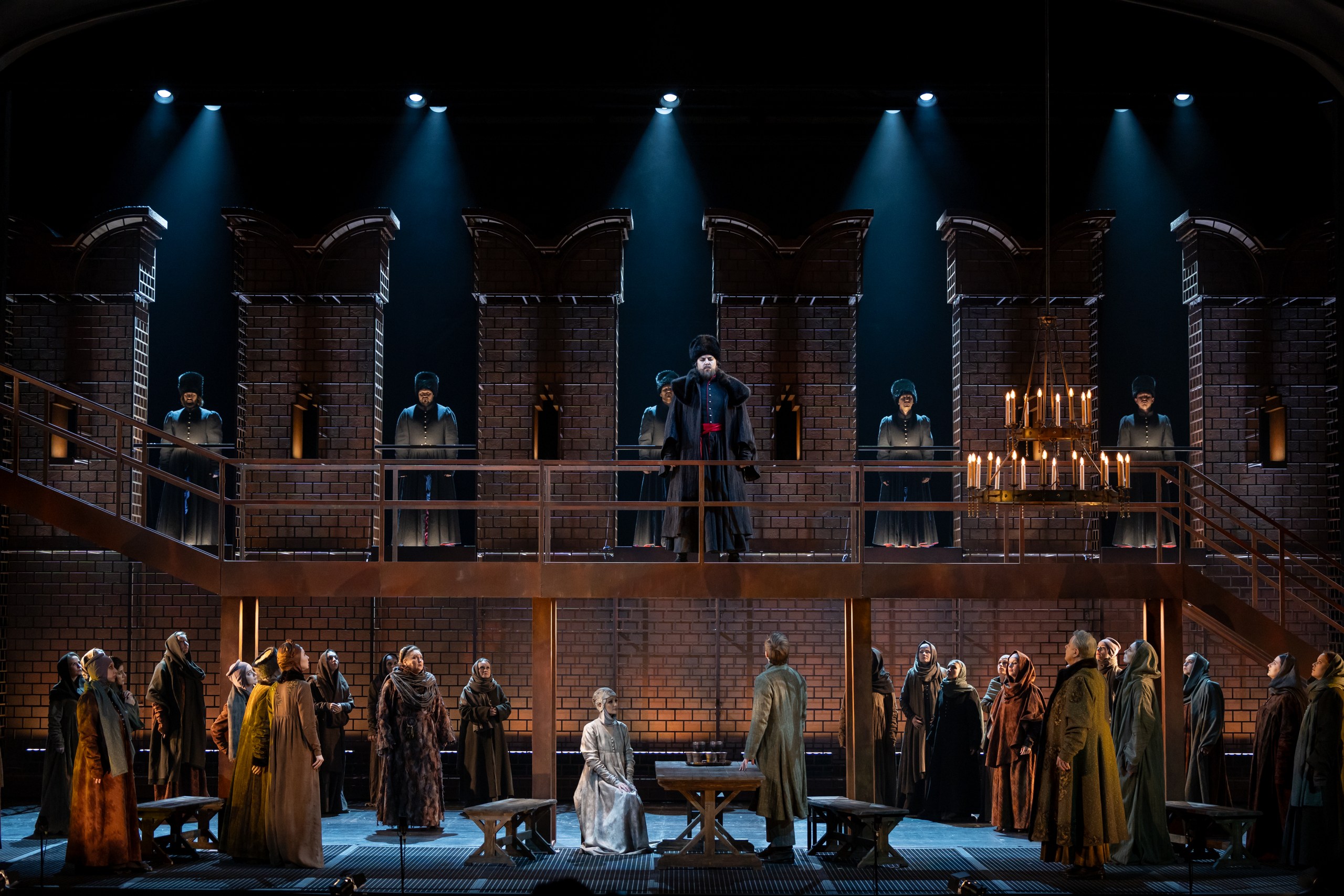 Его одели в крылатку из позапрошлого века, богемные шляпу и шарф, уместные и в наши дни, приклеили щегольскую бородку-эспаньолку и дали в руки керосиновую лампу. Найдутся в костюмной партитуре Марии Даниловой и другие фантазии (вроде высоких боярских шапок на подневольных опричниках), и другие белые вороны (типа охранников Грязного в кожаных полупальто и кубанках). Но облик Бомелия говорил громче всего: не стоит тебе, зритель, застревать в 1572 году, коим промаркировано действие оперы, наш труд — не исторический экскурс, зри шире. А шире — деревянный помост как второй уровень сцены, простой стол со скамьями да люстра-паникадило, какая пристала храму, но до жилых домов в XVI веке еще не добралась. Что хочешь, то и играй в этом маловыразительном, исторически индифферентном пространстве. Разве что белые зубцы Новодевичьего монастыря, в красном свете превращающиеся в кремлевские, — не пустой сценографический звук. В Кремле венчали на царство, в Новодевичий ссылали опальных цариц, и Марфе это предупреждение: жди венца, но как бы не стал он терновым. Большего по части подтекстов из декорации Зиновия Марголина (эффектность приобретшую только благодаря художнику по свету Александру Сиваеву) не вытянуть.