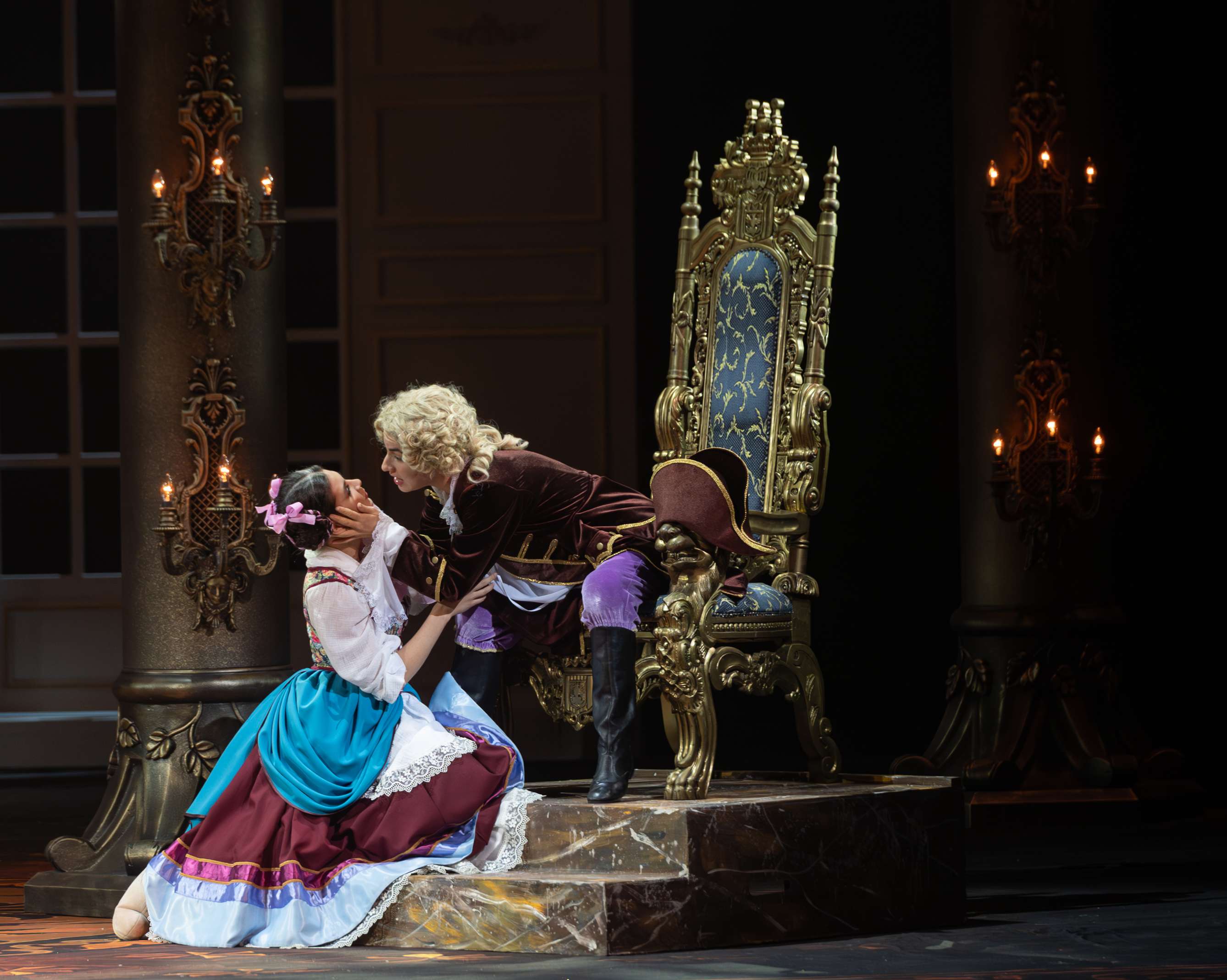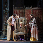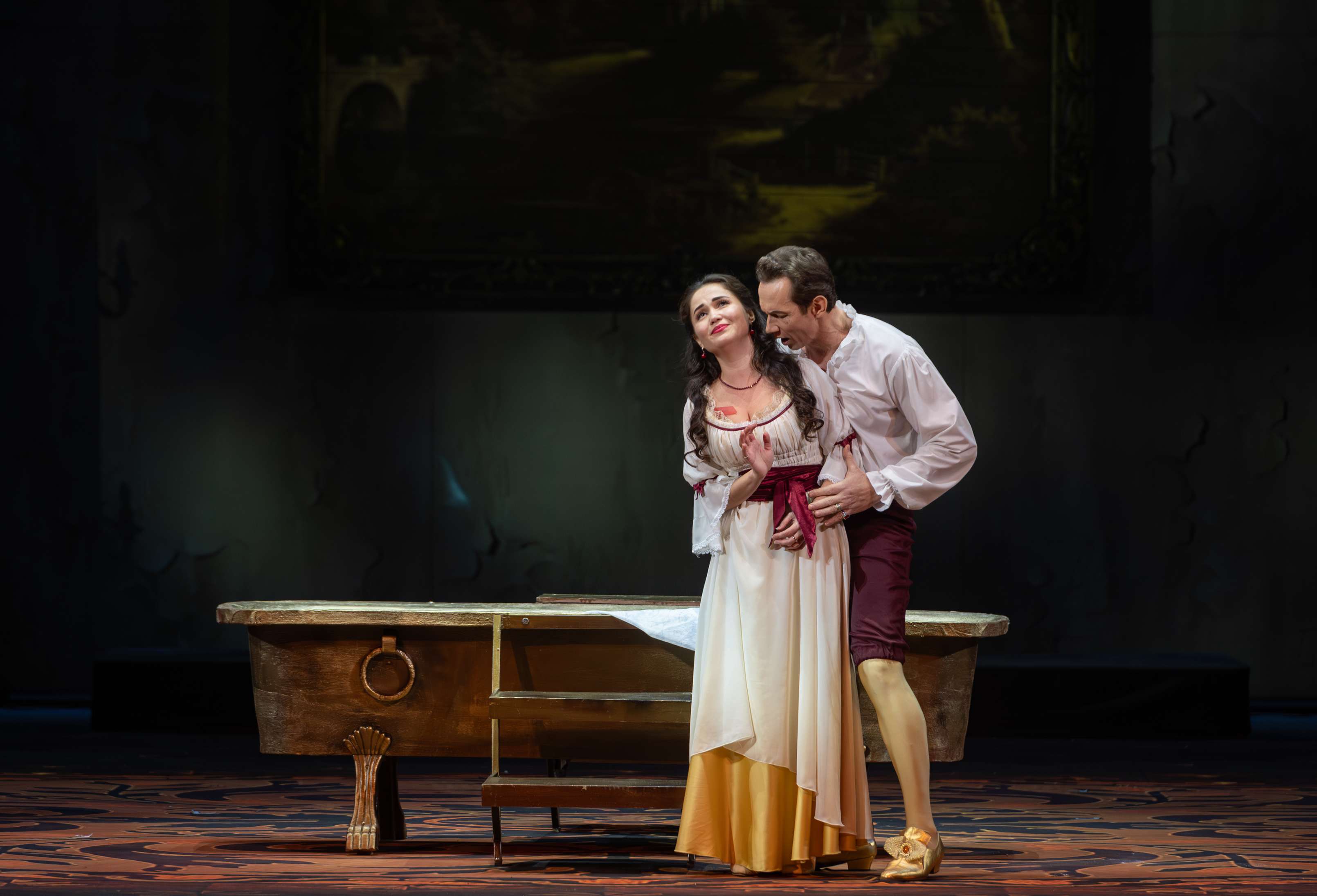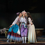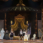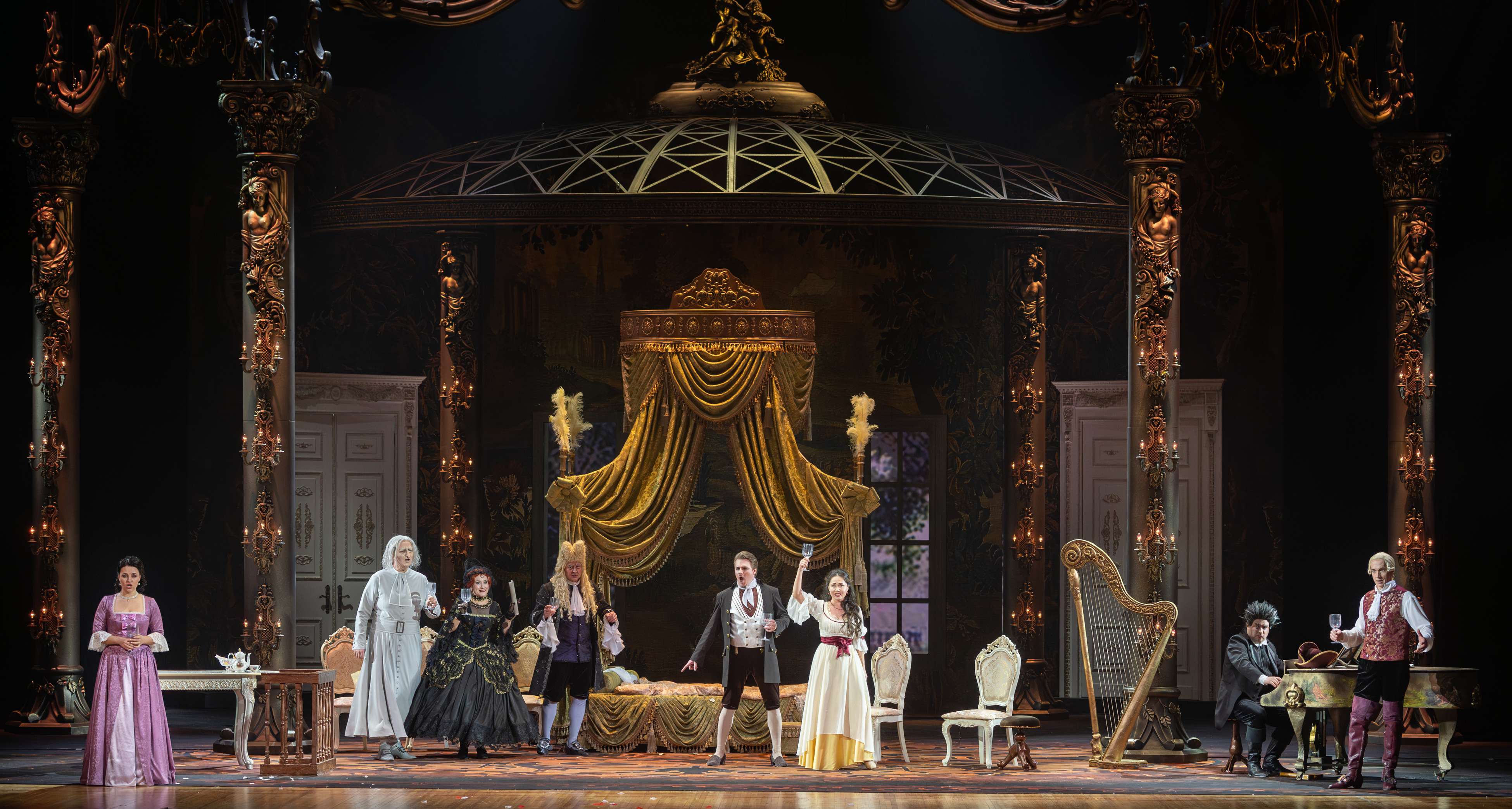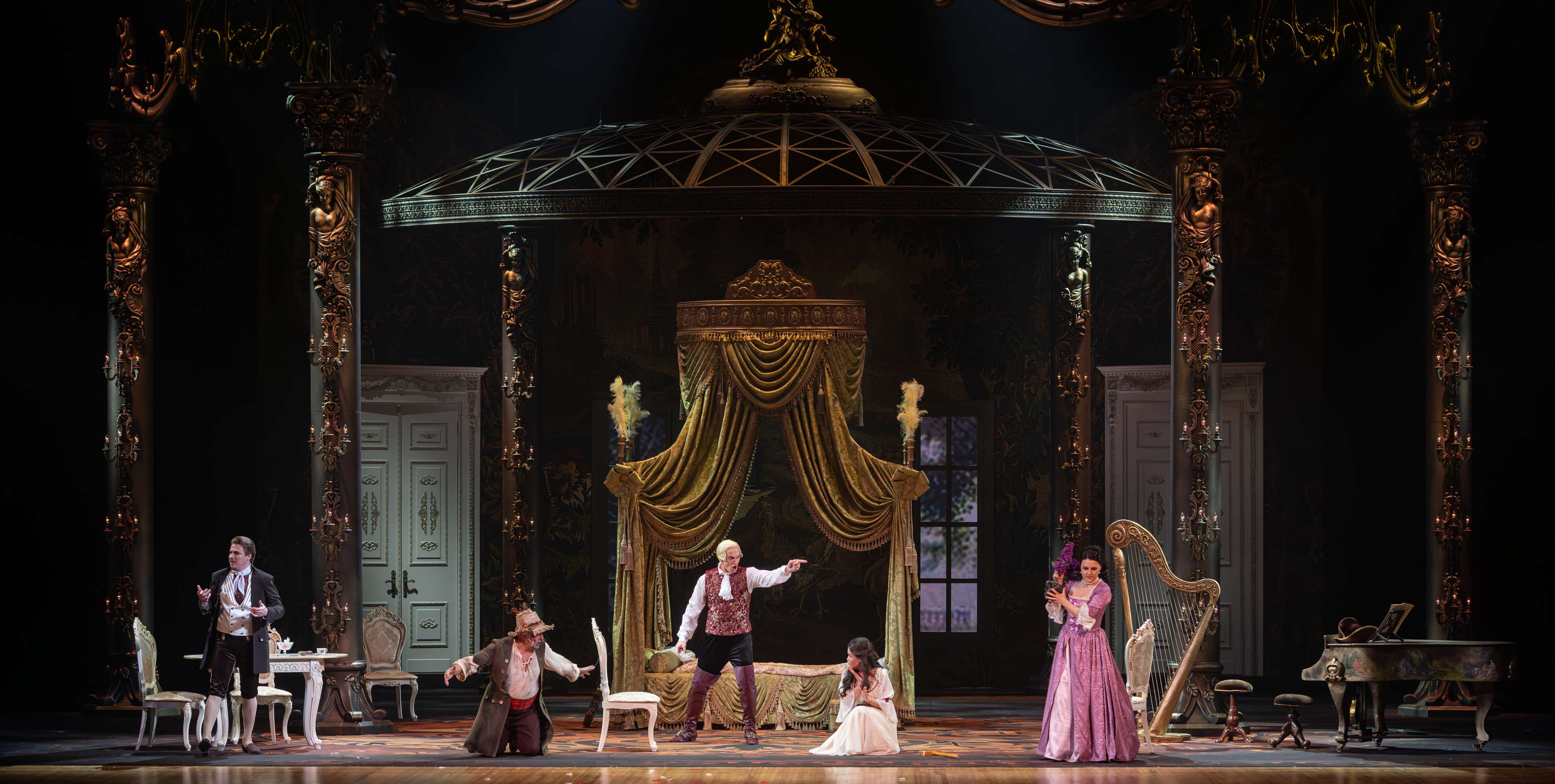 Режиссером выступил Юрий Александров, многажды ставивший Моцарта в разных местах и разной стилистике, в том числе и «Свадьбу Фигаро»: сегодня в Мариинском театре можно увидеть его классический вариант в оформлении сценографа Вячеслава Окунева, многолетнего творческого партнера Александрова. Вместе они сделали и спектакль для Казани, во многом другой, нежели петербургский. Витиеватая аркада и барочный альков над кроватью Графини — вроде похожи: присмотришься — нет, все иначе, с иными оттенками. Костюмы пышны и соответствуют нашим представлениям об эпохе рококо, в каких-то цветовая гамма перекликается с «мариинским прототипом», в иных совсем новая.