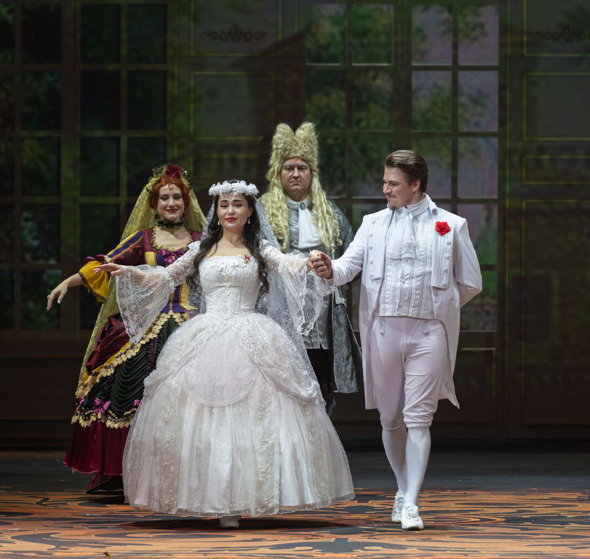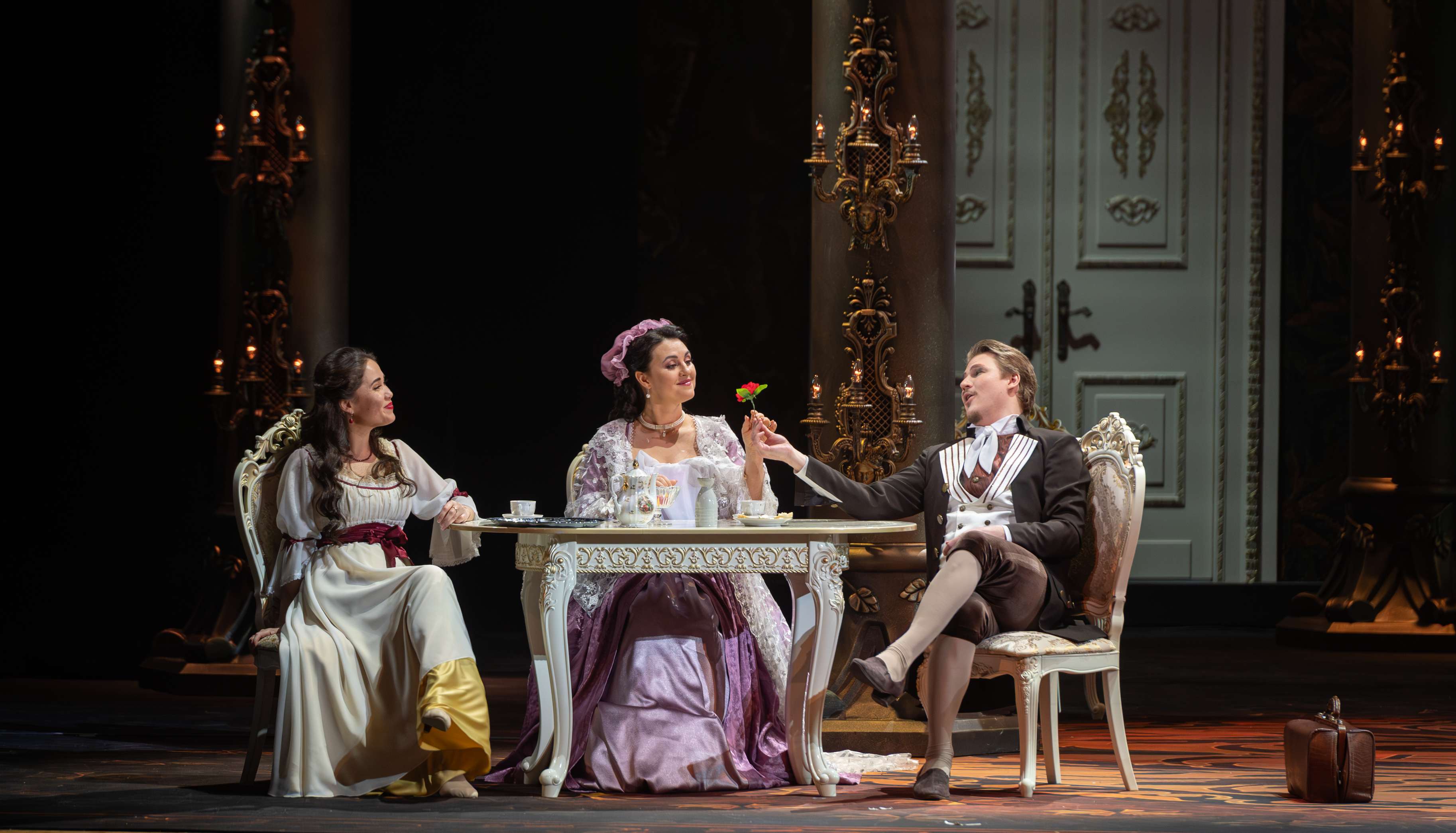 Визуально новая работа по-настоящему красива, эффектна и сразу задает «правильное настроение»: вы в классической опере. Пространственное решение таково, что на сцене просторно, много воздуха, графские покои и сад обширны, ничто в них психологически не давит; огромные двери в залах дают возможность обыгрывать многочисленные буффонные ситуации комедии положений. Немалая заслуга у световика Сергея Шевченко: он дополнительно облагораживает «картинку», делая мягкие акценты там, где требуется. Добавила своего и хореограф Надежда Калинина — пластика и танец (его немного в спектакле, но как краска он очень к месту) то элегантны, то искрометно комедийны.