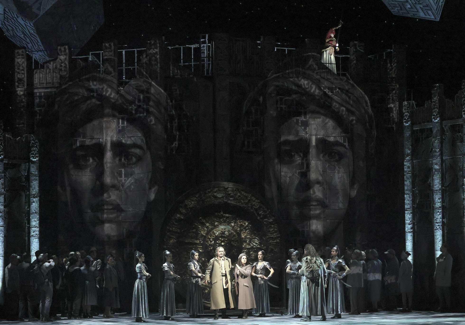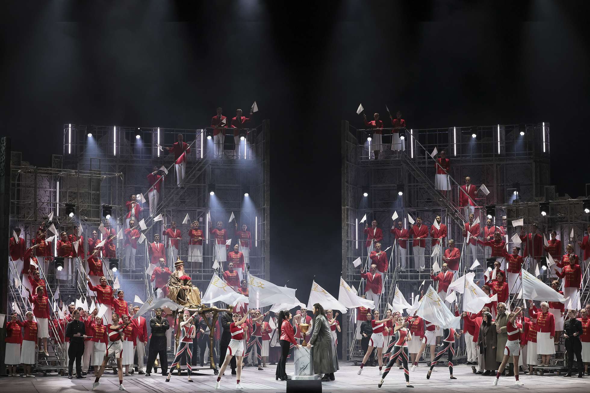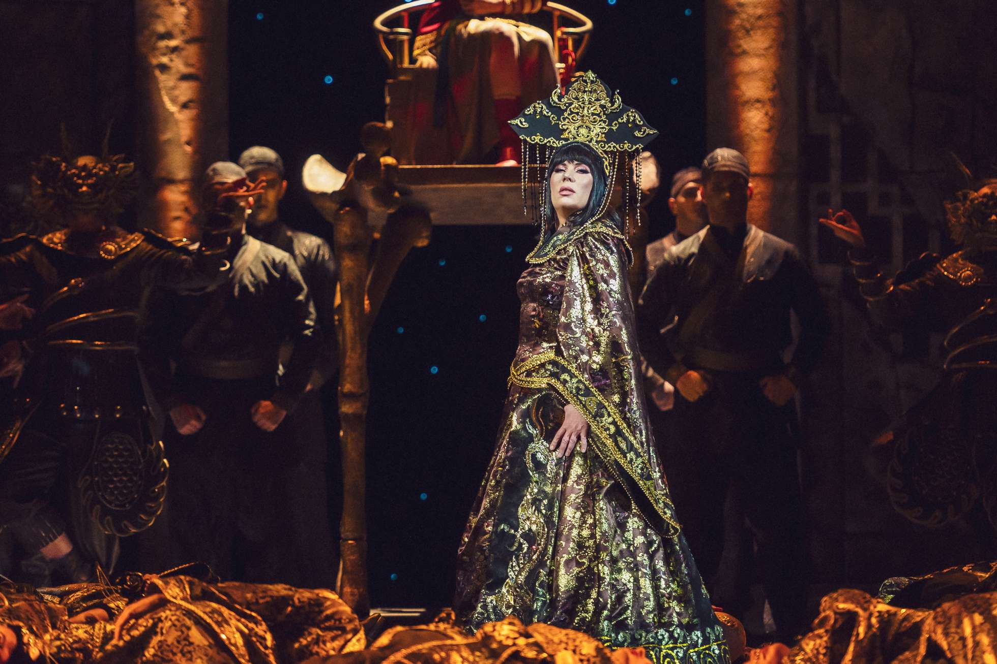 Как известно, Пуччини не дописал оперу, навсегда выронив перо в том месте партитуры, где умерла Лю. Что дальше — изначально было прописано в либретто, а позже положено другими на ноты с использованием черновиков автора. Однако мало кого эти постскриптумы убеждают (в чем и заключена главная постановочная проблема оперы). Франдетти оказался тоже из малоубежденных. Но он не стал заморачиваться поисками сколько-нибудь логичных способов изобразить скоропалительное пробуждение любви в монструозном существе, а развернул действие в нежданном-негаданном направлении.