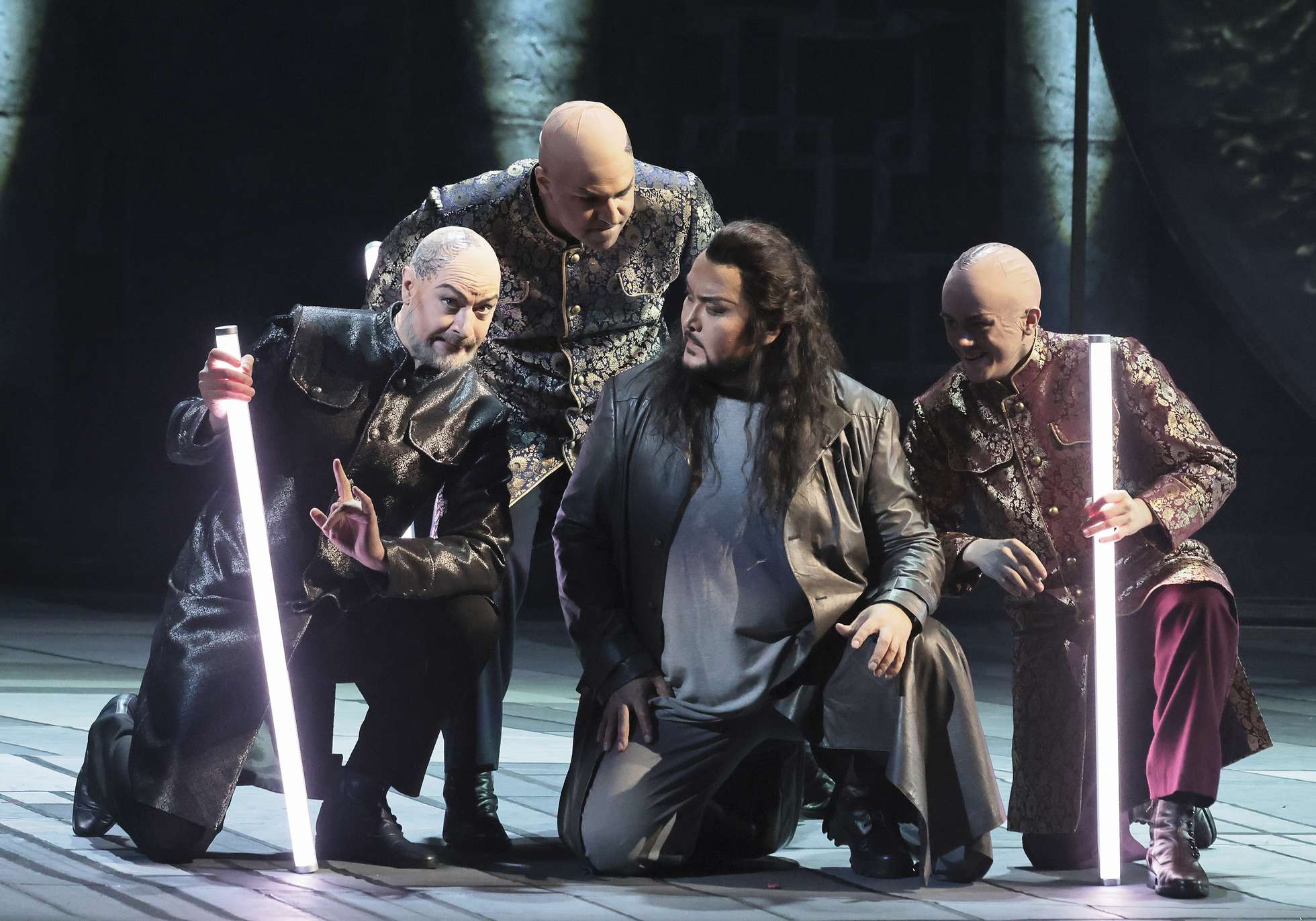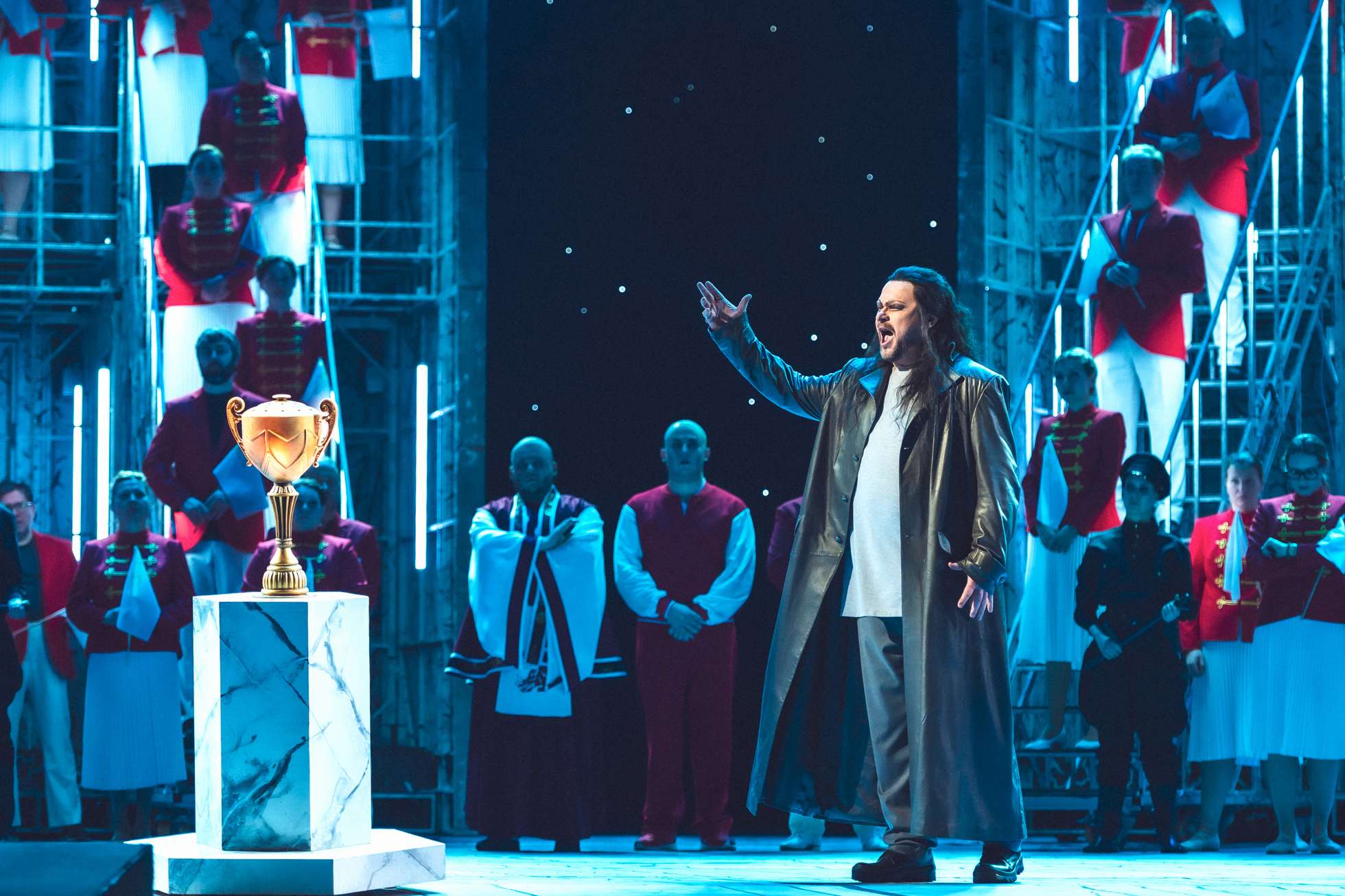 По счастью, на поддержку подоспел Валерий Гергиев, возведший цельное, тщательно отделанное, по-настоящему монументальное основание под безумства своих визуалистов. Оркестр и хор (которому автор впервые отвел одну из главных ролей в опере) дышали в унисон, прорастали друг в друге и даже непосвященным доходчиво «объясняли», в чем заключается особенность оперы. А она в том, что композитор, прежде всецело увлеченный человеческими страстями, здесь вдруг заговорил про вселенское добро и зло... Однако с музыкальными яхонтами-брильянтами, какими требовалось украсить впечатляющее основание, вышло не так благополучно.