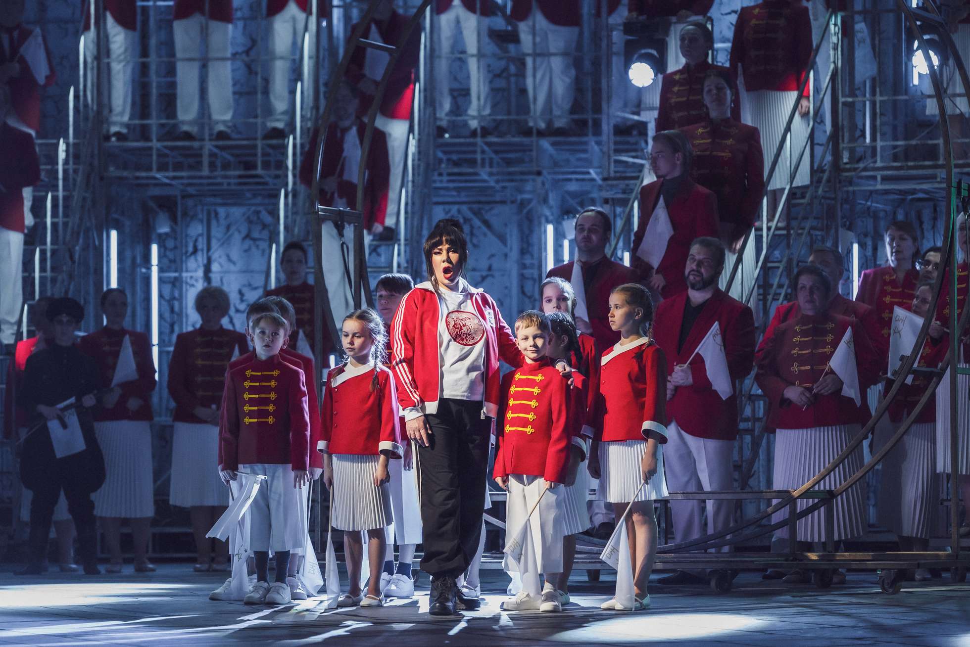 Припомнят тоталитарные режимы, наводнив пространство полицейскими в гестаповской форме, снарядив преподносить цветы Иосифу Виссарионовичу (за которого здесь Император Альтоум) известную кроху из советской фотохроники и отправив в коммунистический забег по занавесу оживших благодаря видеосредствам молодых маоистов с неведомой фрески. Помянут какую-то из войн прошлого столетия, выведя на сцену в шинелях слепого отца принца Калафа и его верную помощницу, рабыню Лю. Достанут из киносундуков начала этого века светящиеся «звездные» мечи. Разумеется, не забудут сегодняшний день, задекларировав его главной приметой культ спорта как олицетворения маскулинности, противоборства, азарта. И спортсменка номер один здесь — Турандот, проходившая весь спектакль до финальной сцены в адидасовских шароварах, футболке и бутсах. Кто поверит, что можно полюбить такую непрезентабельную особу, да еще с повадками рыночной хабалки? А и не надо, «скажет» режиссер.