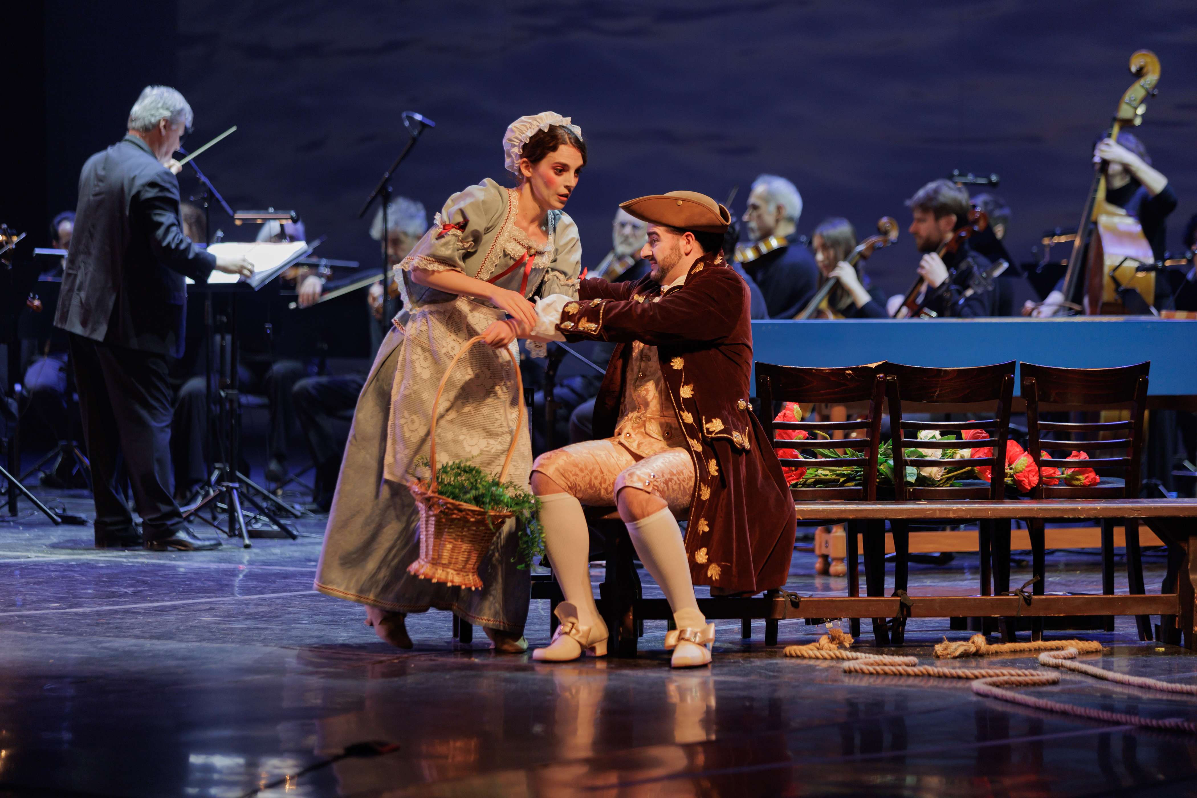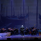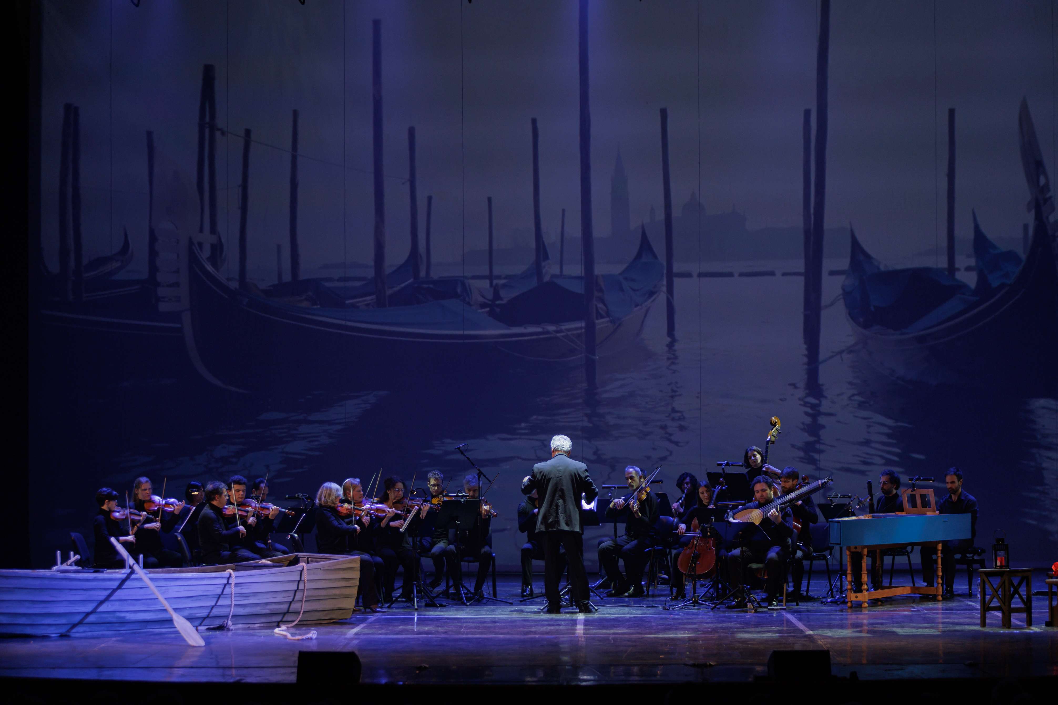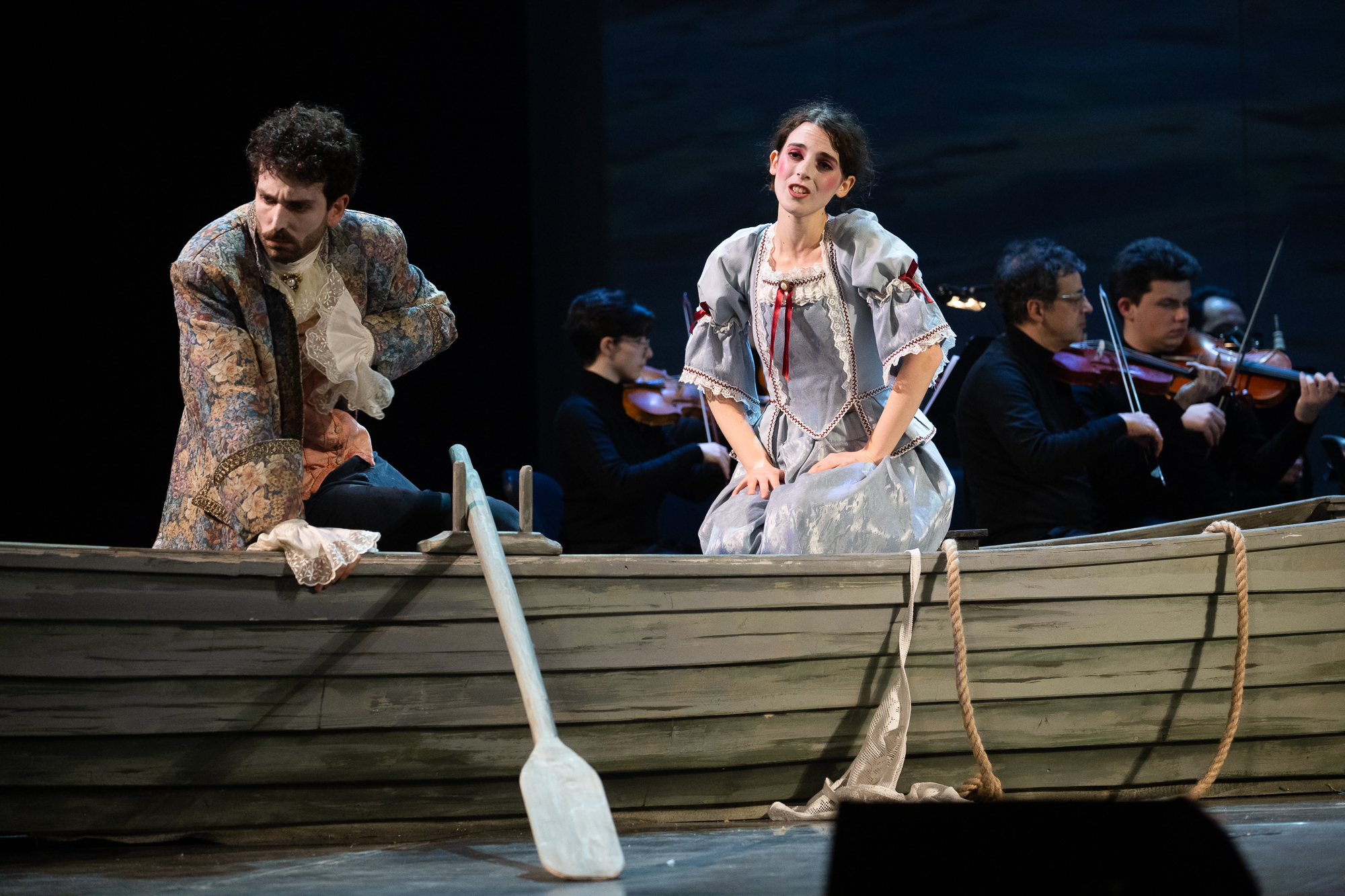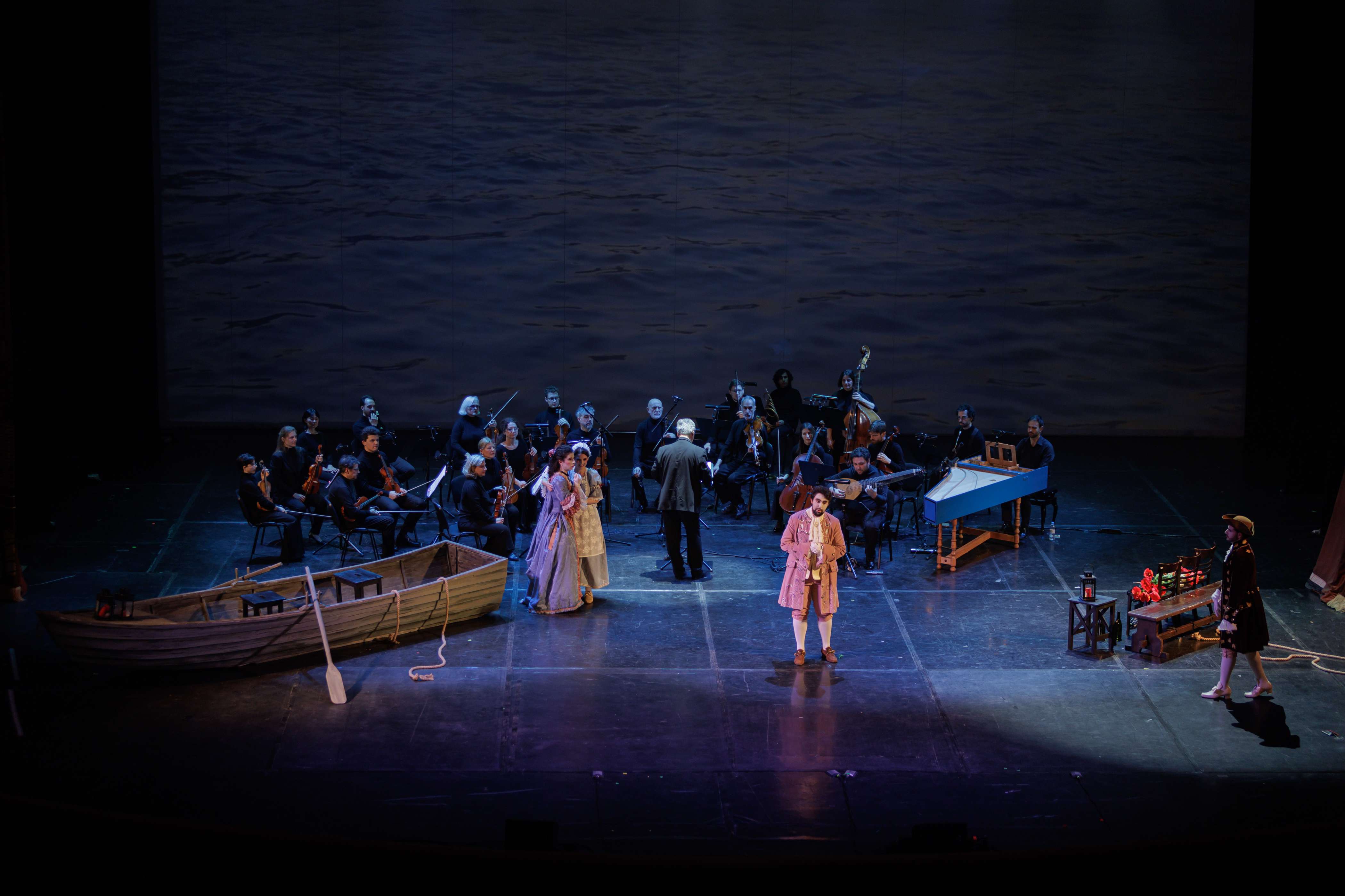 Сценическое оформление постановки скромно. На заднике сцены почти все время господствовало видео венецианской лагуны – действие оперы разворачивалось на благословенных берегах Адриатики. На авансцене слева – лодка в натуральную величину: в ней не раз будут барахтаться парочки героев, порой в весьма провокативных позах. Справа – пара стульев, с помощью которых режиссер периодически изображает запряженный конями экипаж для путешествия Нардо с Леной. Почти все мизансцены разыгрывались на самом переднем крае сцены, в непосредственной близости от зрителя, основную же часть пространства занимал оркестр, все время оказывавшийся за спиной у артистов, что иногда мешало точности и синхронности исполнения. Некоторые расхождения наблюдались не раз, правда, маэстро Энрико Казацца весьма оперативно их «разруливал», и непосвященным не было заметно ничего криминального.