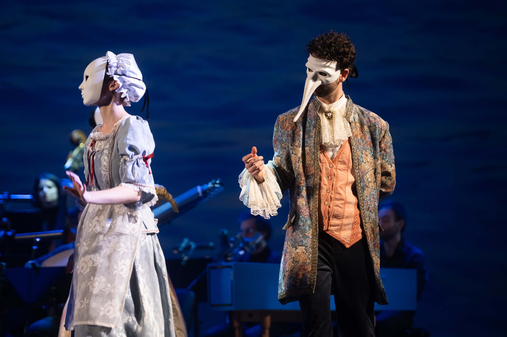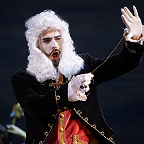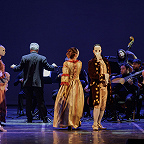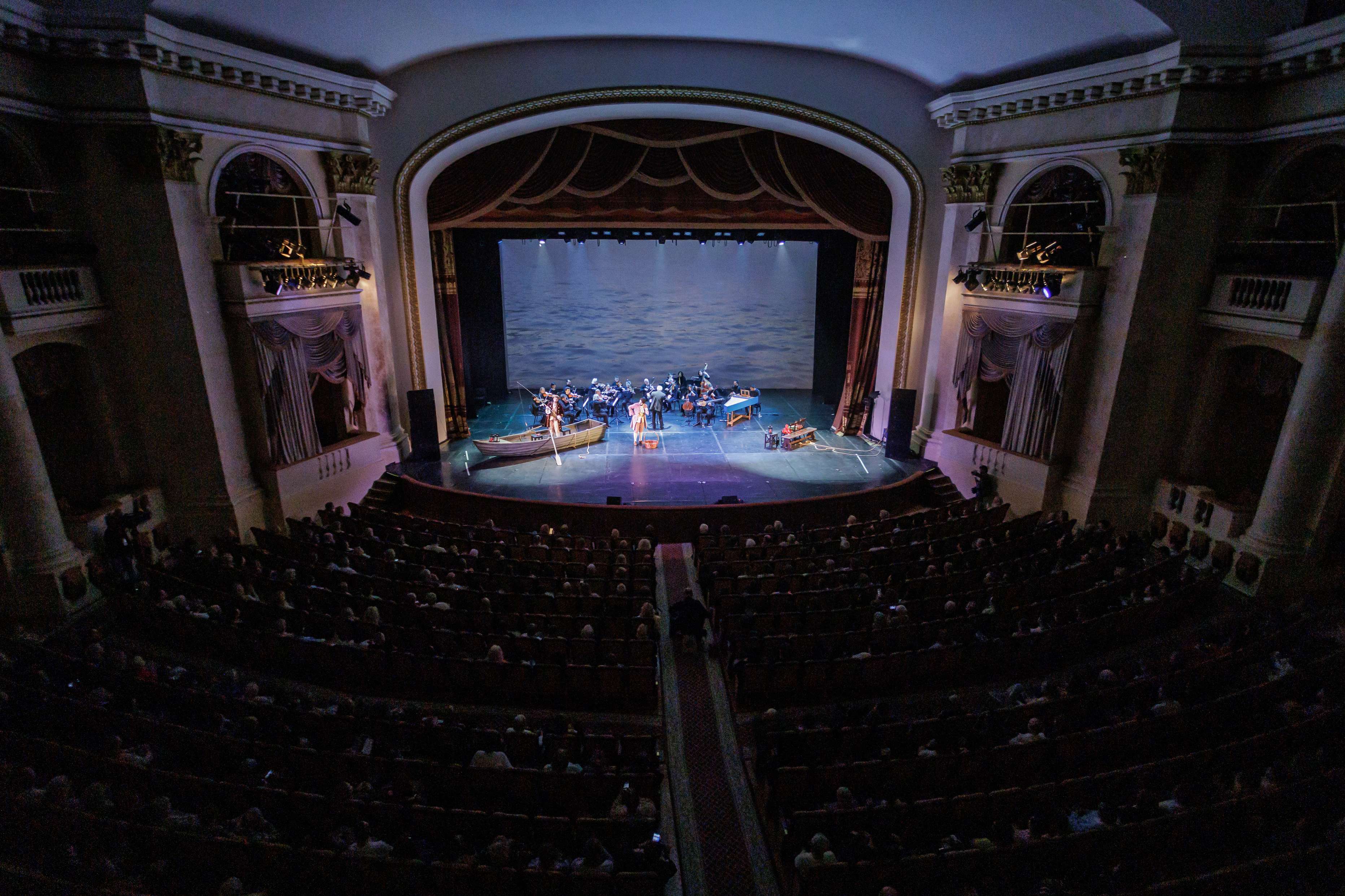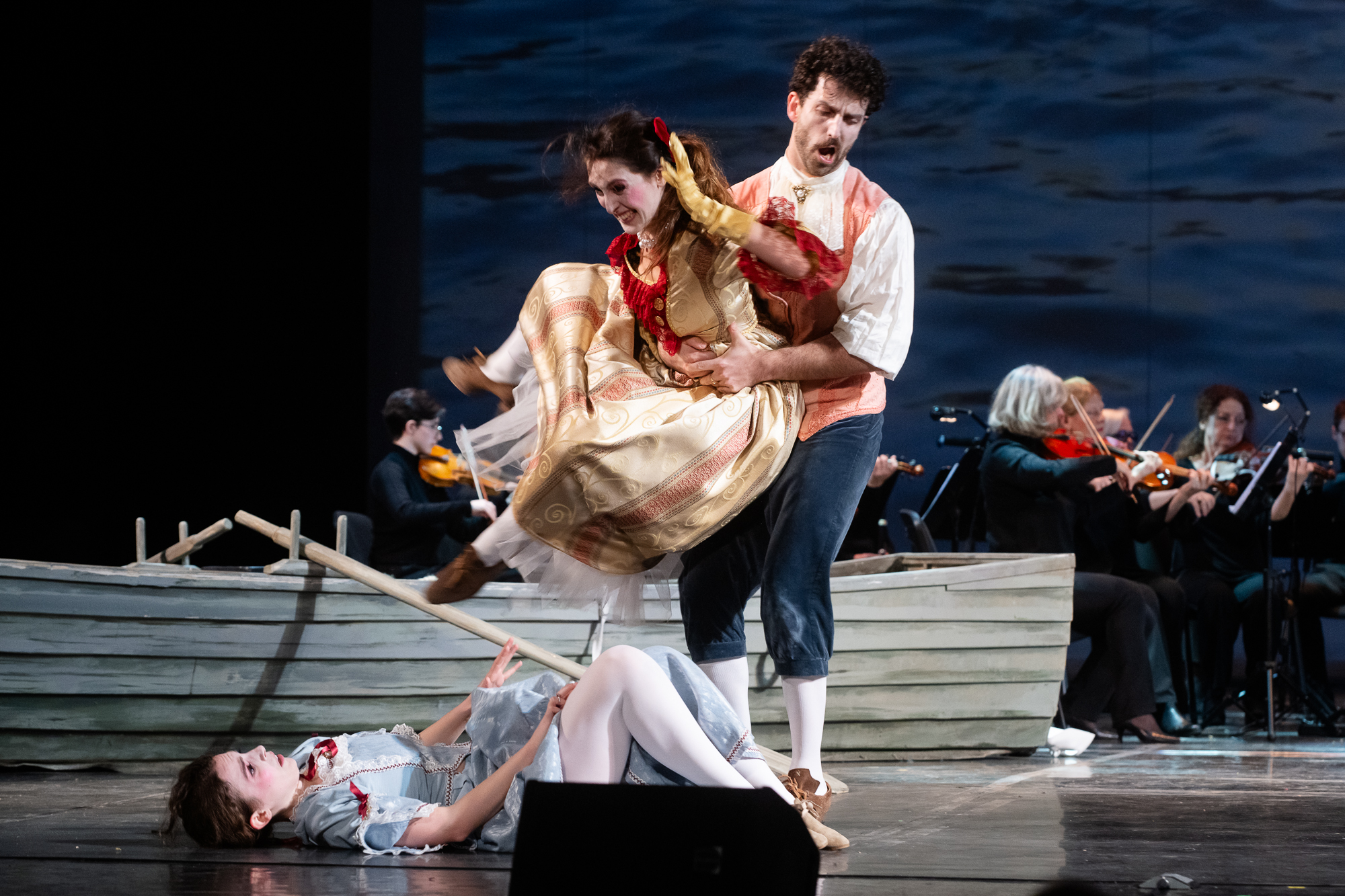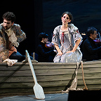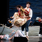 Сценическое оформление постановки скромно. На заднике сцены почти все время господствовало видео венецианской лагуны – действие оперы разворачивалось на благословенных берегах Адриатики. На авансцене слева – лодка в натуральную величину: в ней не раз будут барахтаться парочки героев, порой в весьма провокативных позах. Справа – пара стульев, с помощью которых режиссер периодически изображает запряженный конями экипаж для путешествия Нардо с Леной. Почти все мизансцены разыгрывались на самом переднем крае сцены, в непосредственной близости от зрителя, основную же часть пространства занимал оркестр, все время оказывавшийся за спиной у артистов, что иногда мешало точности и синхронности исполнения. Некоторые расхождения наблюдались не раз, правда, маэстро Энрико Казацца весьма оперативно их «разруливал», и непосвященным не было заметно ничего криминального.