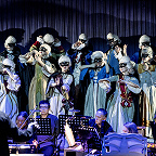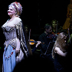 Сацевцы честно называют свою продукцию «спектаклем по мотивам оперы-балета», дав ей видоизмененное название: «Похищение Европы». Да и спектакль ли это в полном смысле слова? Балета нет вовсе, хотя музыка некоторых танцевальных дивертисментов и звучит, – остались лишь элементы пластики в торжественных проходах миманса. Сценографии, по сути, тоже нет – лишь видеопроекции, на которых публика лицезреет то величественные французские замки, то венецианскую лагуну, то полотна испанских живописцев. Есть роскошные костюмы, отсылающие к «галантному веку»: кринолины, парча, кружева, шелка, парики, камзолы, блеск страз. Правда, похоже, что они не вполне оригинальны, по крайней мере, костюм главной героини третьего фрагмента оперы, примадонны Олимпии, точь-в-точь как на главной героине в генделевской «Альцине» (та же золотистая чалма в жемчугах). Есть определенное мизансценирование, слегка оживляющее статику, но оно минимально, – в основном солисты стоят в линейку по обе стороны от дирижера (оркестр за ними) и исполняют свои партии по нотам с пюпитров. Соответственно, возможности сценической игры весьма ограничены.