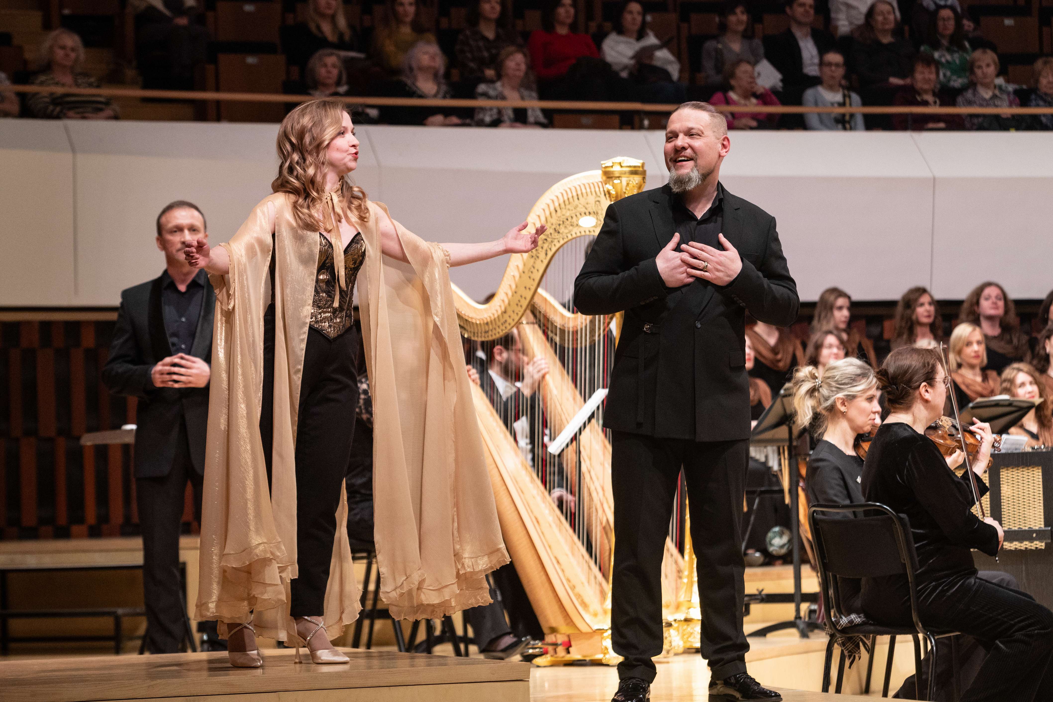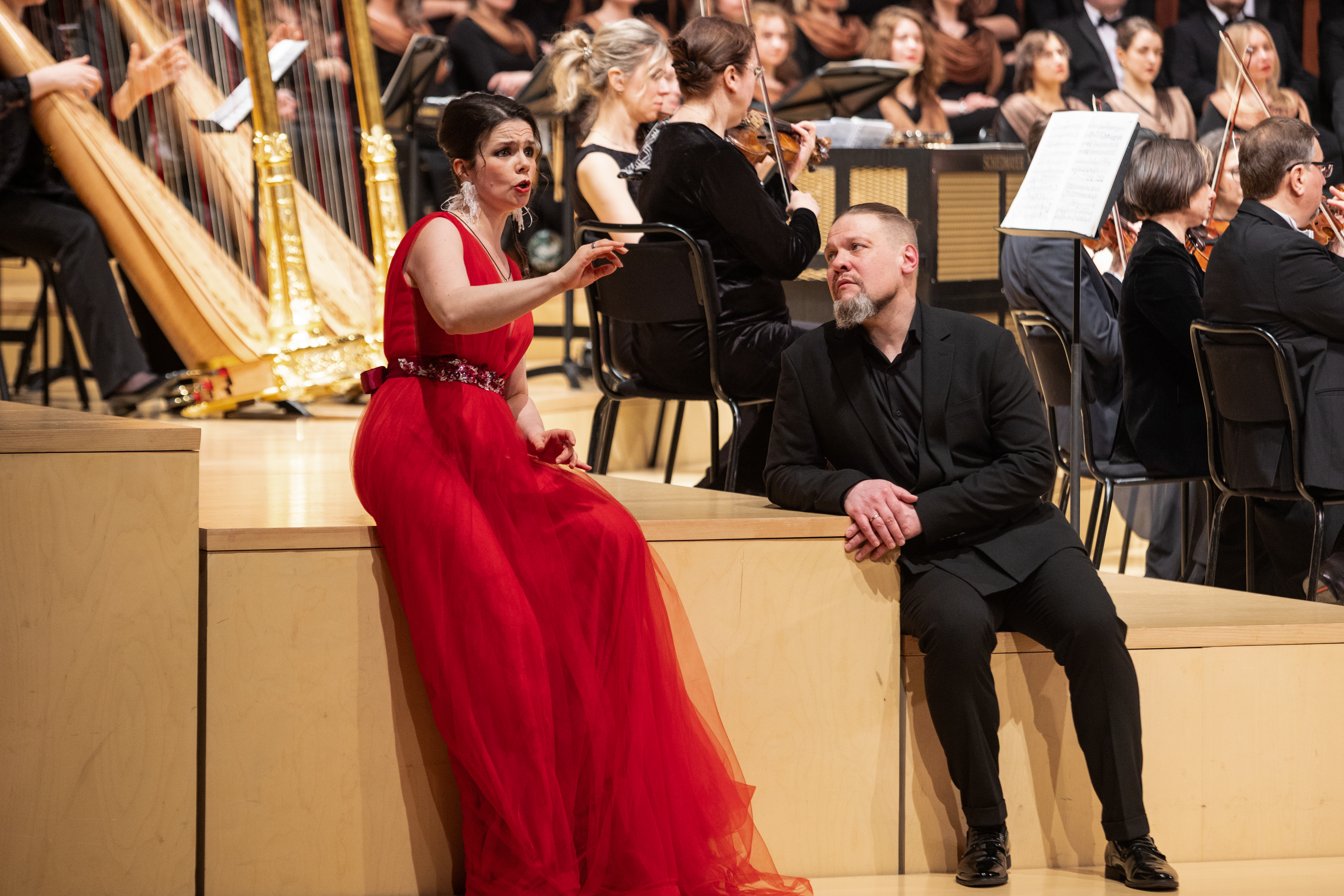 Да, не было костюмов и декораций, отсутствовали даже привычные по нынешним временам видеопроекции, тем не менее на сцене жил театр. Пусть его нужно было домысливать, но делать это было несложно благодаря яркому музыкальному воплощению. Солисты пели наизусть и играли на все сто, взяв мизансцены из сценических воплощений и изрядно добавив куража. Амелфа без конца грозила пальчиком Петушку за то, что он будит царя своими кукареку, братья-царевичи практически подрались на авансцене, царь Додон всамделишно плясал, выдавая веселящие зал коленца, а Звездочет так заинтересовался красотою Шемаханки, что демонстративно смотрел на нее сквозь царя как сквозь пустое место.