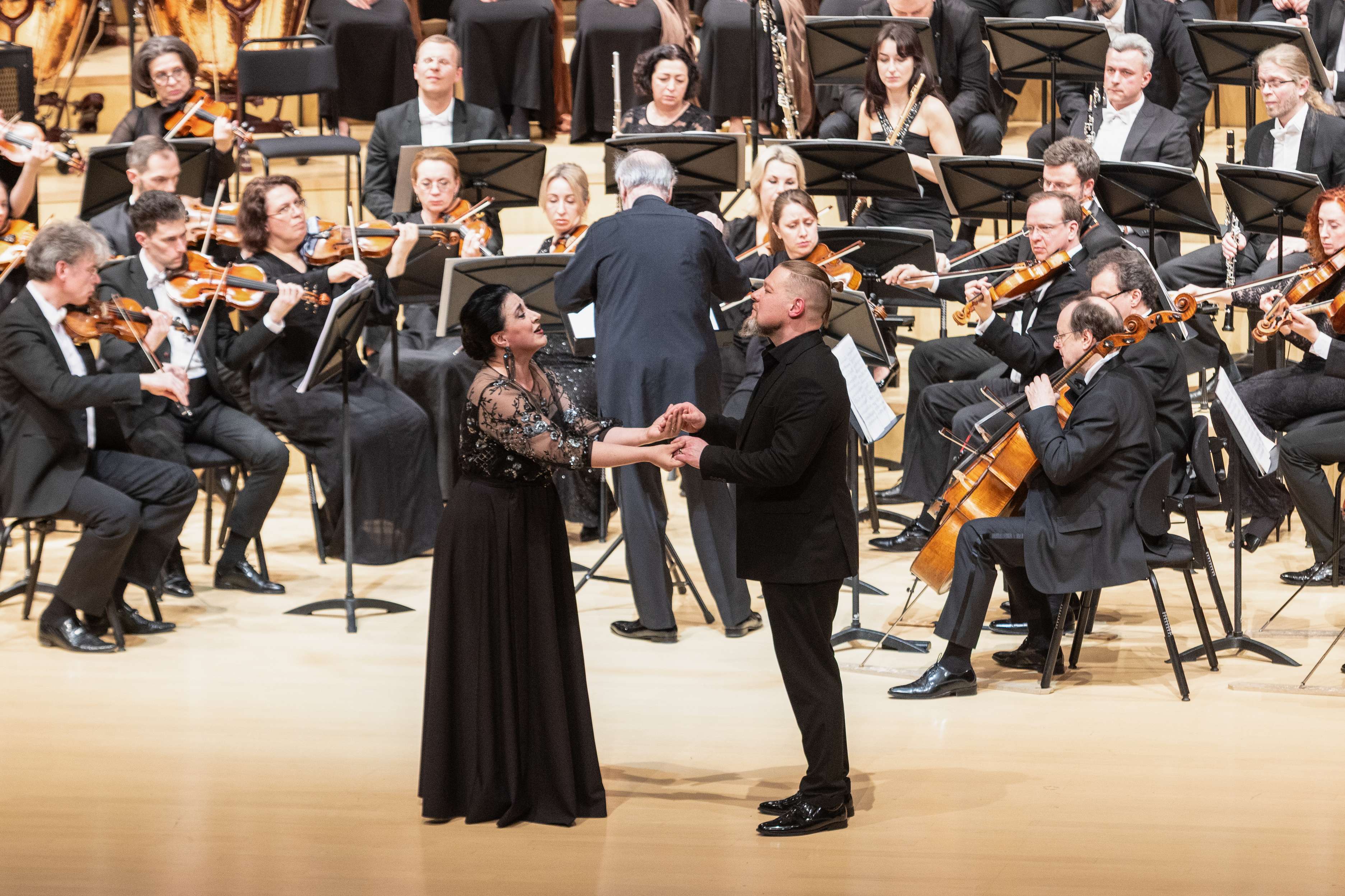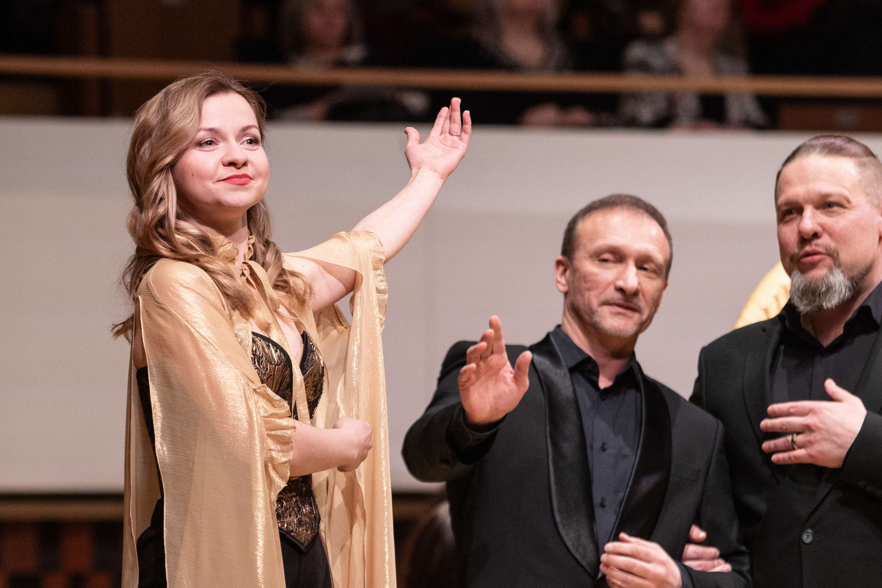 О солистах – только суперлативы. Сочностью голосов особенно запомнились Александр Трофимов (Гвидон), Максим Даминов (Афрон) и Евгений Чернядьев (Полкан), интонационным разнообразием – Андрей Серов (Додон) и Анна Кикнадзе (Амелфа). Дебютантка Марина Техтелёва неплохо показалась в небольшой партии Петушка, все было хорошо с остротой ее призывов, но хотелось бы все же более объемного звучания. Архисложную партию Звездочета Андрей Попов «прокричал» очень зычно, буквально пронзая зал на сверхвысоких нотах, однако портаменто было многовато, хотелось бы, чтобы партия была спета более инструментально. Царицей исполнения ожидаемо оказалась Ольга Пудова – в ее Шемаханке было столько неги и язвительности одновременно, притворного лицедейства и нескрываемого коварства, а спето было все столь технически идеально – с парящими пианиссимо и точными колоратурами и мелизмами, – что лучшей героини и пожелать невозможно.