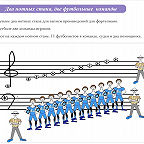 Показательно, что даже знакомство с клавиатурой и нотной грамотой по методике Ольги Сотниковой превращается в увлекательное занятие – открытие непредсказуемых и, зачастую, парадоксальных способов устройства мира. Автор использует яркие, понятные ребёнку образы. Например, футбол и нотный стан. Два нотных стана (скрипичный и басовый) сравниваются с двумя футбольными командами на поле. 22 ноты — как 22 игрока: каждая нота, как игрок на поле. имеет свою «позицию».
