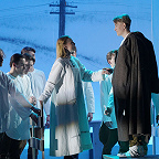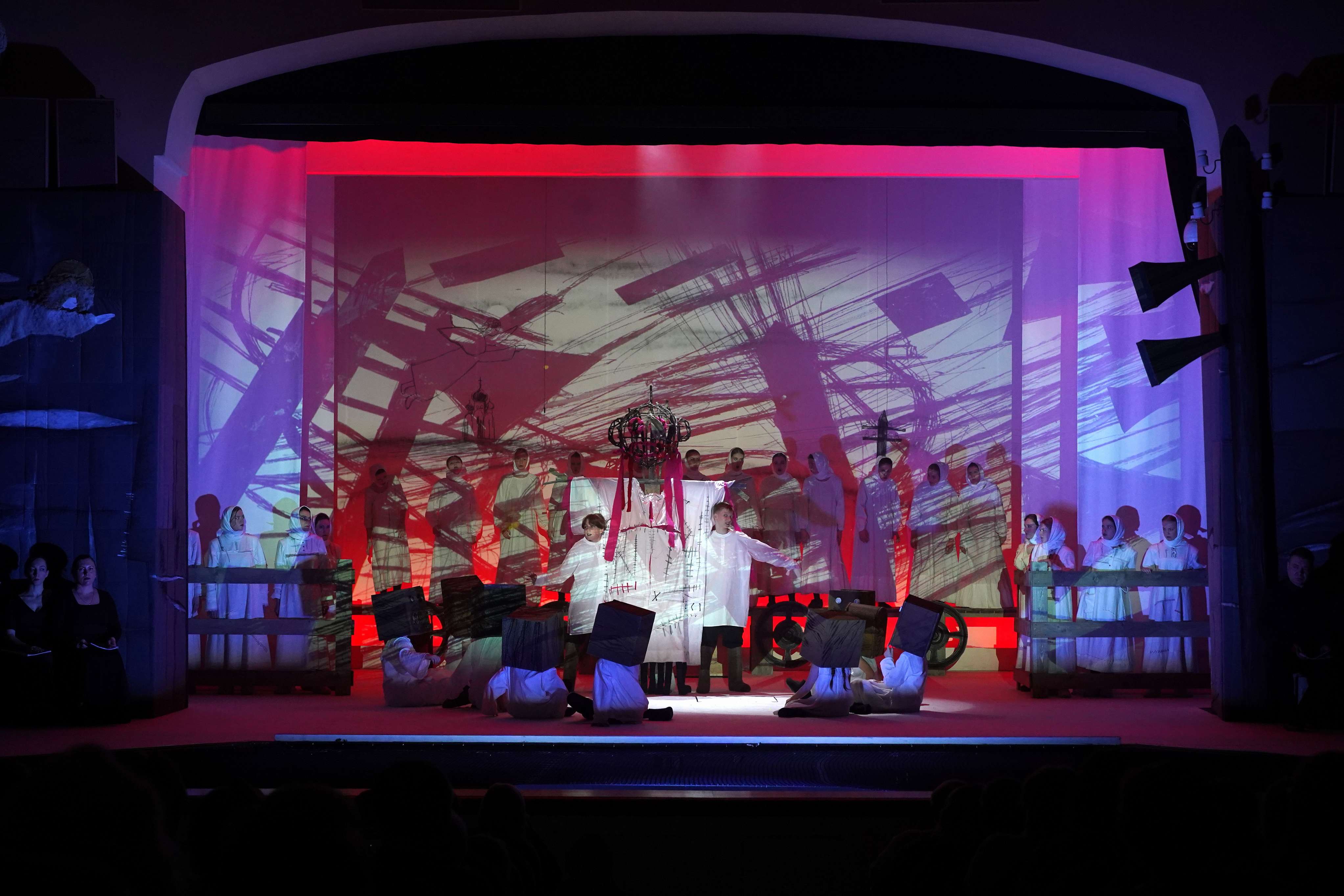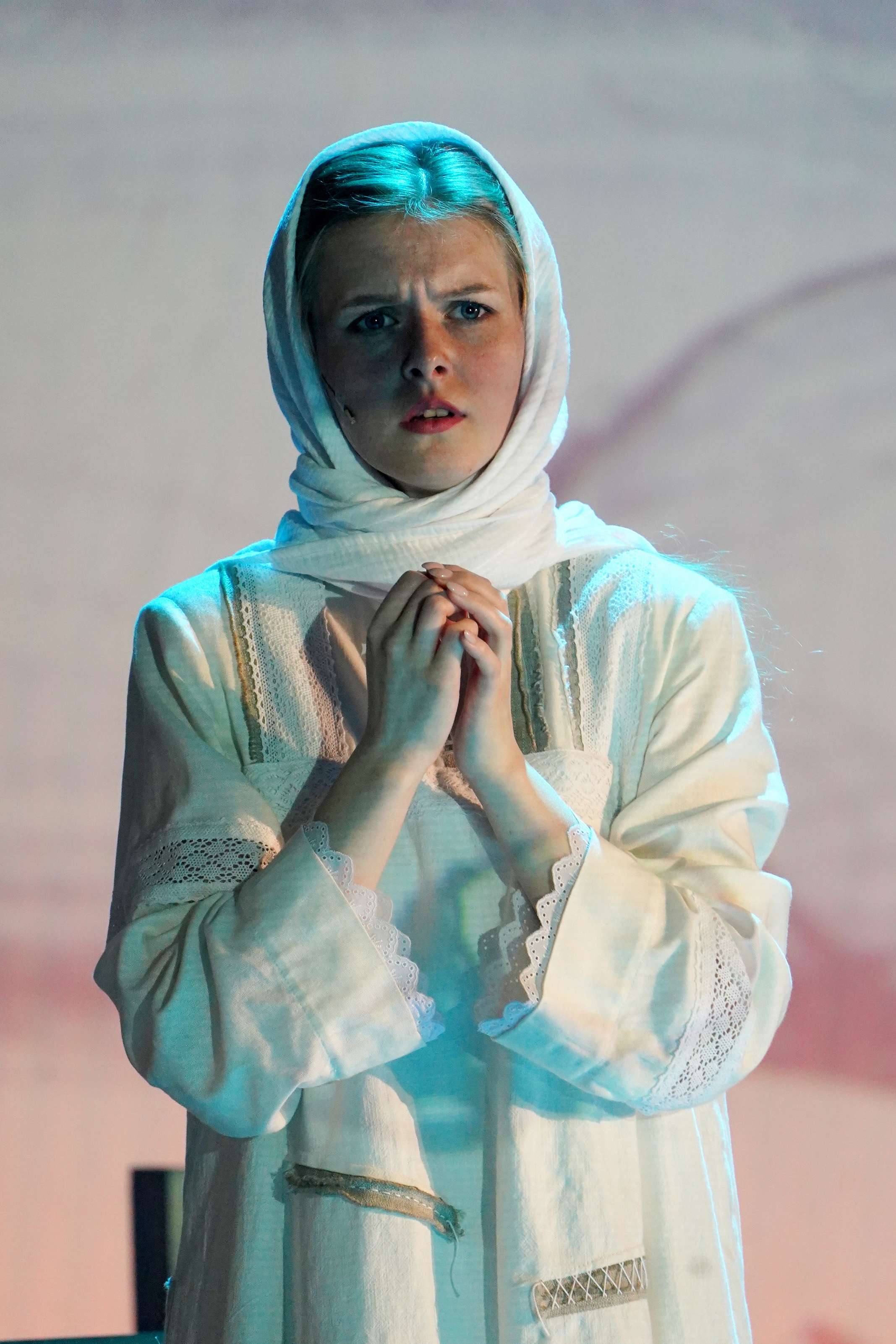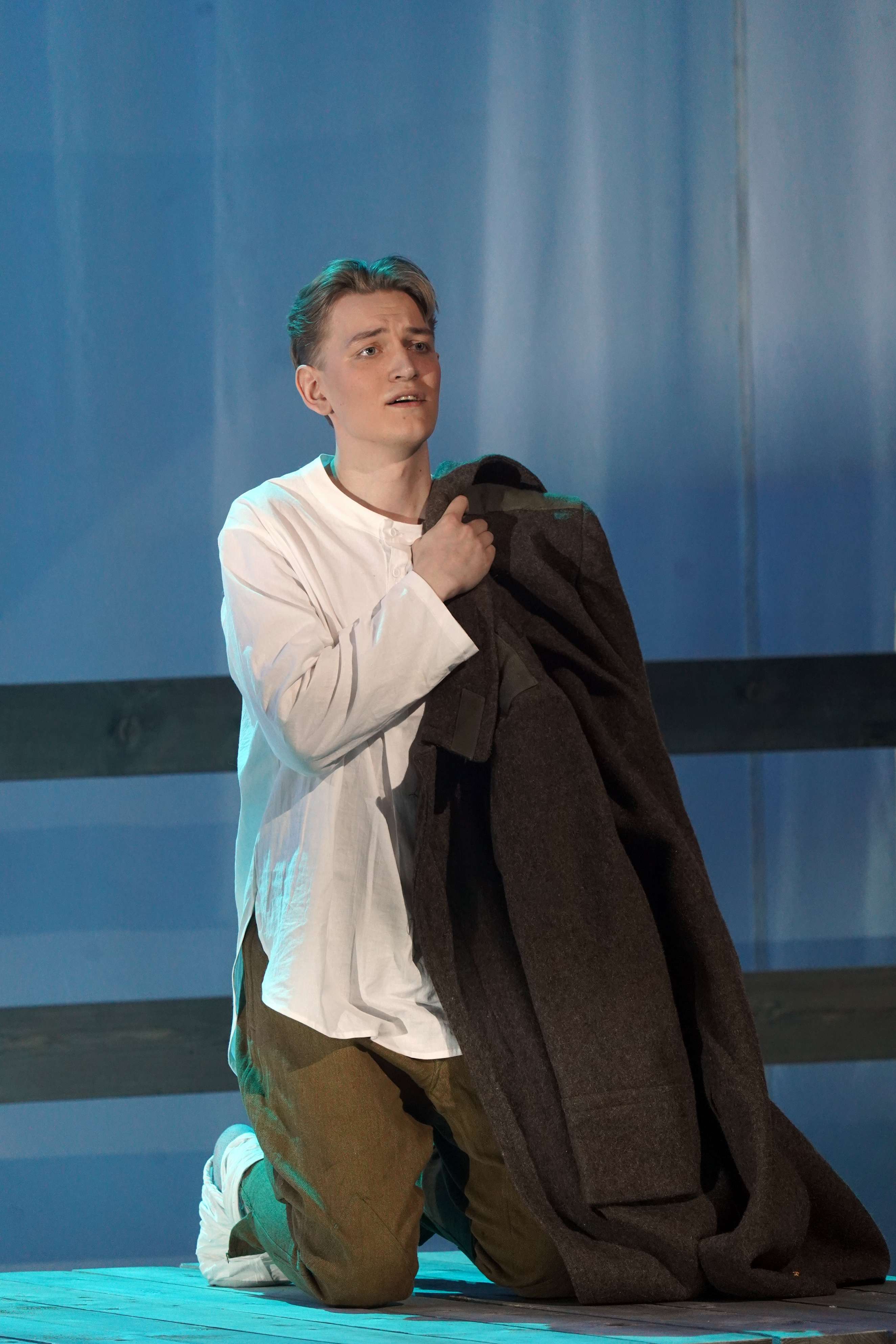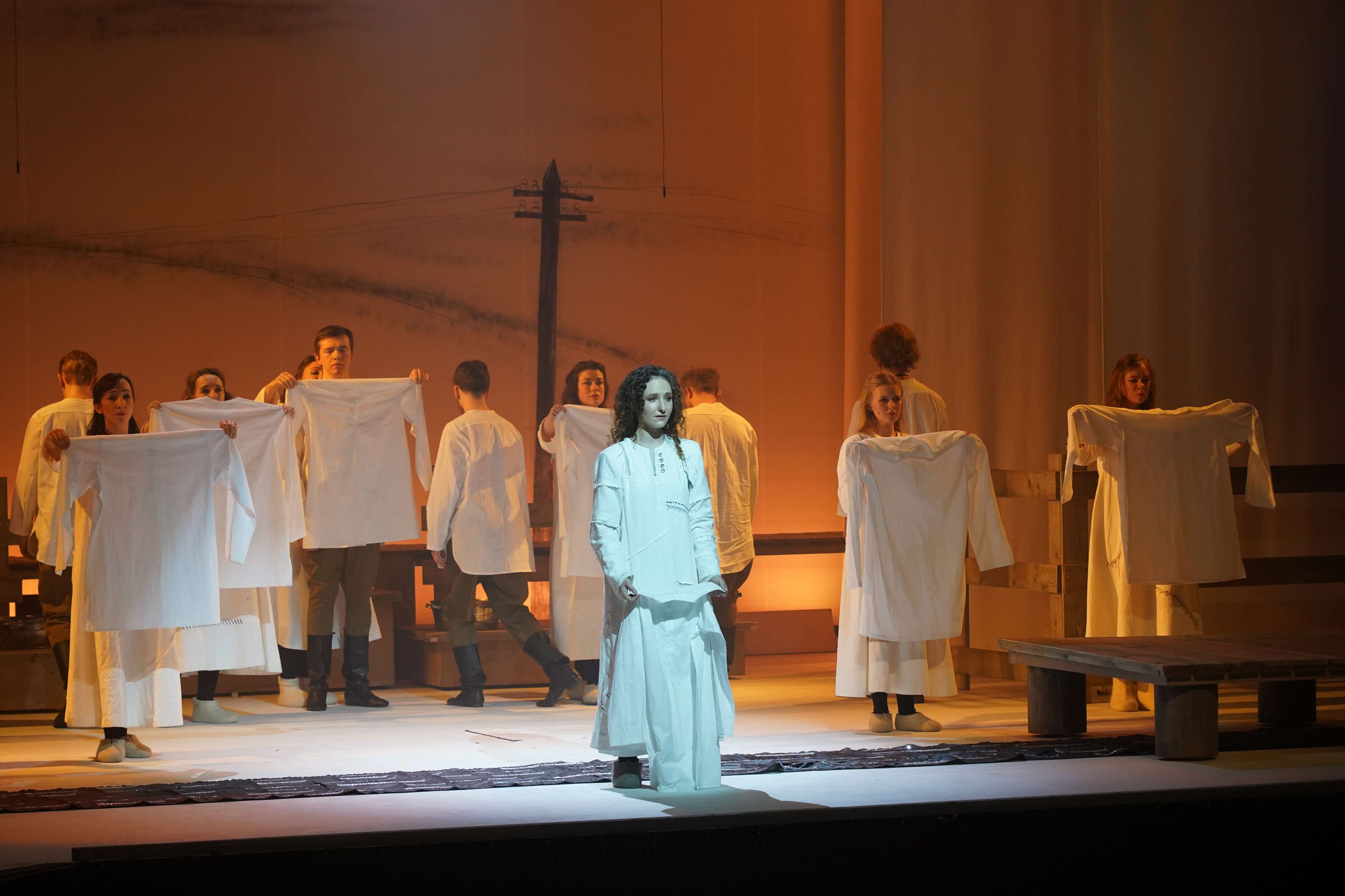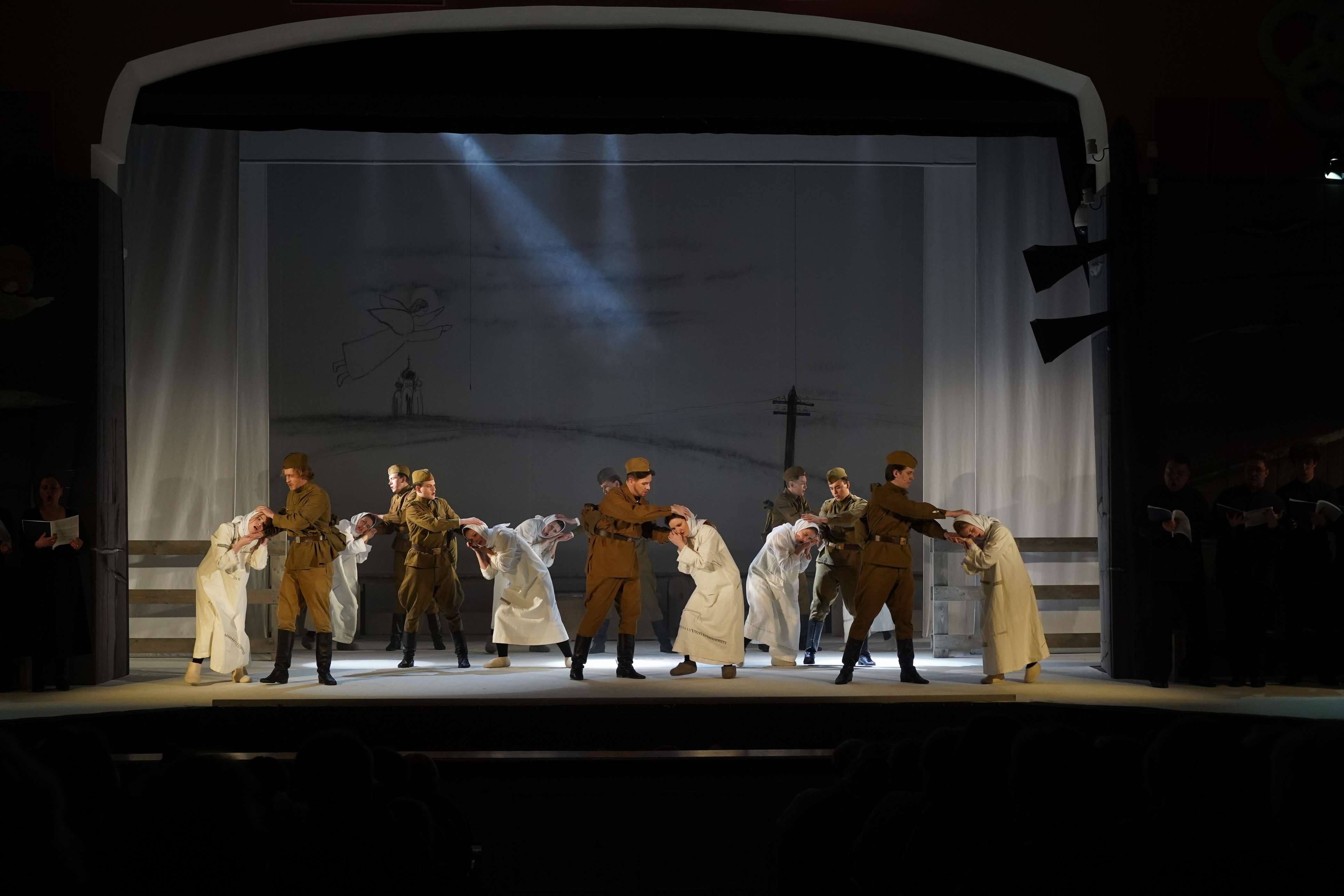 Песни в спектакле связывались одна с другой, подобно орнаменту на вышиванке или клеймам истории святых на иконе, рассказывая историю убитых надежд, разорванных любовей, превращения в ангелов, подготовке к встречам на небесах. Основанная на контрастных сопоставлениях тишины тыла, памяти мирной жизни и хаоса, кровавого абсурда и грохота фронта драматургия спектакля рождала полотно, в котором милые реальные сценки ритуалов, поданные, словно в дымке воспоминаний, обретали резонансы мистерии, страстей, соединяющих временное с вечным. С виду забавная «Дразнилка» с текстом «Ой ты, лихо-лиходей, лиходей, лиходей, не бросайся на людей» превратилась здесь в эпизод современного хоррора, где вместо голов у дразнящих детей оказались картонные коробки с жутковатыми глазищами. Чуть позже эти монстрики в акапельной песне «Пошел солдат» под мерные, глухие удары барабана будут подходить к не успевшим пожить солдатикам, один за другим, как по списку подкашиваемым пулями. «И ничего солдат не видел, а только видел лишь одно: жены багряный полушалок, ее счастливое лицо». В «Скажи, скажи, голубчик, скажи, кудрявый чубчик» лучезарное соло Ольги Васильевой завораживает своей девичьей силой, ищущей потерянную любовь. «Кудрявый чубчик» просыпается где-то вдалеке, отвечая «Нигде я не живу и песен не пою, я все думаю, думу думаю, никак я не усну», к чему подключается девичий ансамбль. Песня «Милый мой дружок» с ее сладкой, безмятежной, полной покоя мелодией дуэта влюбленных, в упоении исполняемых Елизаветой Майдановой и Семеном Фаттыховым с идеально найденной интонацией союза двух сердец, прерывается грубым вторжением смерти и мертвой паузой. После нее не могло быть другого номера, как «Почтальонка», с пронзительным меццо-сопрано Анны Смирновой, а после – грандиозная «Молитва» с зачином в виде знаменного распева, звучащего с закрытым ртом, но с каждой строкой вырастающая в плач тысяч о невинно убиенных. Сергей Ваганов здесь продемонстрировал феноменальный спектр своих уникальных драматических возможностей, декламируя на фоне хора «Зачем печалишься, душа моя»: «Не соревнуйся с лукавым. Не завидуй творящим беззаконие, ибо лукавый будет истреблен и не будет грешника. Избави меня от творящих беззаконие и от мужа крови спаси меня, ибо уже уловили душу мою. Скор будь, о, Утешитель, всемилостивец, не медли». В этом хоре пели солисты театра разных положений – от первачей до ансамблистов, соборно молясь о спасении на земле, этот мир утратившей, и театральная сцена оказывалась посильнее самых крепких стен храма.