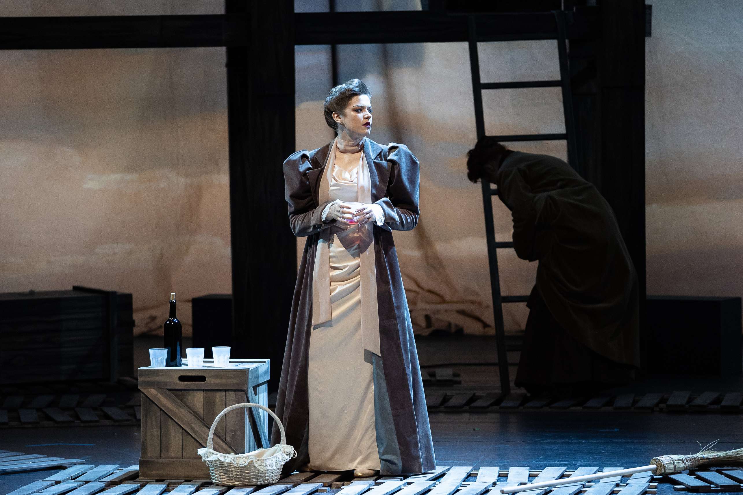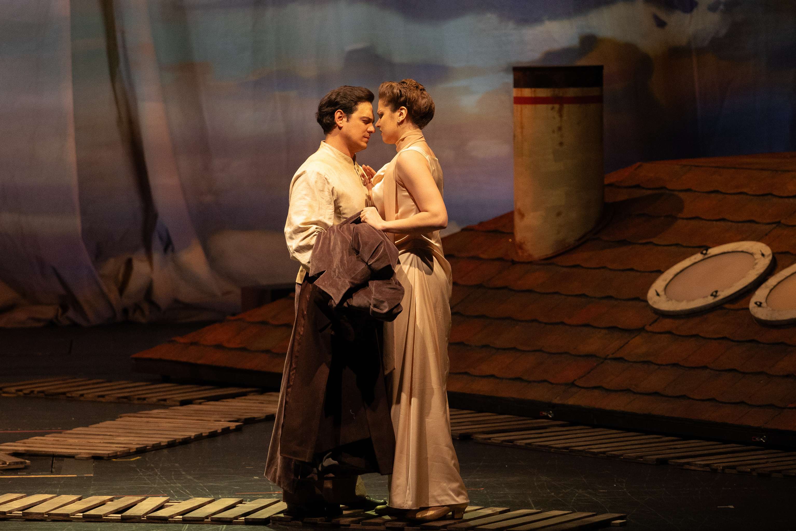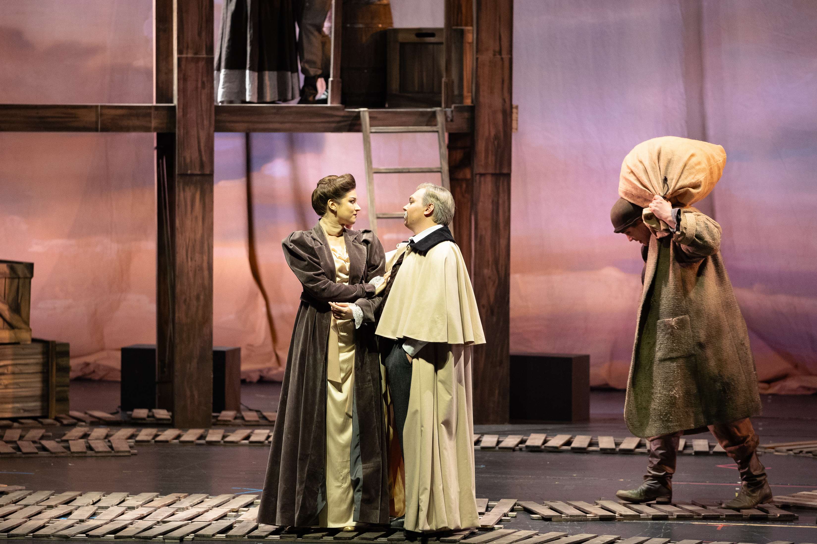 Если сценография Кутузовой скорее разочаровала, то юная художница Манакова (она тоже еще студентка ГИТИСа) нашла для двух первых опер адекватные и красивые решения. В «Плаще» это разбросанные по сцене деревянные мостки, на которых неуверенно балансируют герои зыбкого мирка натуралистичной пьесы Дидье Гольда (именно по ней делал либретто Джузеппе Адами), а также крыша затопленного дома – так художница изобразила баржу Микеле и Жоржетты: как аллегорию их навсегда ушедших под воду счастья и взаимопонимания. На заднике – огромный занавес, полный закатных красок, ярких и умиротворяющих, а потому обманчивых: когда Жоржетта обнаруживает под плащом труп своего возлюбленного Луи, Микеле срывает этот занавес, оказывающийся всего лишь бутафорией, как и их давно утраченная семейная идиллия, – на самом деле в их жизни давно царит холодная, темная, безрадостная и бесперспективная ночь. Костюмы героев (Стефания Филатова) говорят о начале прошлого века – благодаря этому спектакль воспринимается как классический. Режиссеру Дашуниной удалось создать напряженное действие, увлекающее своим ходом и цепко держащее внимание публики, подробно поработать с актерами над образами, каждый из которых колоритен. Особенно удались эпизодические характерные персонажи – Тинка (Никита Шаров), Тальпа (Ренат Латыпов), Фругола (Анна Костенко). Триада первачей убеждает вокально-драматическими решениями: богатое и сильное сопрано Евгении Бумбу (Жоржетта) – находка для веристской драмы, мощный баритональный тенор Ивана Волкова (Луи) идеален в воплощении раздирающих героя страстей, баритон-хамелеон Романа Николаева (Микеле), умеющий быть то сдержанно деликатным, то страстным, то мстительно холодным, – попадание в образ обманутого мужа-ревнивца.