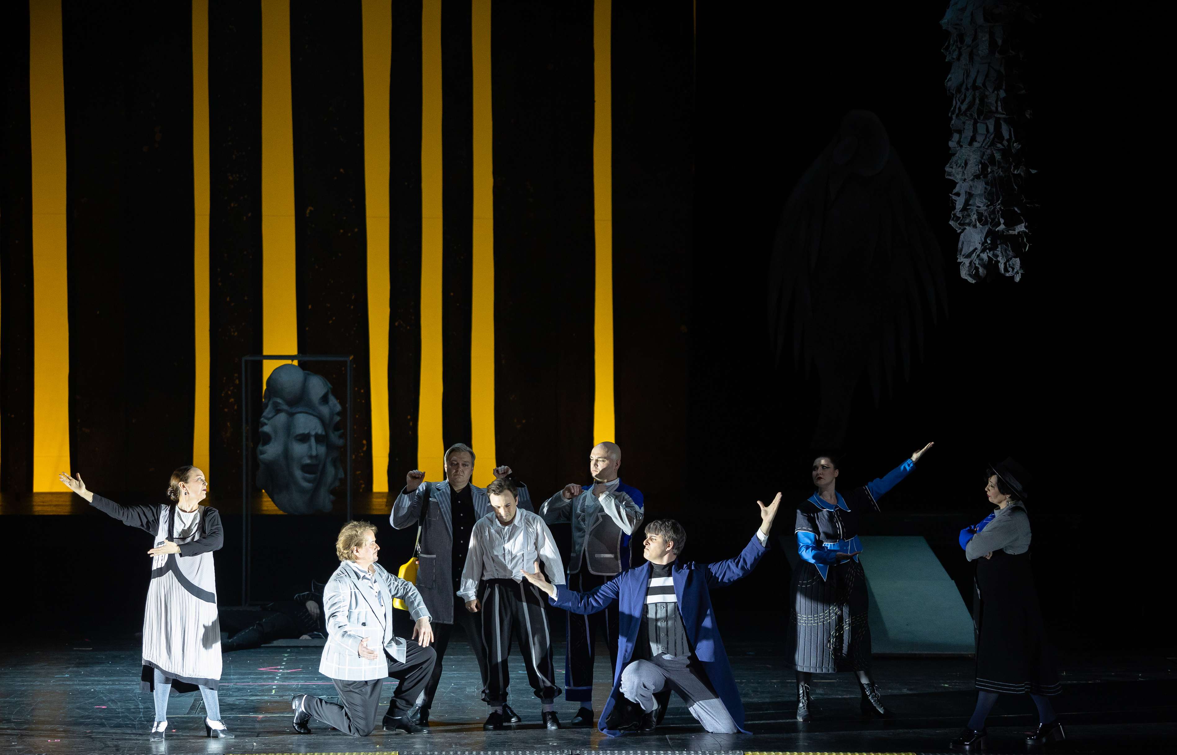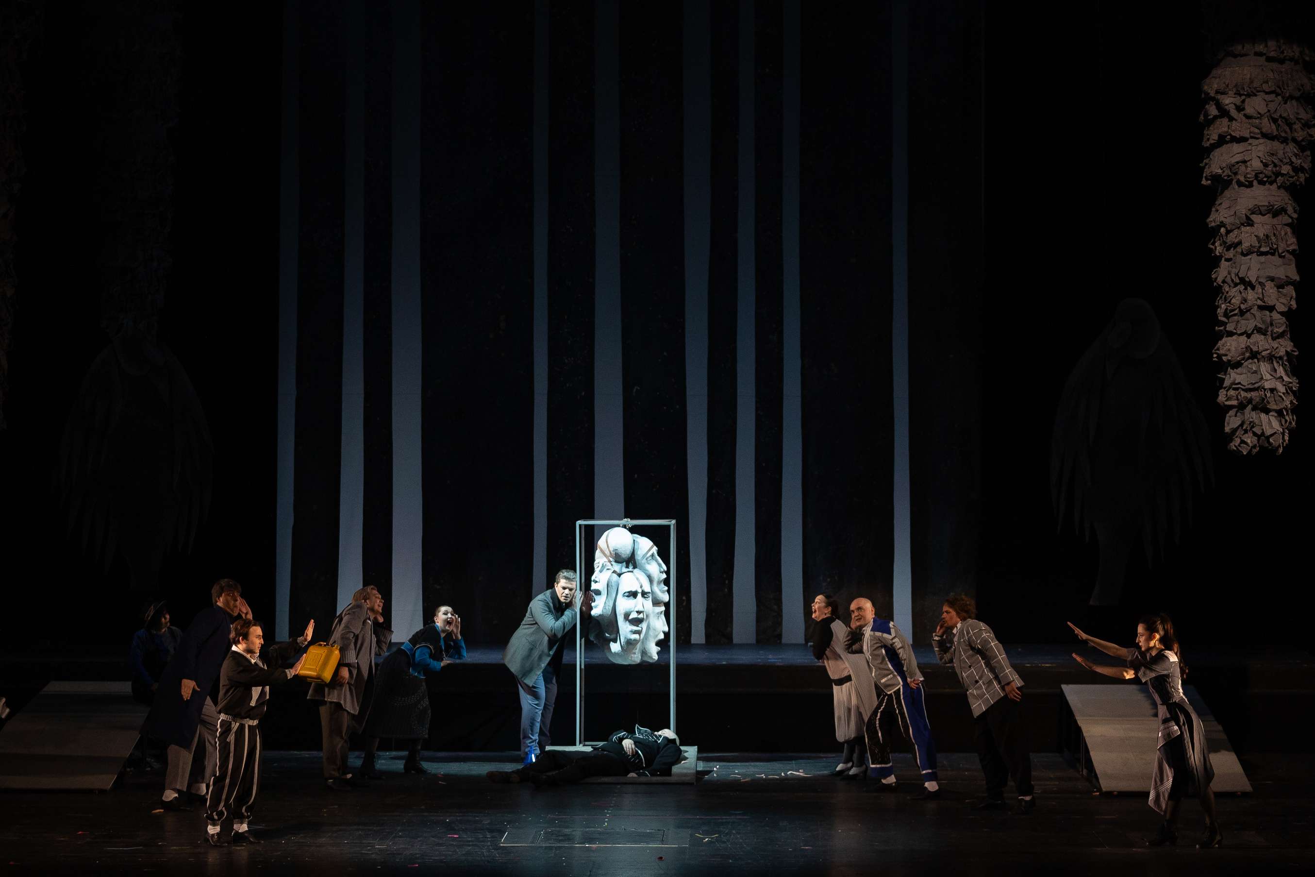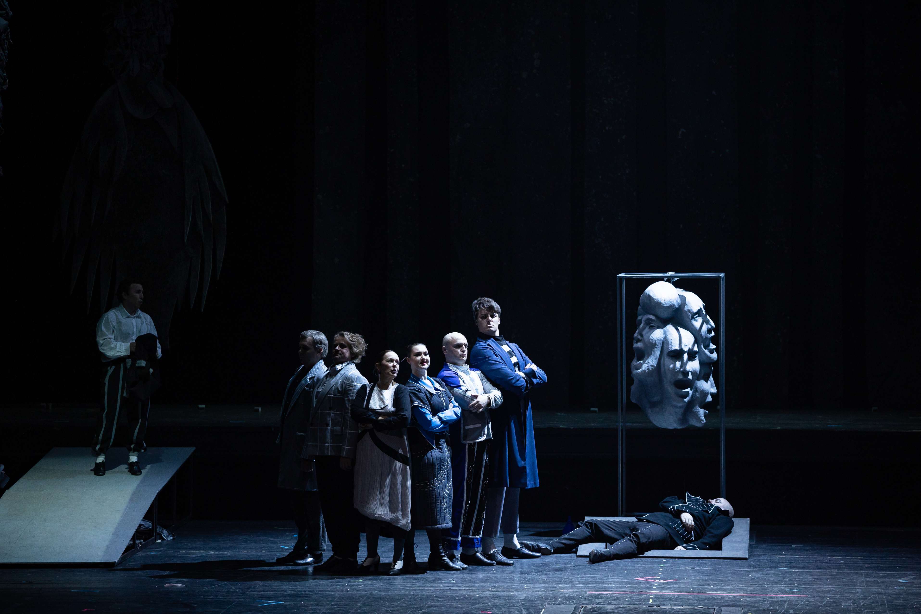 «Джанни Скикки» (начнем с него, поскольку хронологически это первый спектакль триады) режиссер Бахшиева делала со сценографом Василисой Кутузовой (она же создала костюмы, свет и видеоконтент). Оформление спектакля – пожалуй, самый разочаровывающий его компонент. Действие оперы, согласно либретто Джоваккино Форцано, происходит в ренессансной Флоренции, о которой лирический герой повествования Ринуччо восторженно поет в своей арии «Флоренция, как цветущее дерево». Но вместо золотисто-пастельного солнечного города на берегах Арно зритель видит унылое серо-черное пространство, почти пустую сцену, с колосников свисают серые «сталактиты» неясного предназначения, в центре же размещена некая ниша, по-видимому, один из кругов Дантова ада, куда должны угодить и уже почивший Буозо Донати, и его алчные родственники, и хитроумный плут Скикки. Идея считывается, но ее воплощение навевает скуку. То же касается и антиэстетичных, попросту уродливых костюмов сине-серо-черной гаммы: видимо, художник хотела показать душевную убогость героев, но, кажется, выявила отсутствие вкуса и чувства меры. Депрессивное оформление комической оперы – это, бесспорно, новое слово в российском театре. Если бы не остроумные находки видеоконтента (например, символы евро – в ожидании наследства и гигантская фига – при обнародовании завещания), было бы совсем невмоготу.