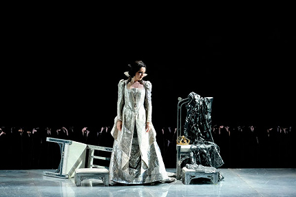 Минималистская абстракция сценографии Пола Брауна с признаками психологически емкого символизма и его же потрясающе зрелищные костюмы, на историческую достоверность не претендующие, в единении с довольно креативной «партитурой света» Джузеппе Ди Иорио фактически создают лишь весьма эффектную semi-stage оболочку, в которой всецело завораживает живая правдивость мизансцен (режиссер возобновления – Микеле Ольчезе).