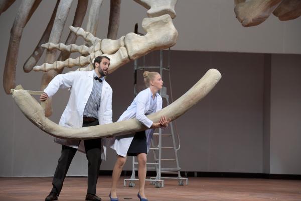 Музей наличествует в постановке Джима Люкассена и Доротеи Киршбаум в буквальном смысле слова: все три акта лирической сказки происходят в залах краеведческого музея. Тут и витрины с чучелами животных, и огромный скелет ископаемого ящера, а на стене – прекрасная картина, иллюстрирующая природные красоты окрестных земель. Неподвижная белокурая девушка на ней вдруг оживает и оборачивается сказочной русалкой, перешагивающей раму полотна и ступающей в мир реальных людей. Пристально вглядывающийся в ее лицо на картине красивый молодой мужчина – сотрудник музея, в грезах о счастье ожившей русалки превращающийся в прекрасного Принца. Мир сказки и мир реальных людей с помощью этого хитрого режиссерского хода переплетается причудливым образом, и актуализация не кажется нарочитой и бессмысленной, по крайней мере, жесткие реалии современности вторгаются в романтическую атмосферу сказки не столь болезненно, как это могло бы быть. Противостояние природы и цивилизации, естественного и искусственного в предложенном варианте приобретает особую остроту, и перекличка с днем сегодняшним выглядит более чем уместной.